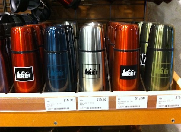 REI has another vast selection; less frills, more function. CamelBak, Nalgene, Klean Kanteen, Thermos, Siggs, Liberty Bottleworks, and all the accessories to go with. Sleeves, various top styles, slings, splash guards — your water bottle is good to go. The handsome REI-branded Thermos and the 64 oz stainless steel Klean Kanteen are the studs here.