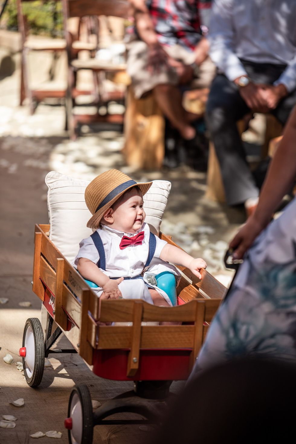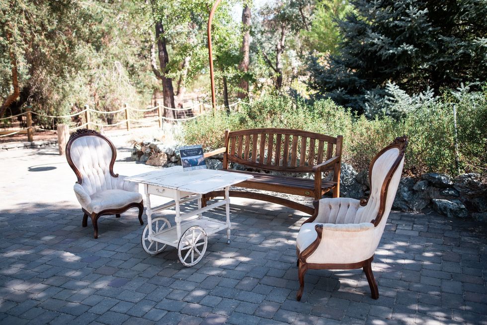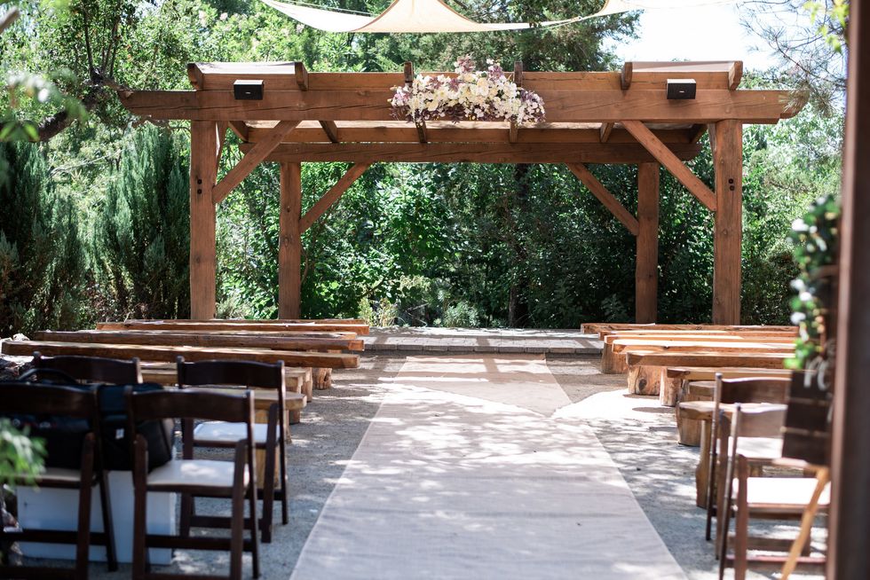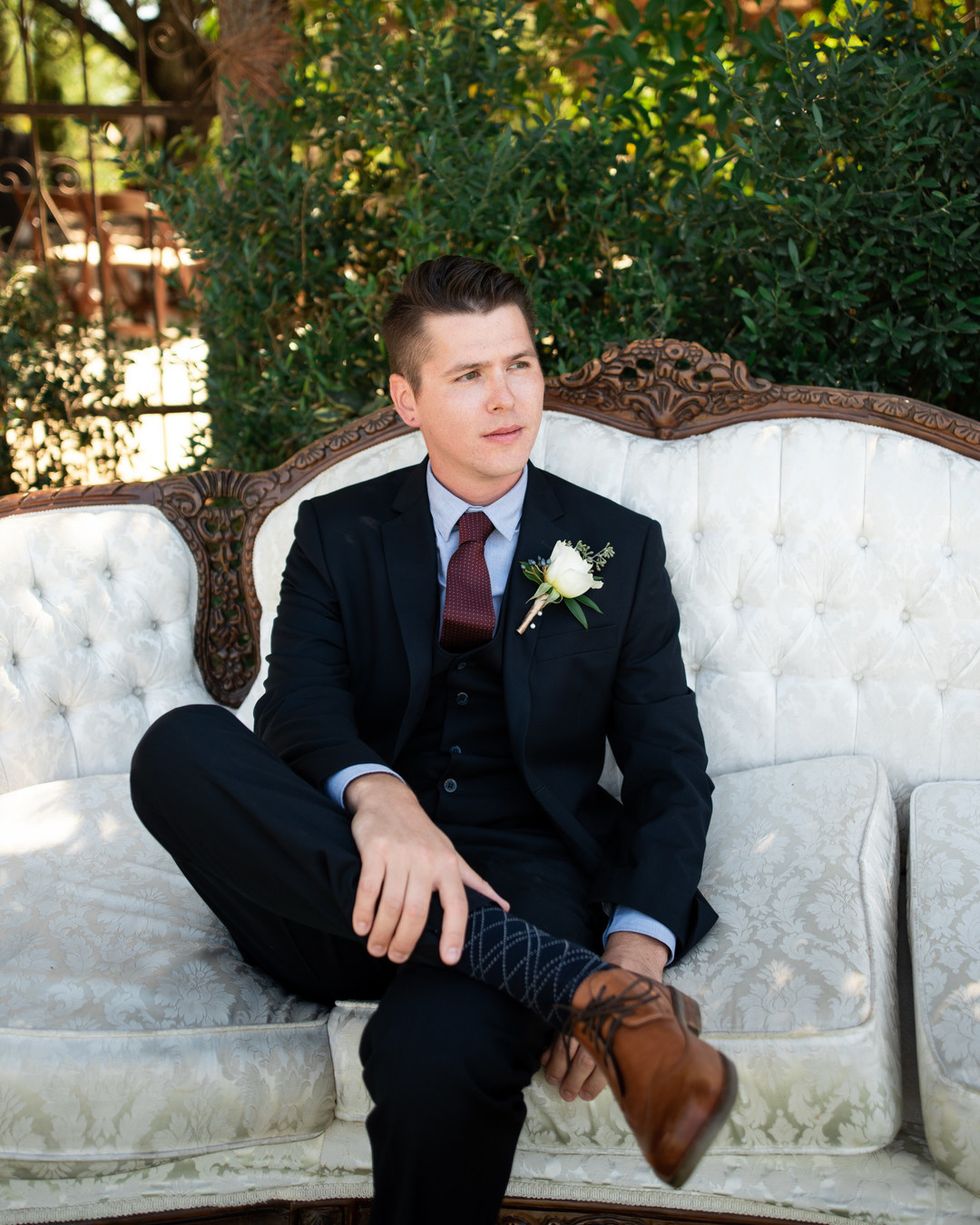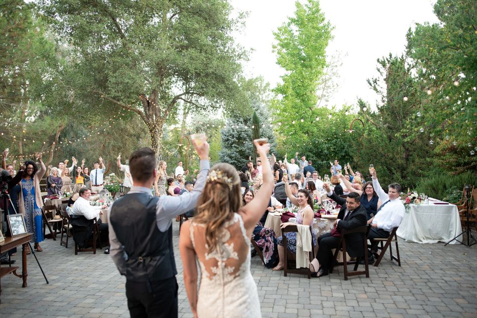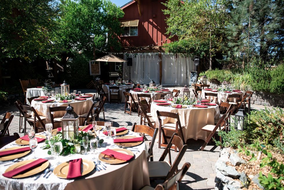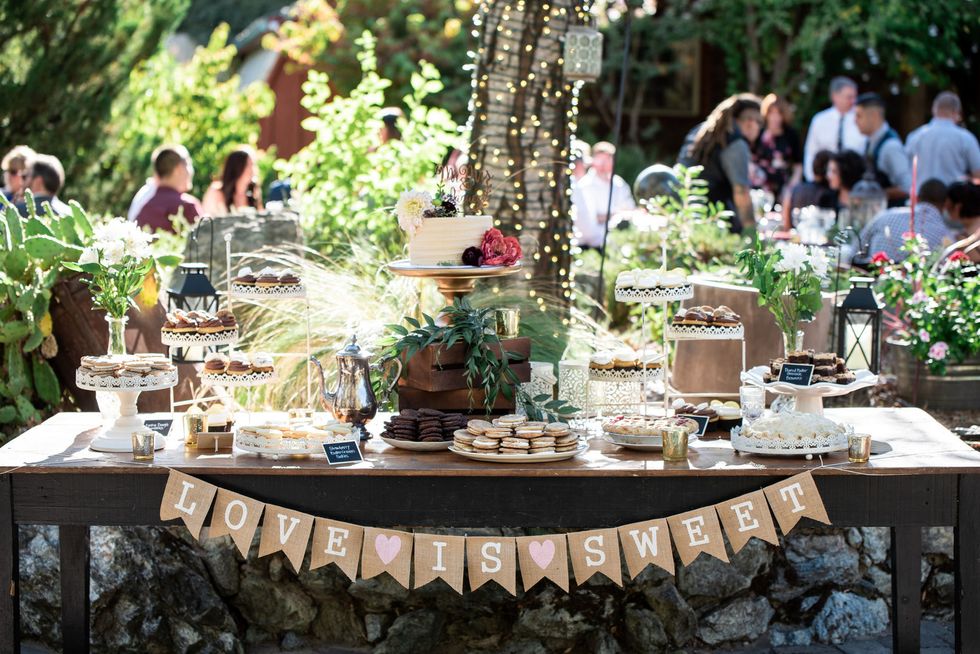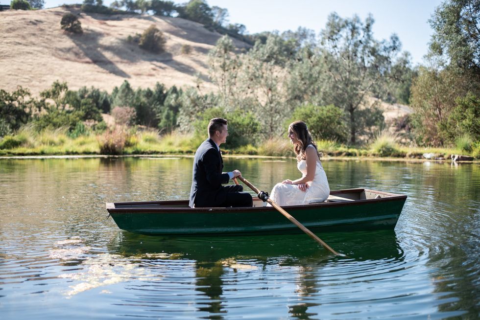 The pair landed on Placerville's Eden Vale Inn, where a serene pond complete with a rowboat, a cobblestone patio, grape arbor, and rolling hills made for an utterly romantic backdrop. To add some flavor of the 1920s, the couple decorated with vintage furniture; the bridesmaids wore beaded frocks, and the groomsmen donned three-piece suits. The bride herself was adorned in cascading lace.