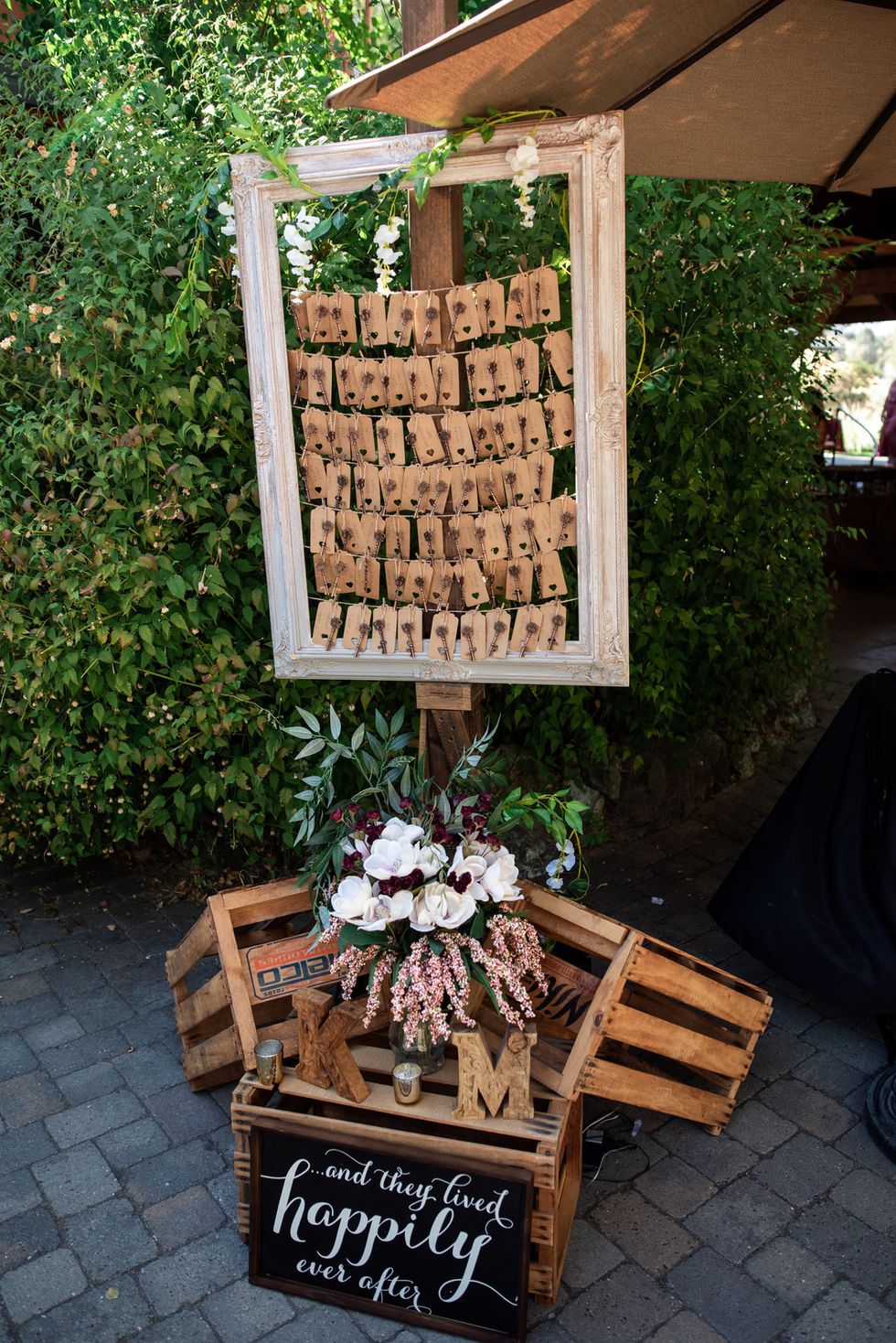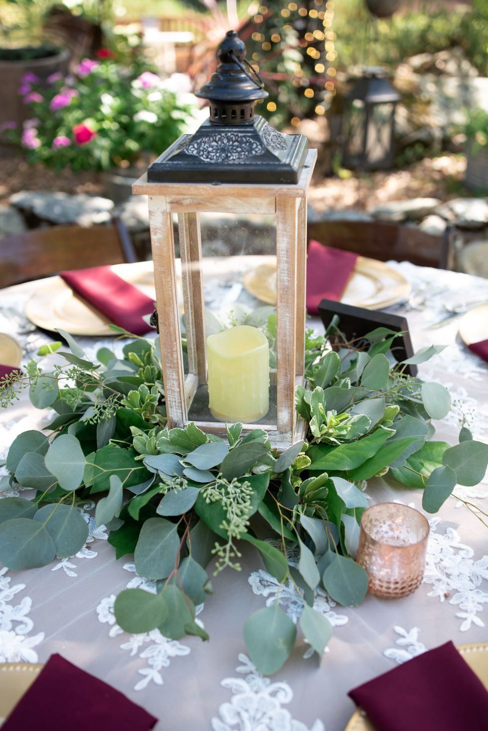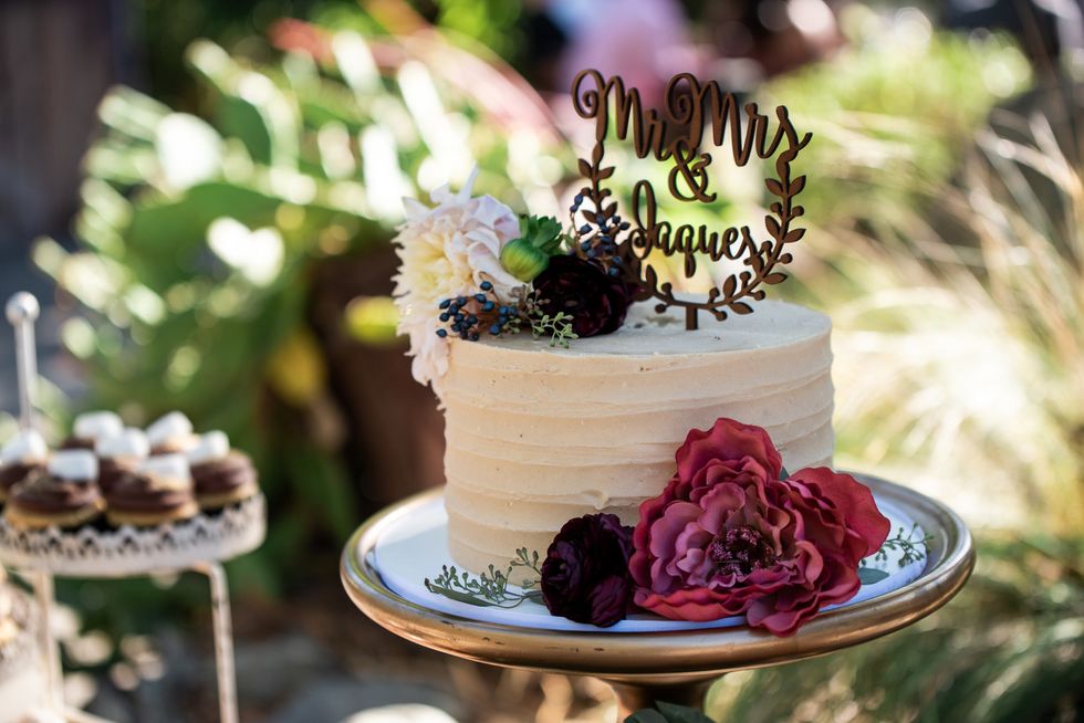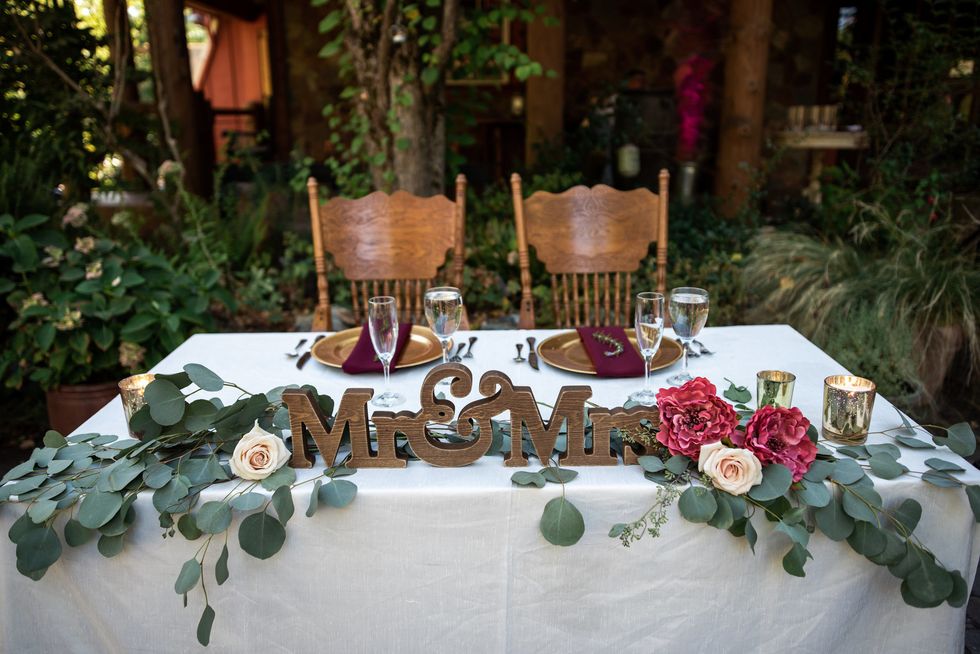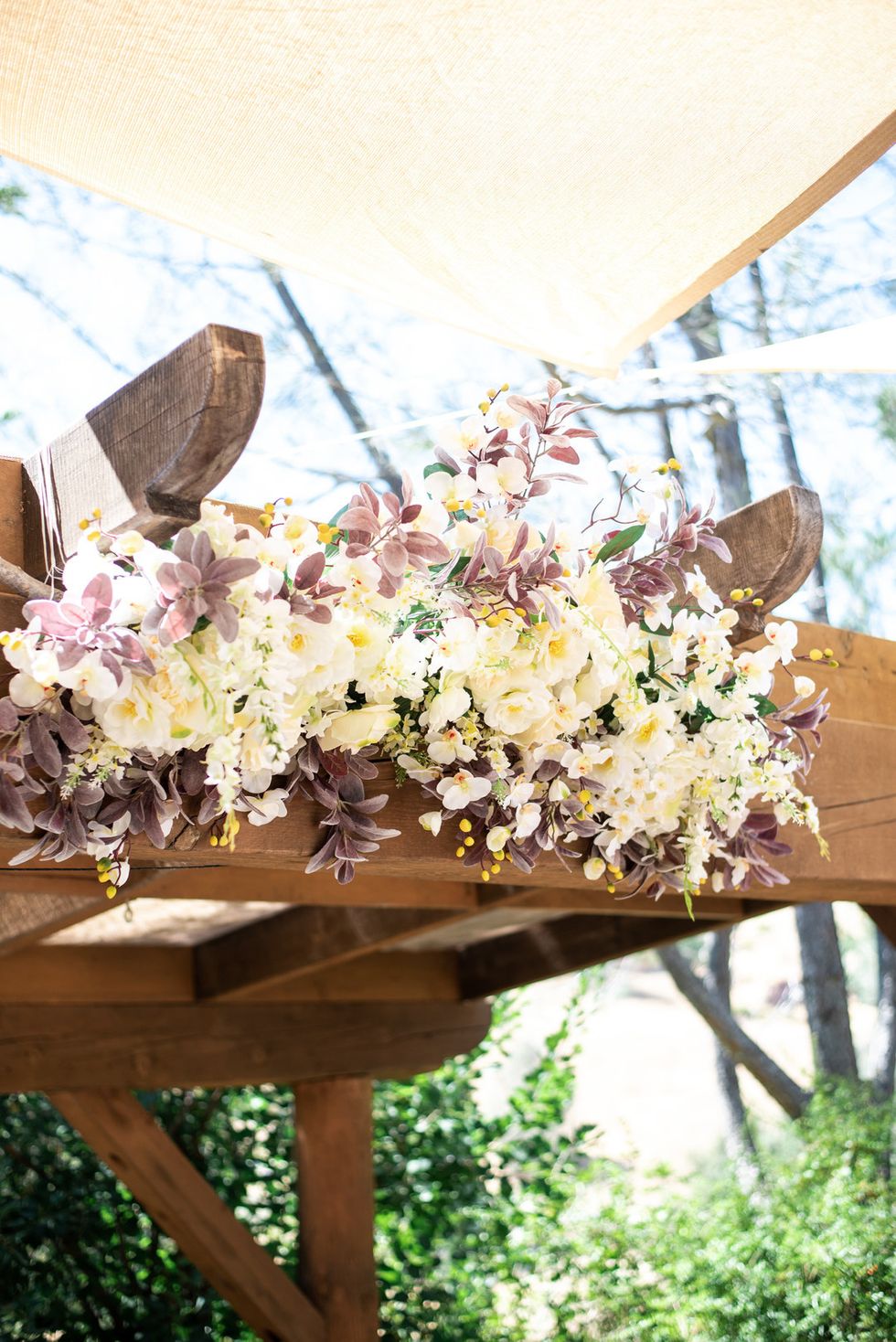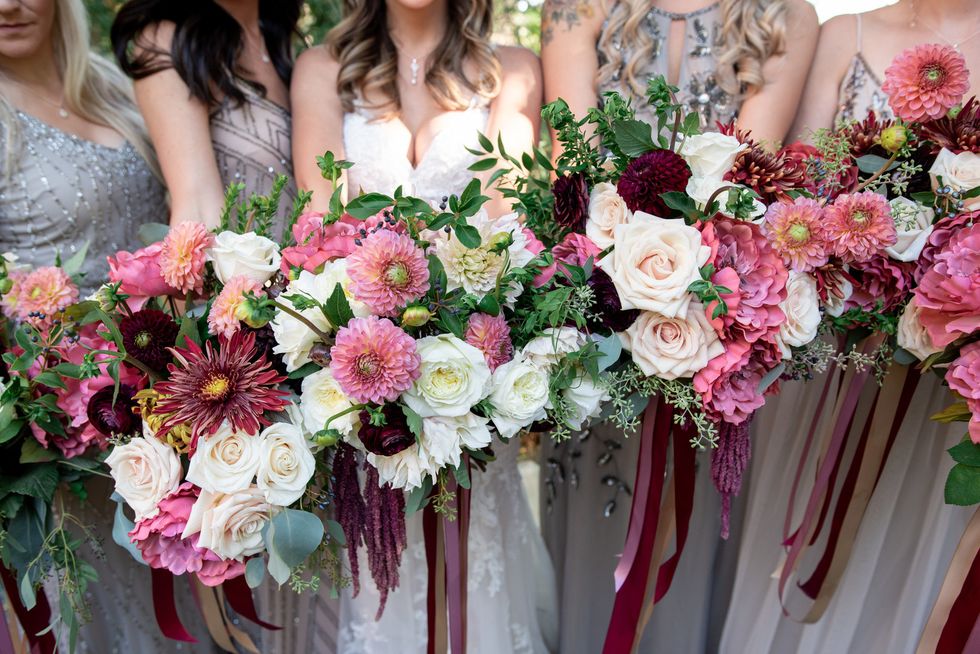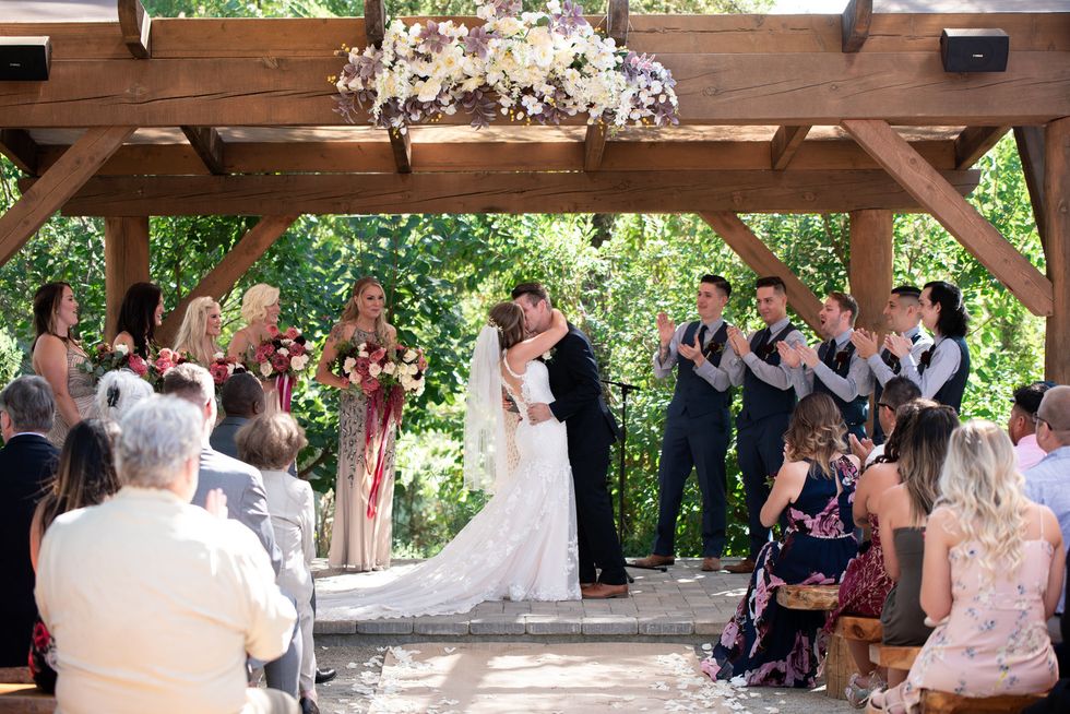 The florals were designed with pops of dusty pink, deep burgundy, and lush cream, accompanied by draping vines, eucalyptus, and gold ribbons; the wood arbor under which they were married was crowned in copious blooms.