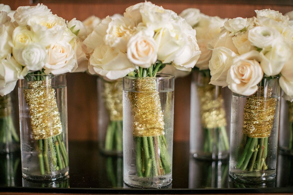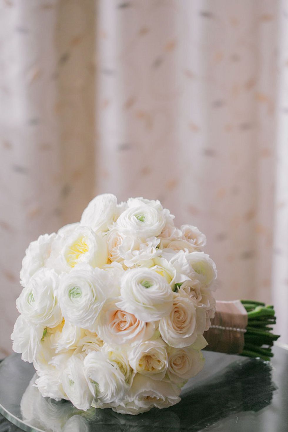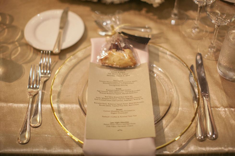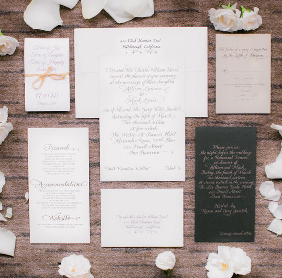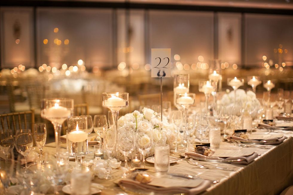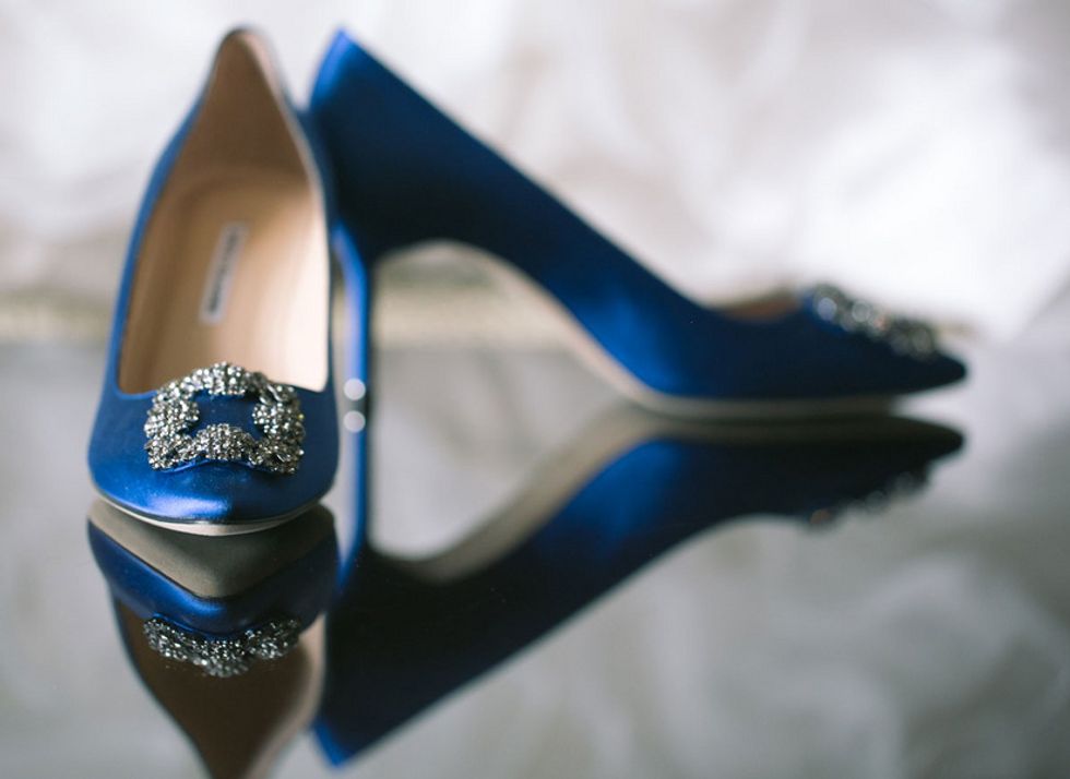 Ultra-romantic decor—chandeliers, lots of textures, muted florals, and gold accents—felt dreamy amid the color palette of feminine pearl and blush. The wedding party stepped out in dapper tuxedos and flowing floor length gowns as dark as night. Amid the black-tie cast a solitary pop of color peeped out from the bride's feet—you may recognize her Carrie Bradshaw–approved crystal-adorned sapphire satin Manolos.