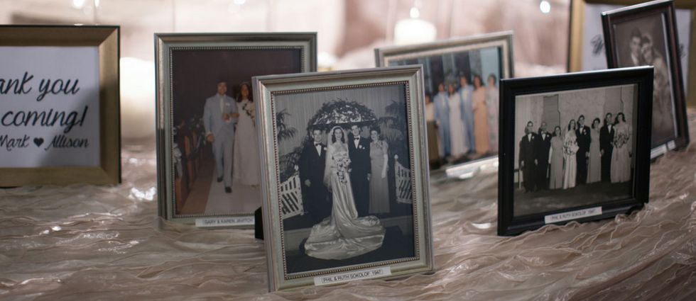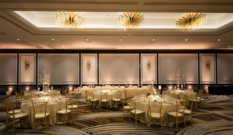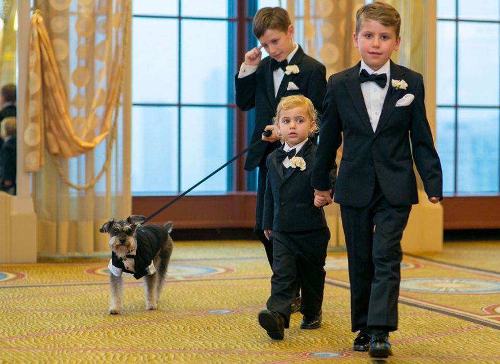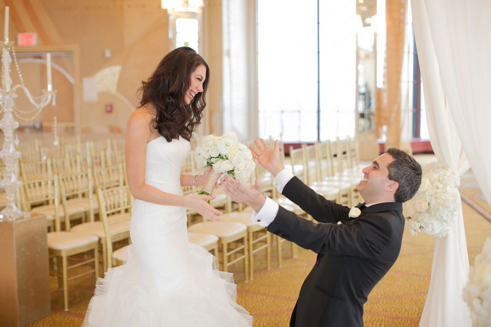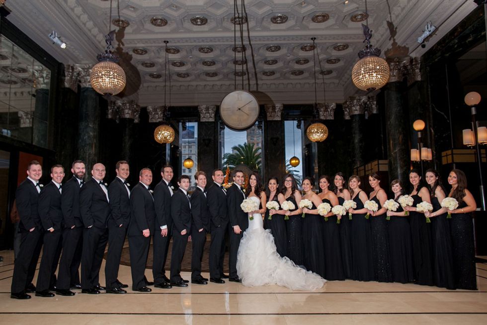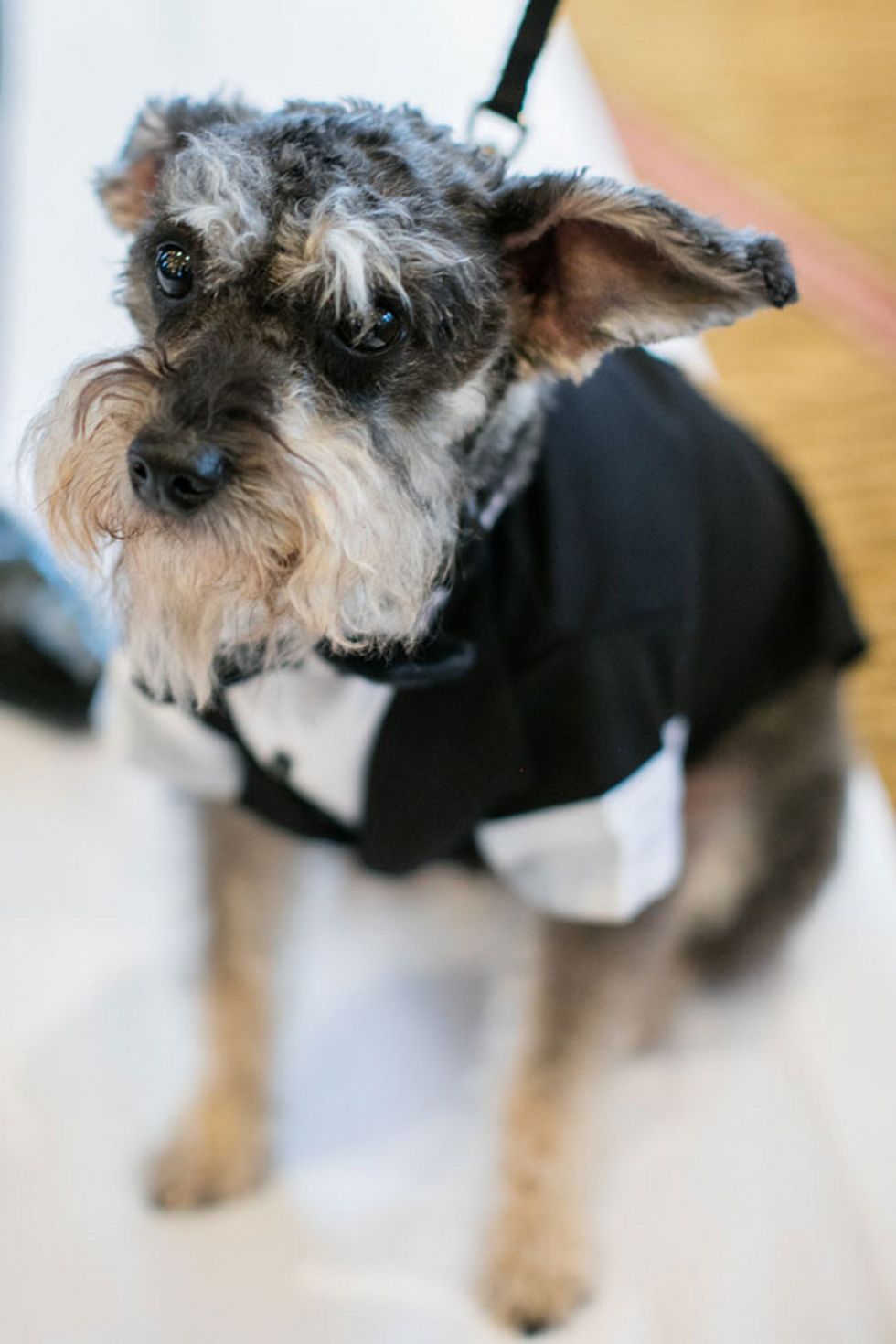 But the celebration wasn't all formalities: Their tuxedoed pup made an appearance at the ceremony and in family portraits; the groom comically collapsed at first look; and the newlyweds were caught kissing in the elevator. Sounds like a successful party, indeed!
