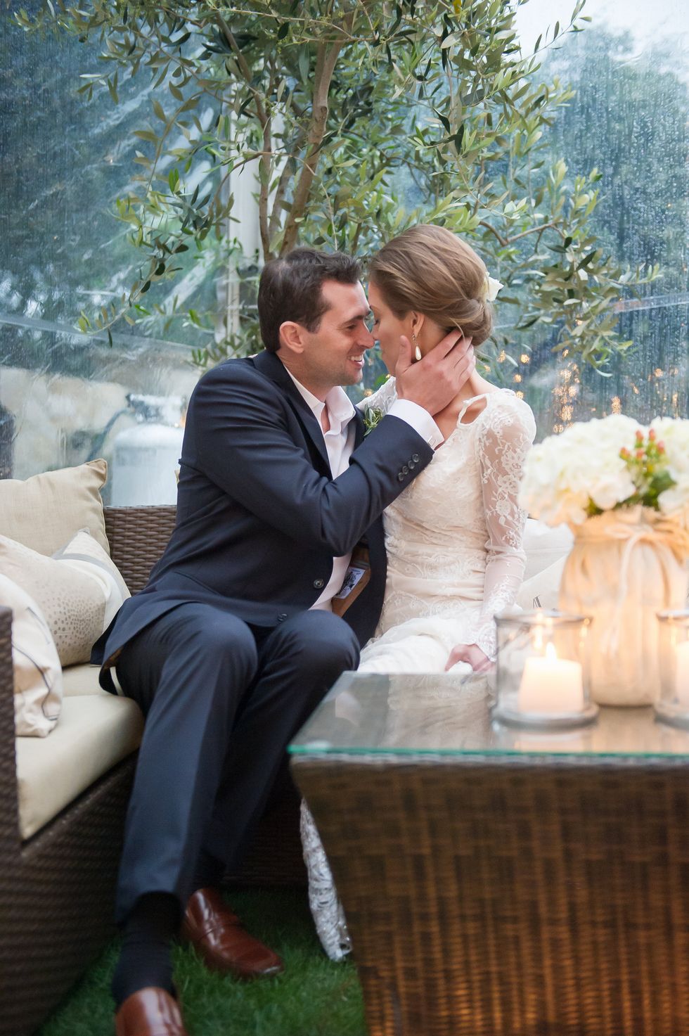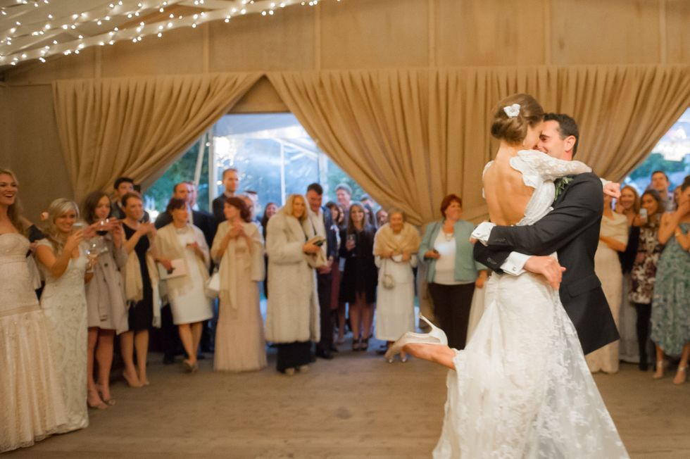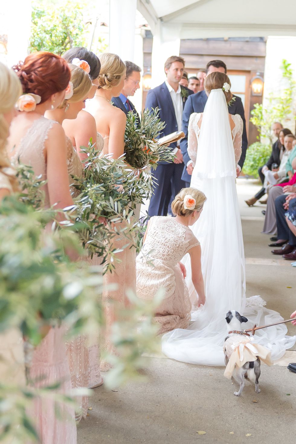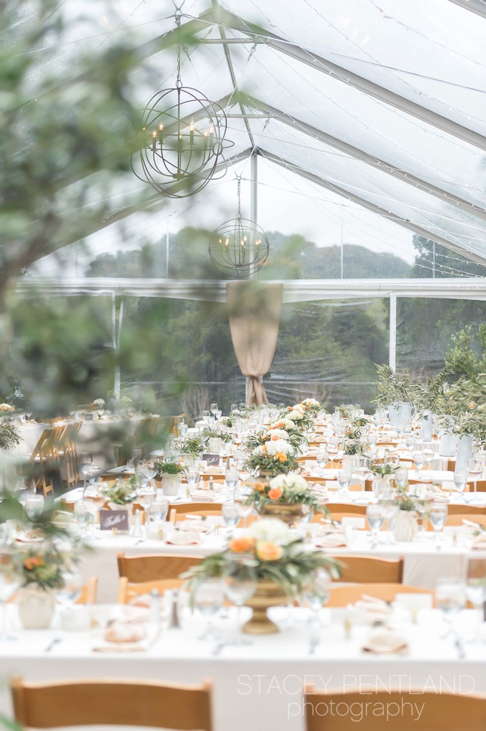 As Ashley began her descent down the aisle on that March afternoon, the rain began to fall on their guests and wedding party. The guests quickly found shelter in a reception tent that was filled with whimsical leaf garlands and elegant arrangements of white and coral flowers by Reina.