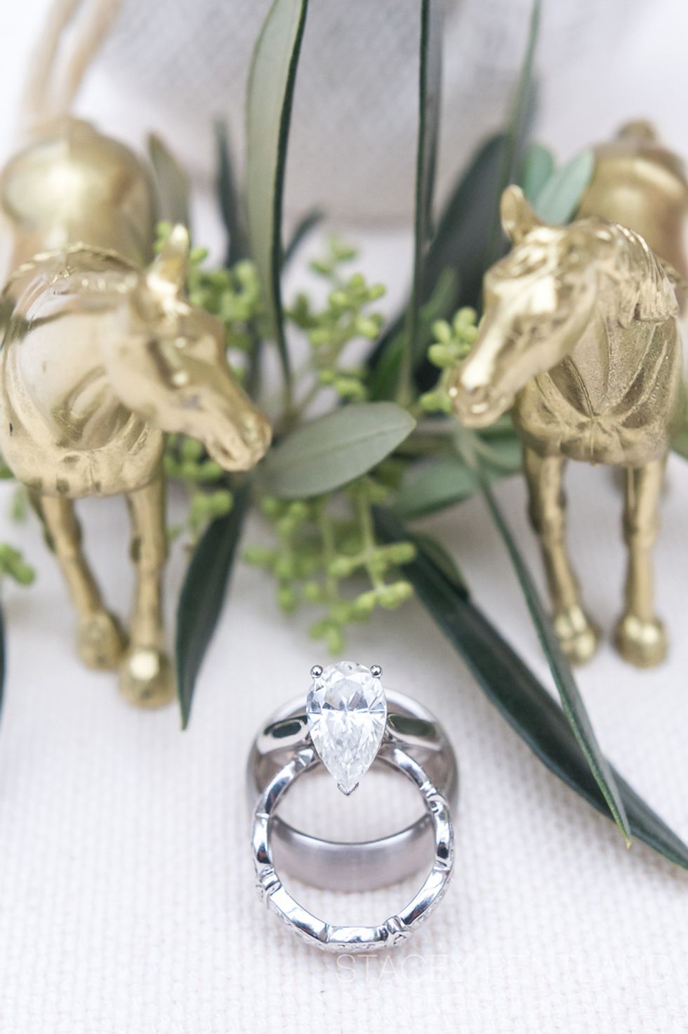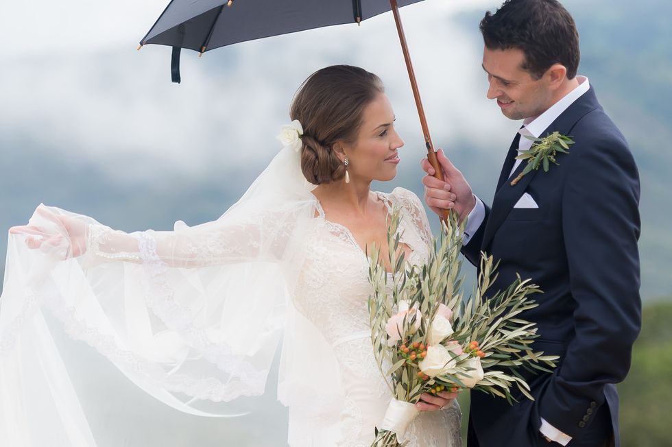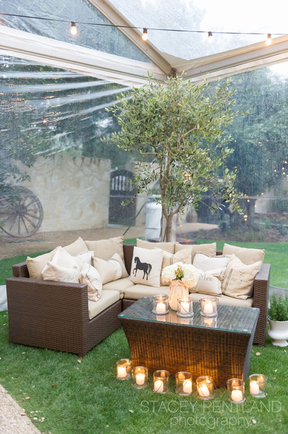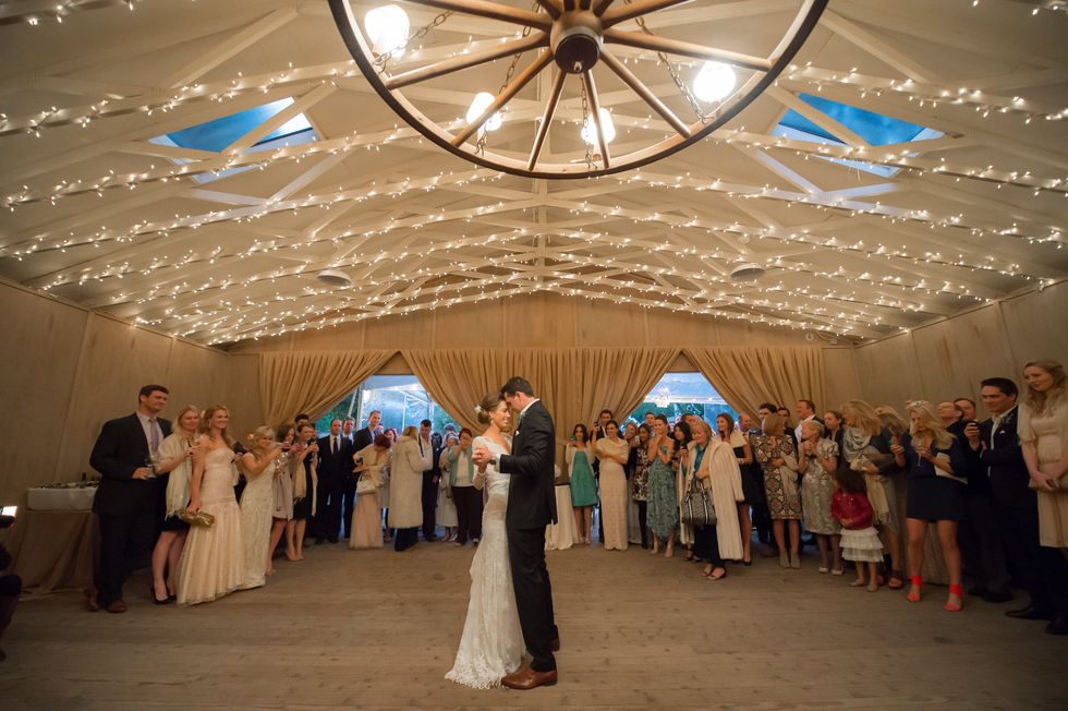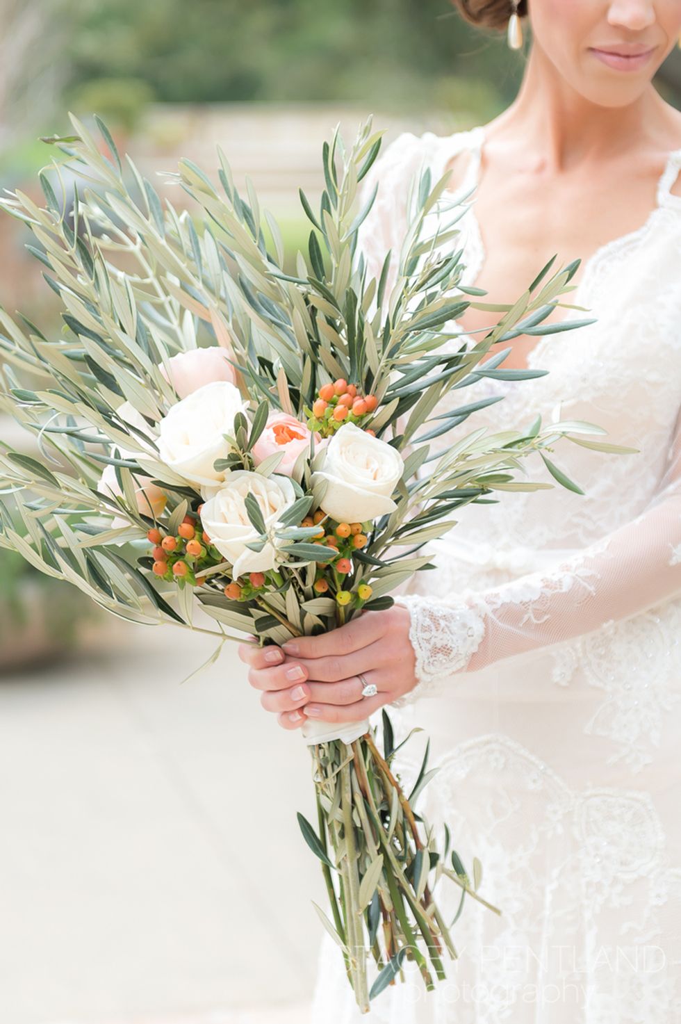 As Ashley began her descent down the aisle on that March afternoon, the rain began to fall on their guests and wedding party. The guests quickly found shelter in a reception tent that was filled with whimsical leaf garlands and elegant arrangements of white and coral flowers by Reina.
