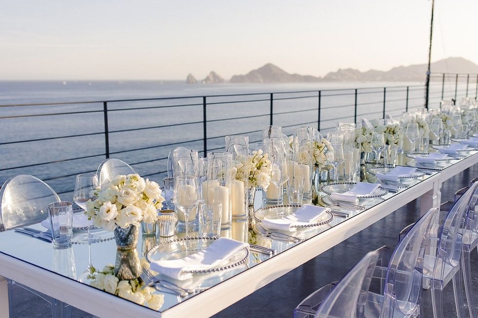 An elegant geometric arch garlanded in white flowers anchored the ceremony scene, and ghost chairs created a minimalist look, allowing the seaside landscape to shine—no need for any extravagant decor.
