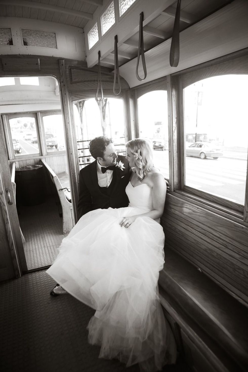 The bride and groom arrived in a private trolley, while guests were seated according to a vintage map of San Francisco – each table named after a neighborhood meaningful to the couple. In keeping with the local theme, the food was seasonal California cuisine, served with wine from the first winery Lauren and Zach visited together.