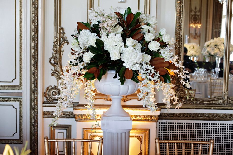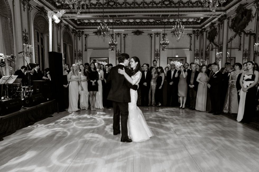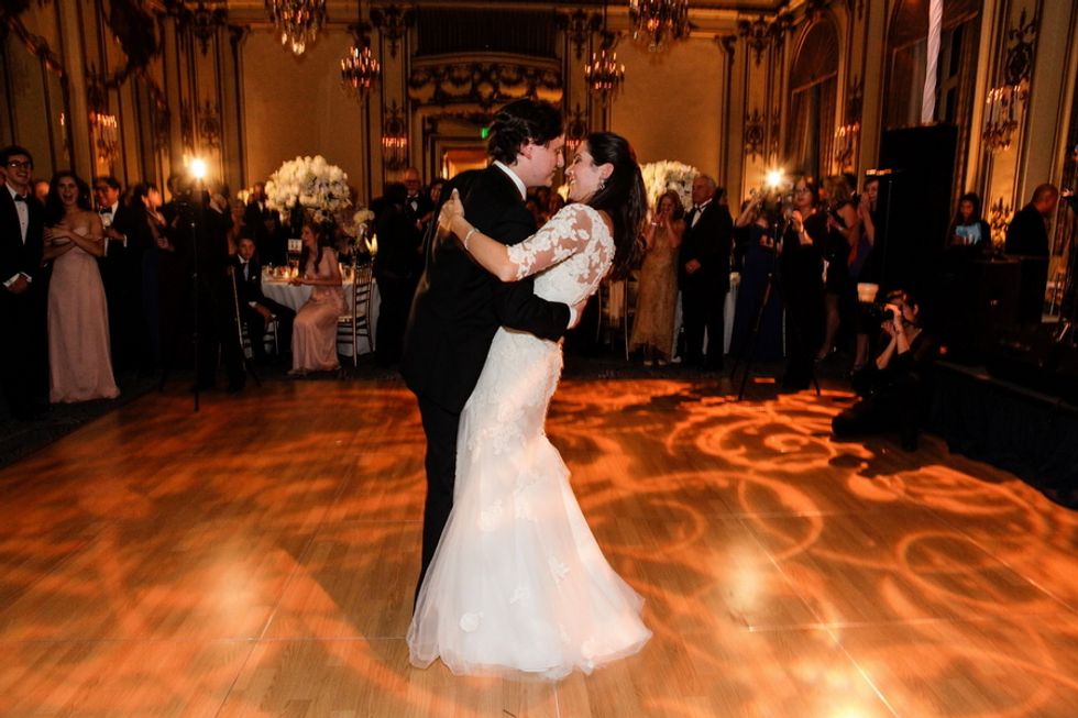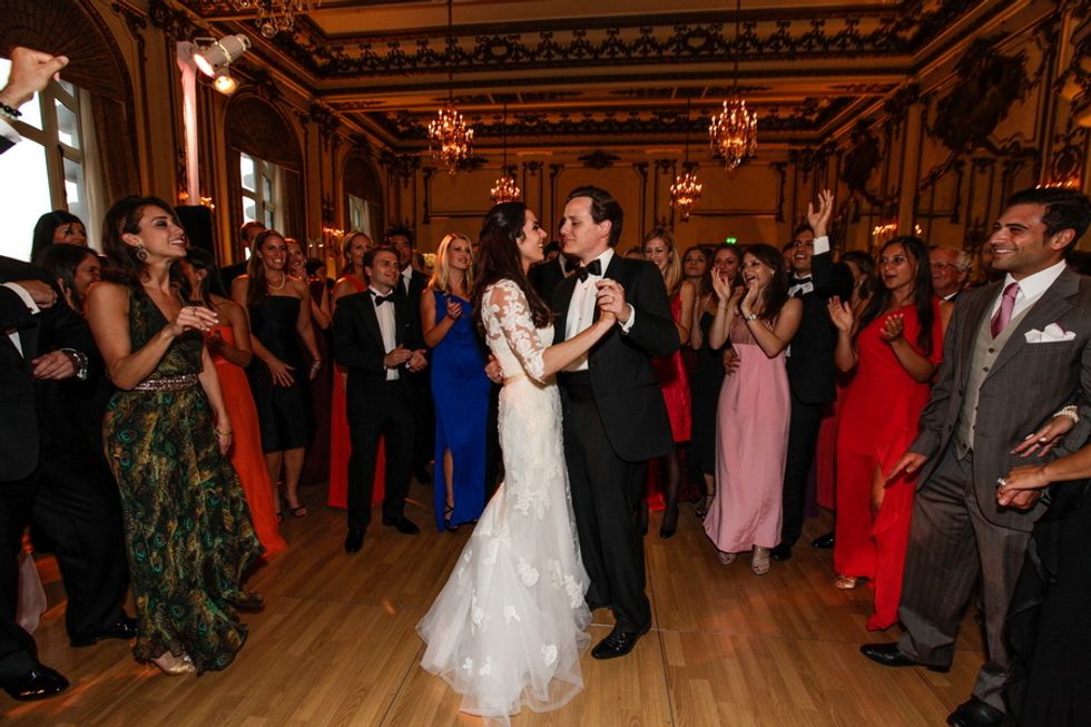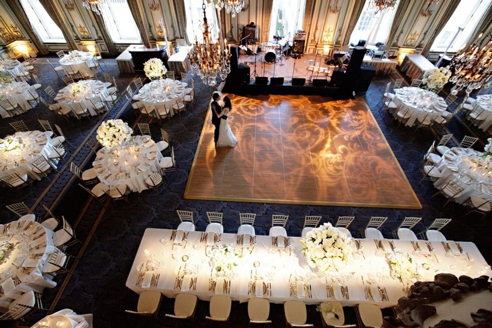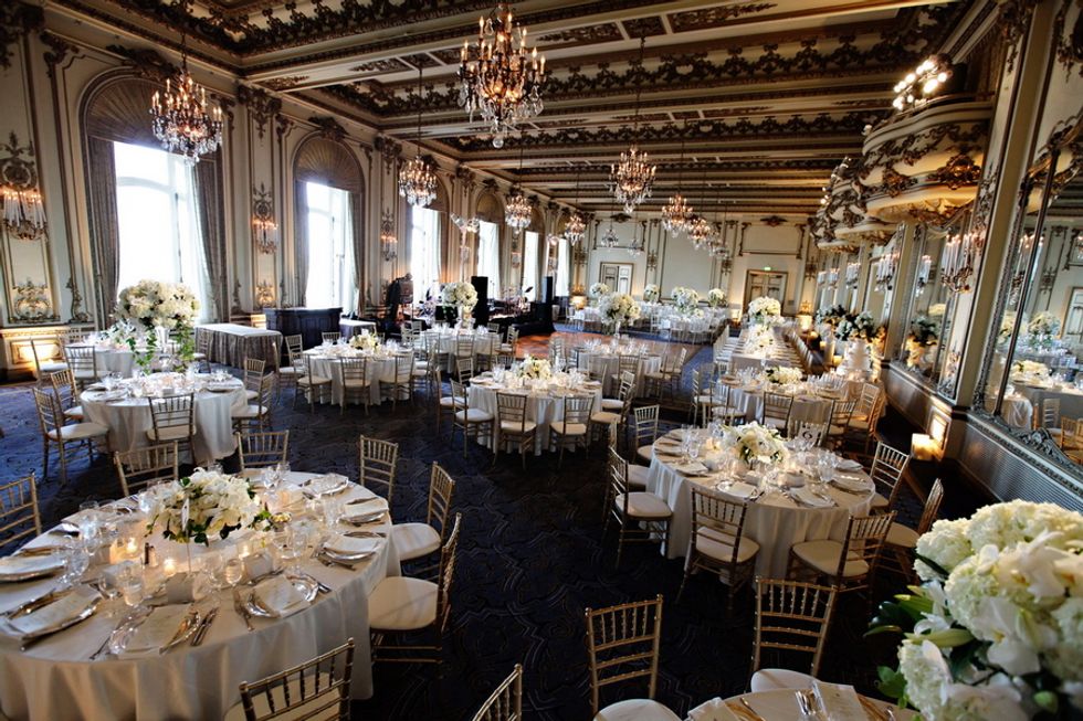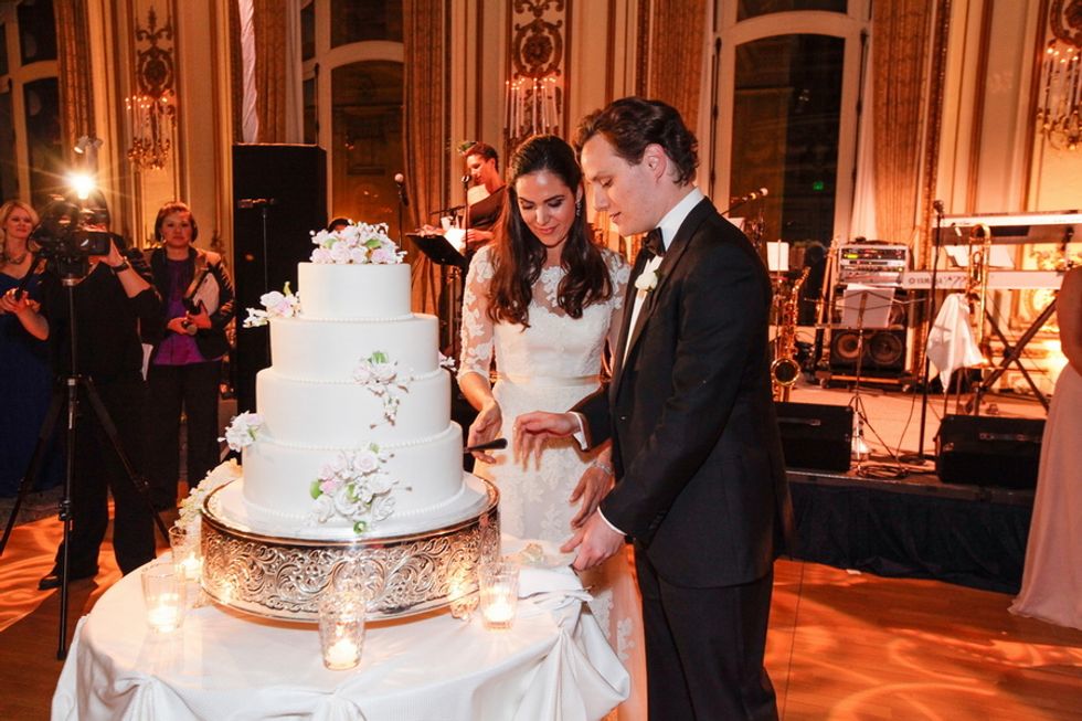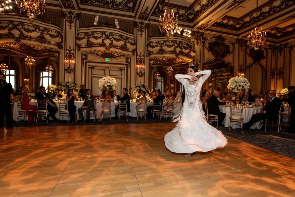 After the ceremony, guests ditched their black tie finery for cocktail-ready duds, and the wedding party made its way to the Fairmont San Francisco's garden terrace. As dinner began in the Fairmont's Gold Room, both fathers gave loving speeches amid the lush white flowers and mirrored walls. While family and friends dined, a traditional Armenian dance troupe entertained the guests with five folk dances. Then it was the bride and groom's turn on the dance floor, and they followed the first dance with many more Armenian and American hits.