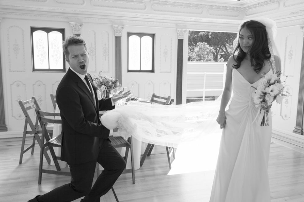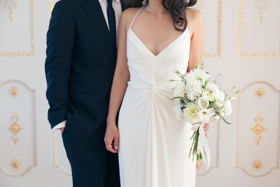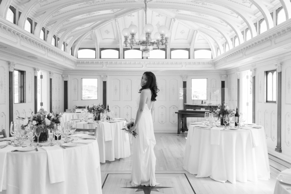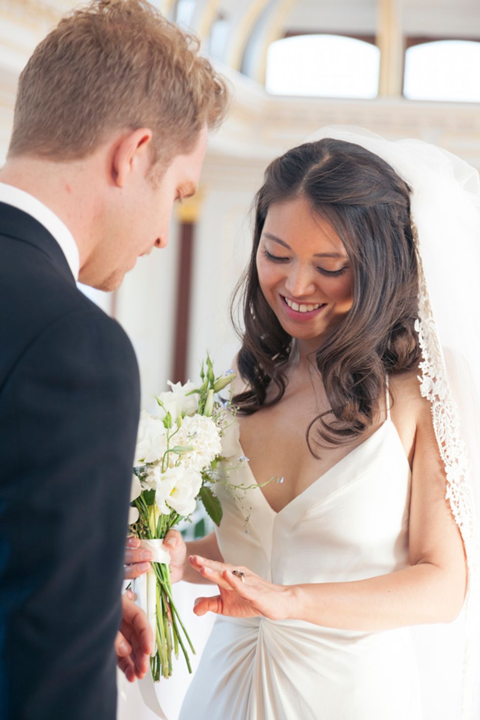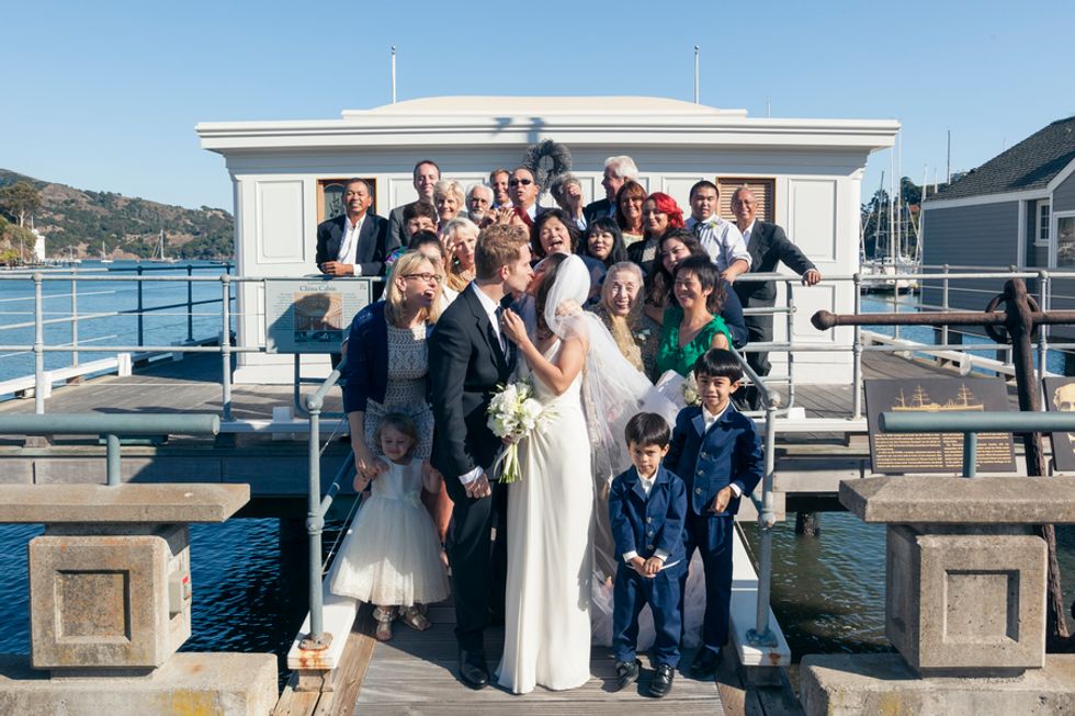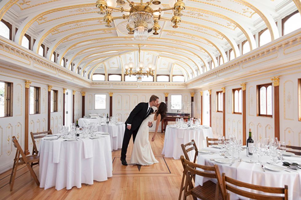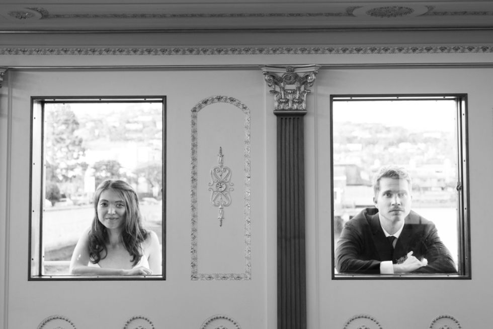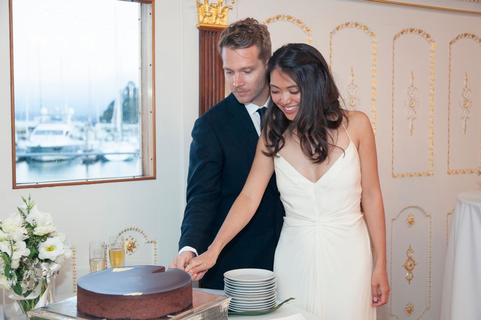 The couple held their nuptials in the China Cabin, once the social saloon on the PS China. The luxurious, well preserved room, leafed in 22-karat gold, is actually a National Maritime Monument, having made 30 roundtrip journeys from San Francisco to Hong Kong.