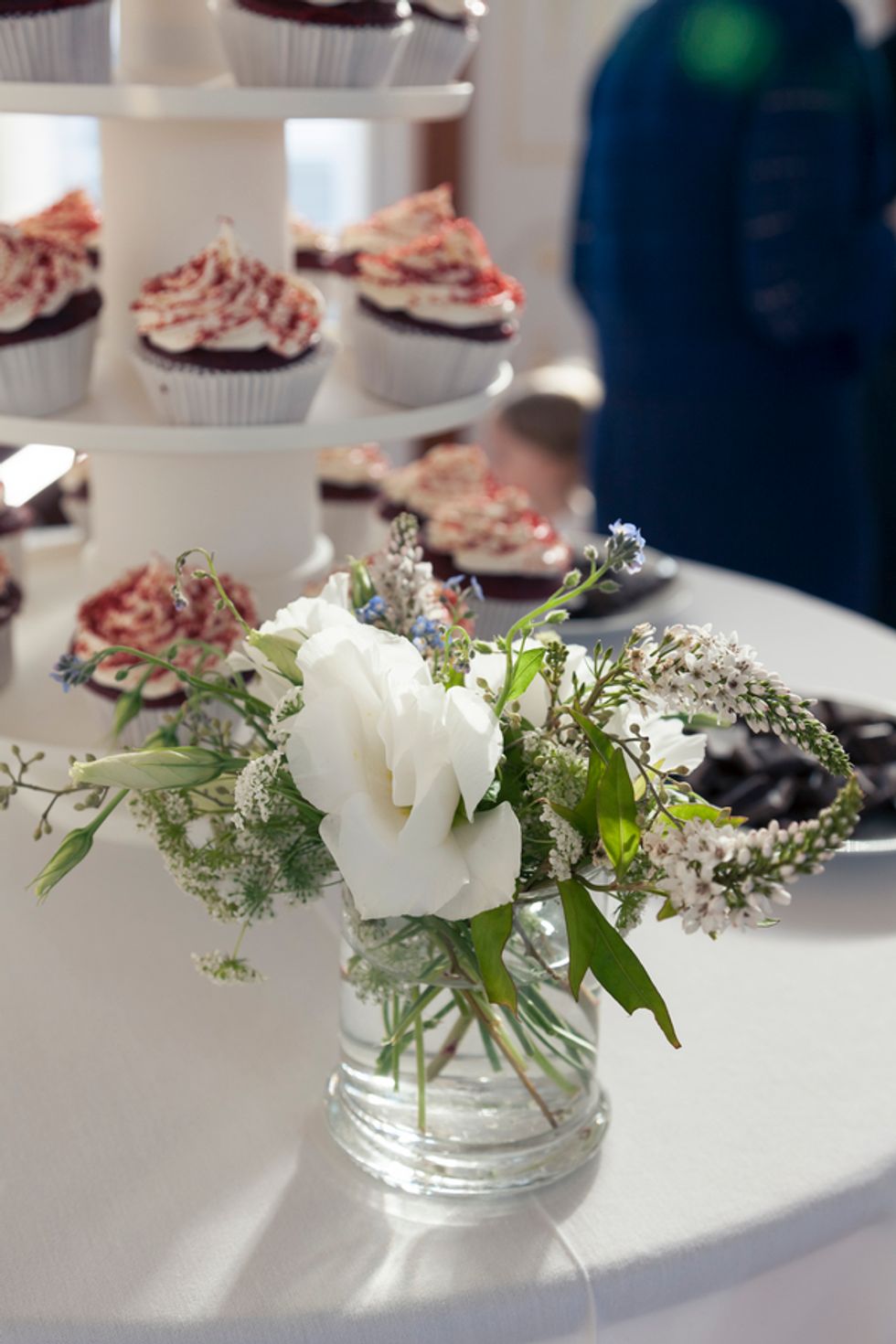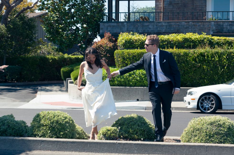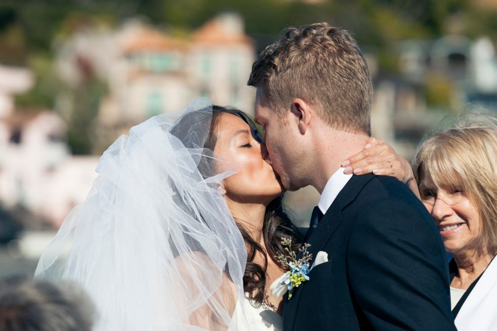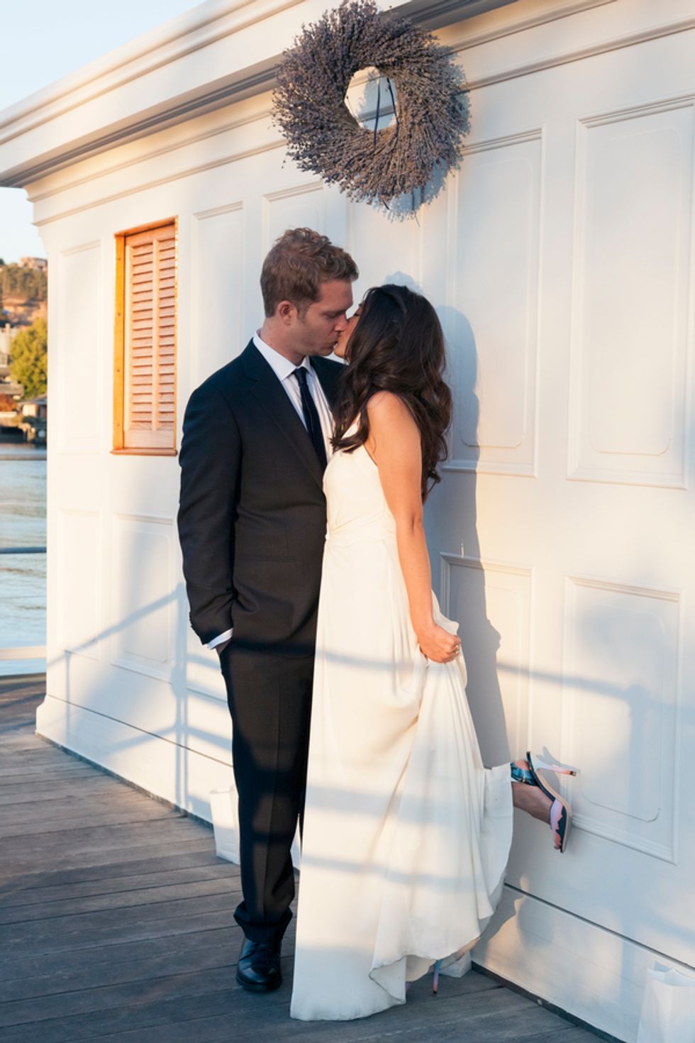 Everything here was first-class. Joy and Brad's picture-perfect wedding was complete with personal touches that reflected their commitment to sustainability: Joy arrived in a Prius, and both the invitations and dress were made from recycled and reused products. Despite the California setting, the couple did not forget their Brooklyn roots: Catering came courtesy of hometown restaurant Bep.