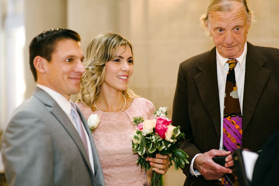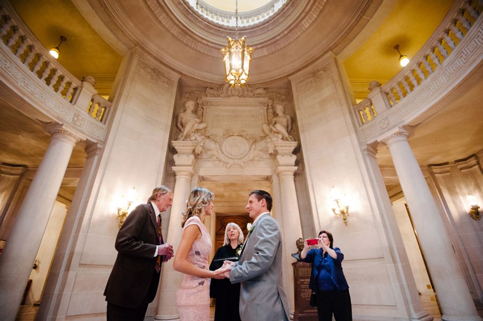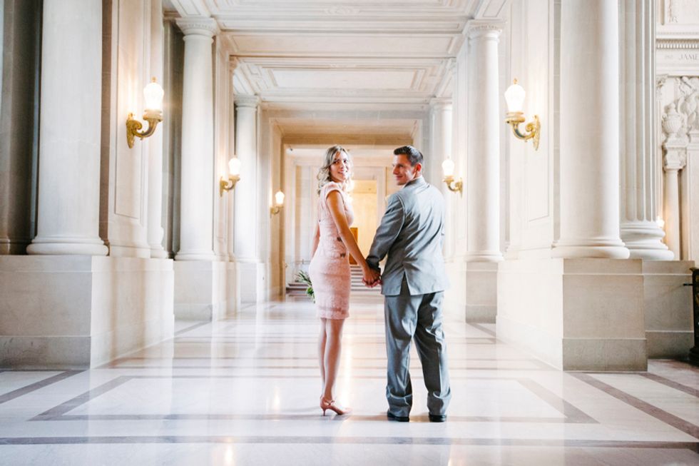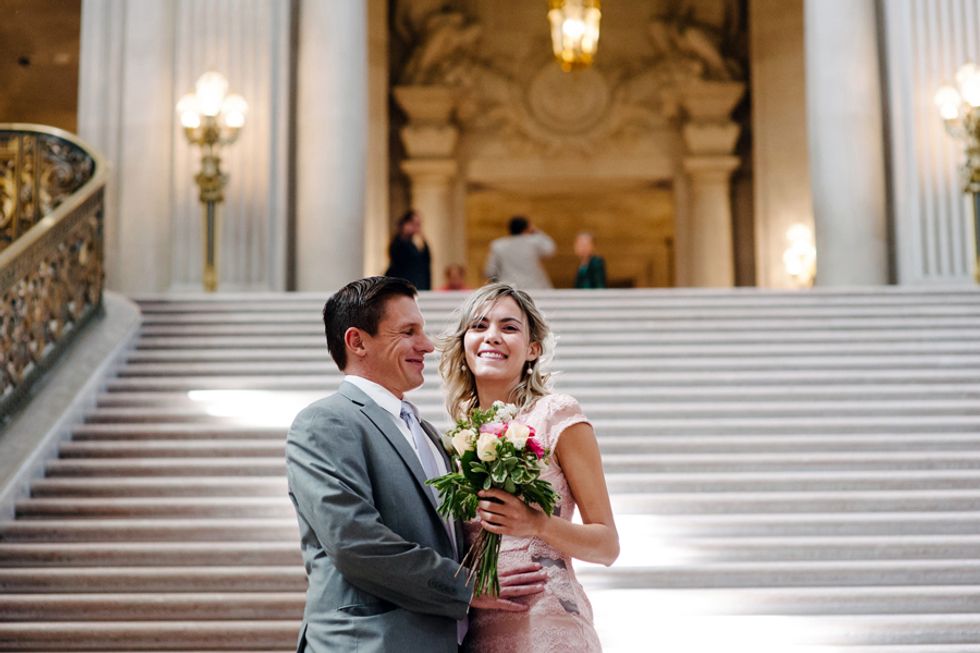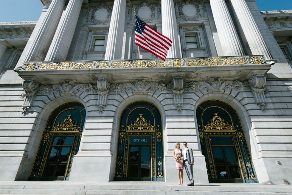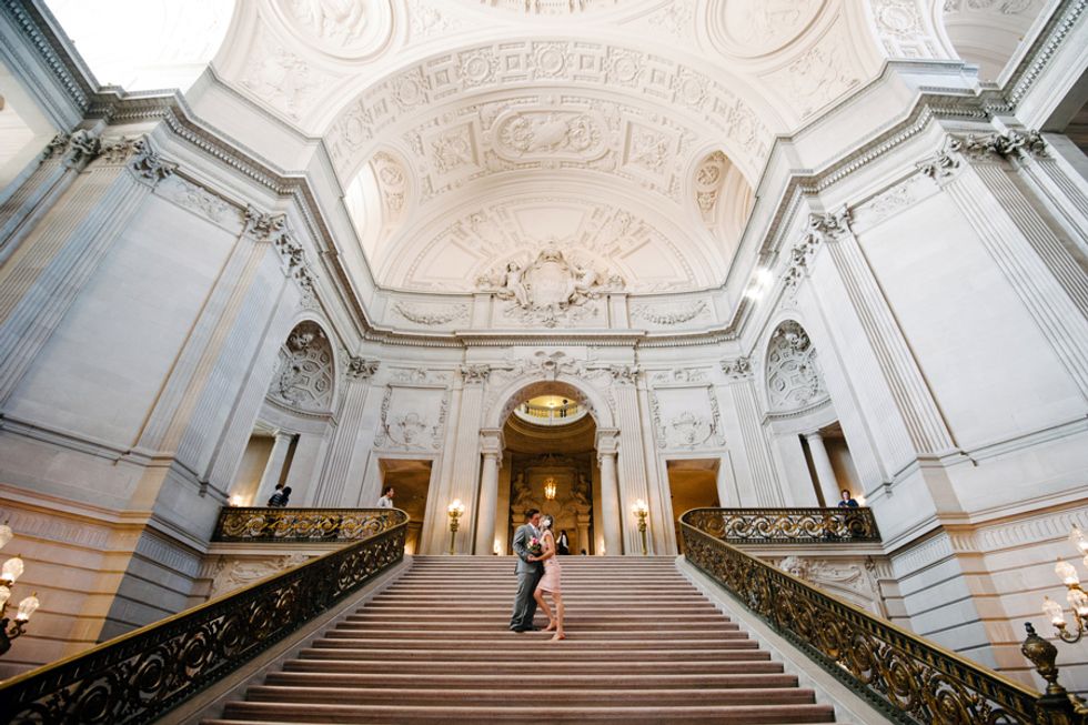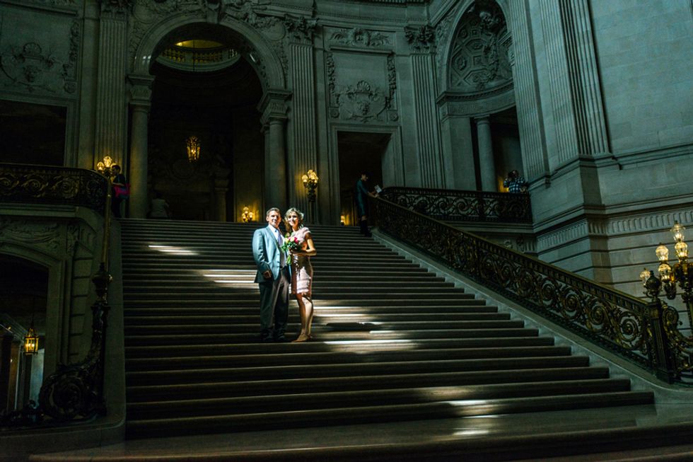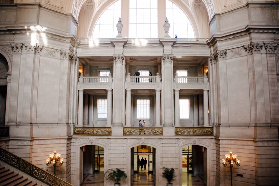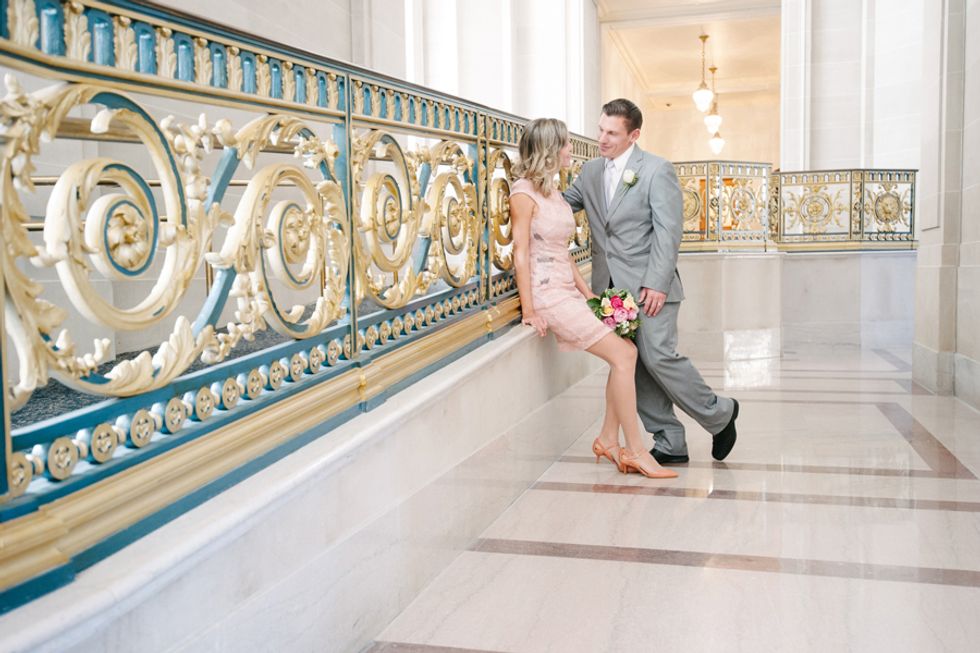 The couple had an intimate exchange of vows under the rotunda at San Francisco City Hall, surrounded by the art deco-style windows, the glassy marble floors, and golden filigree throughout the building. The groom’s parents were in attendance. The city hall elopement was just a short and sweet precursor to Trigg and Thalita’s upcoming wedding ceremony in Florianópolis, Brazil.