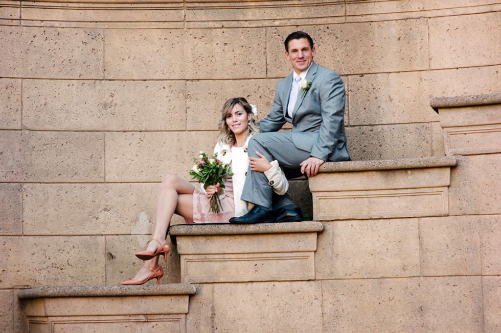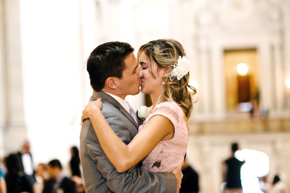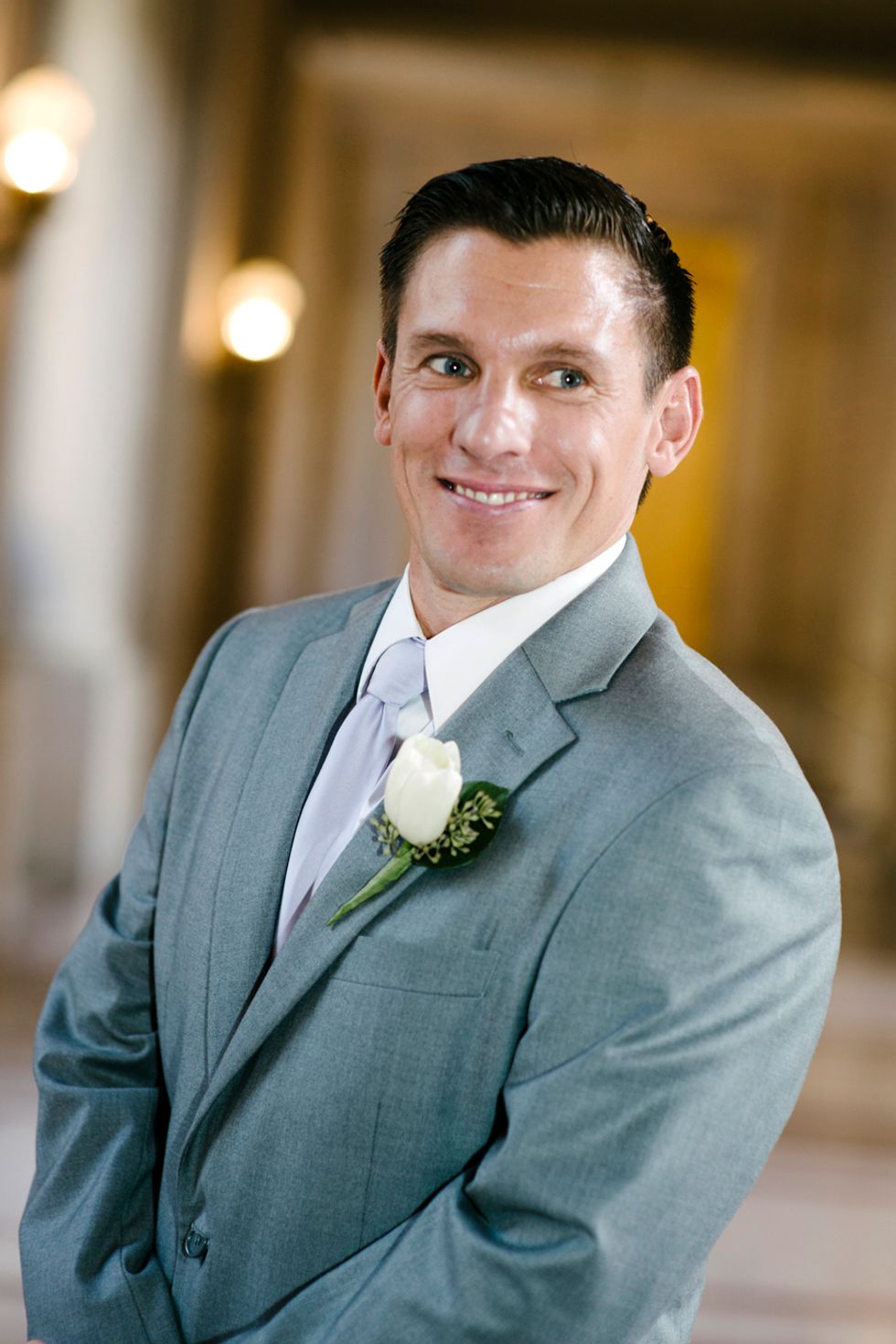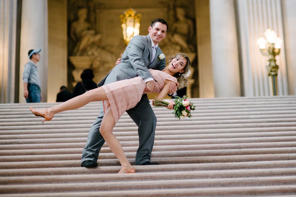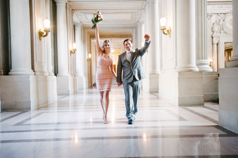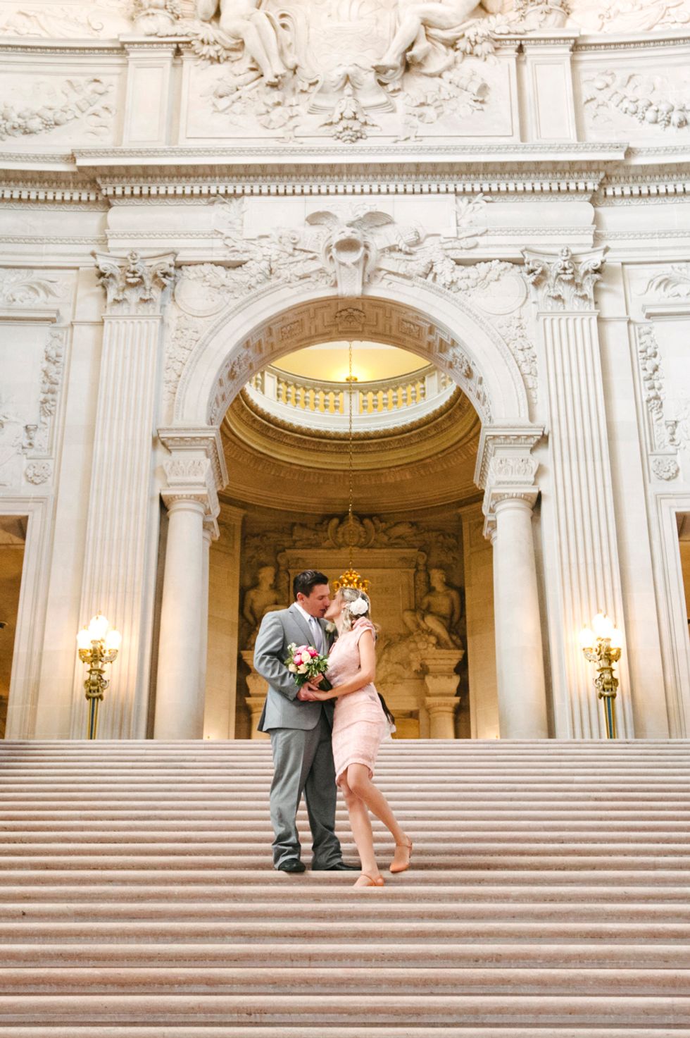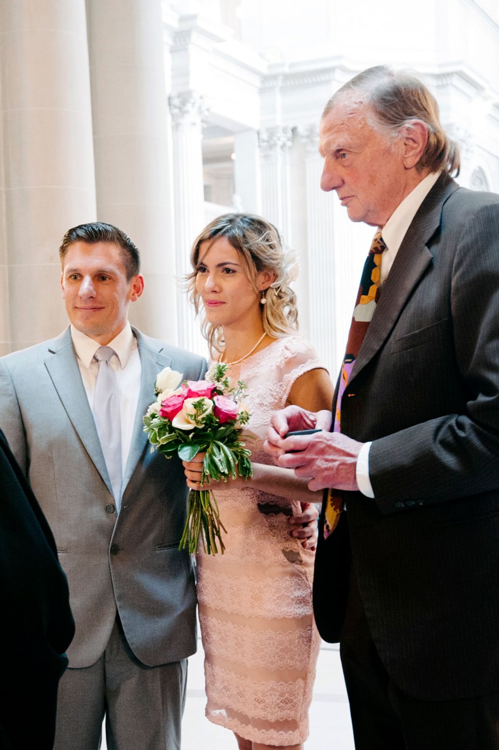 The couple had an intimate exchange of vows under the rotunda at San Francisco City Hall, surrounded by the art deco-style windows, the glassy marble floors, and golden filigree throughout the building. The groom’s parents were in attendance. The city hall elopement was just a short and sweet precursor to Trigg and Thalita’s upcoming wedding ceremony in Florianópolis, Brazil.