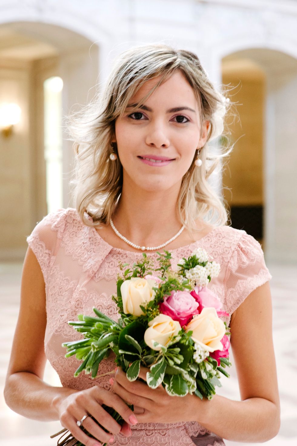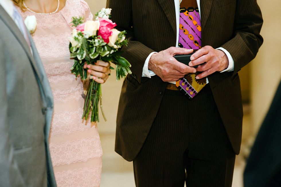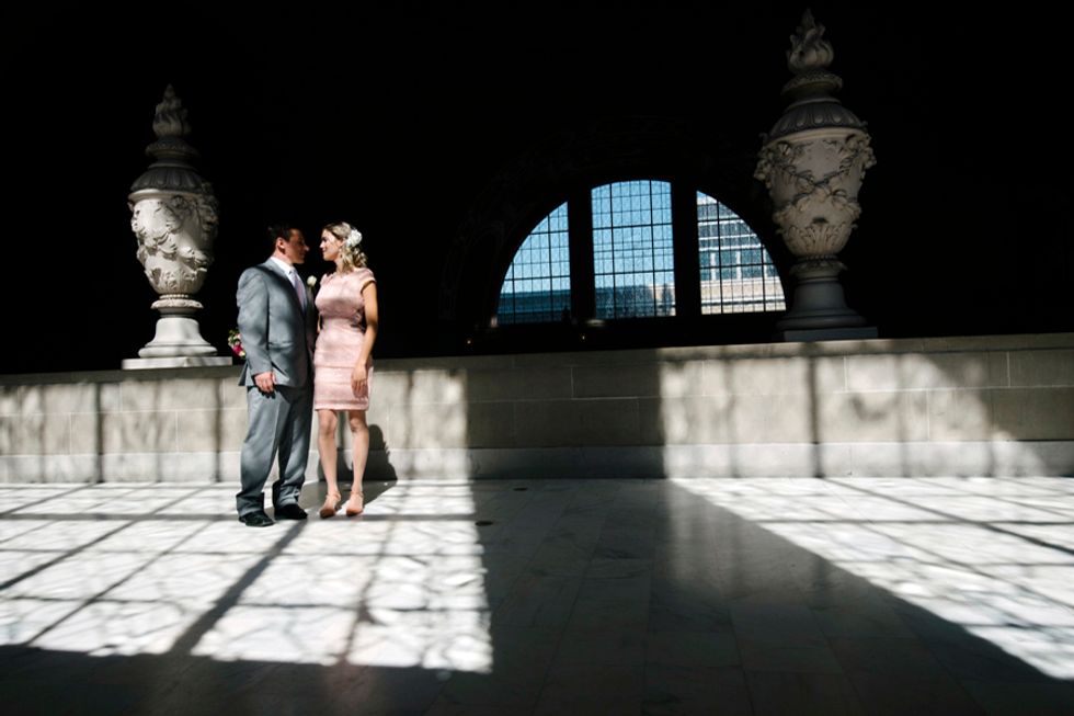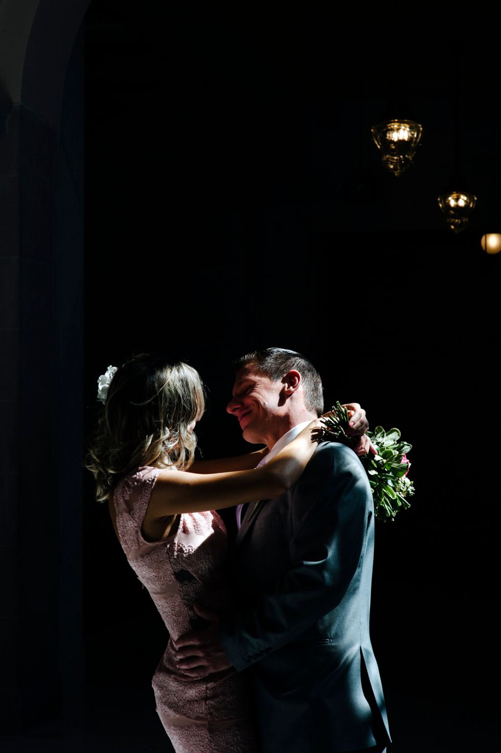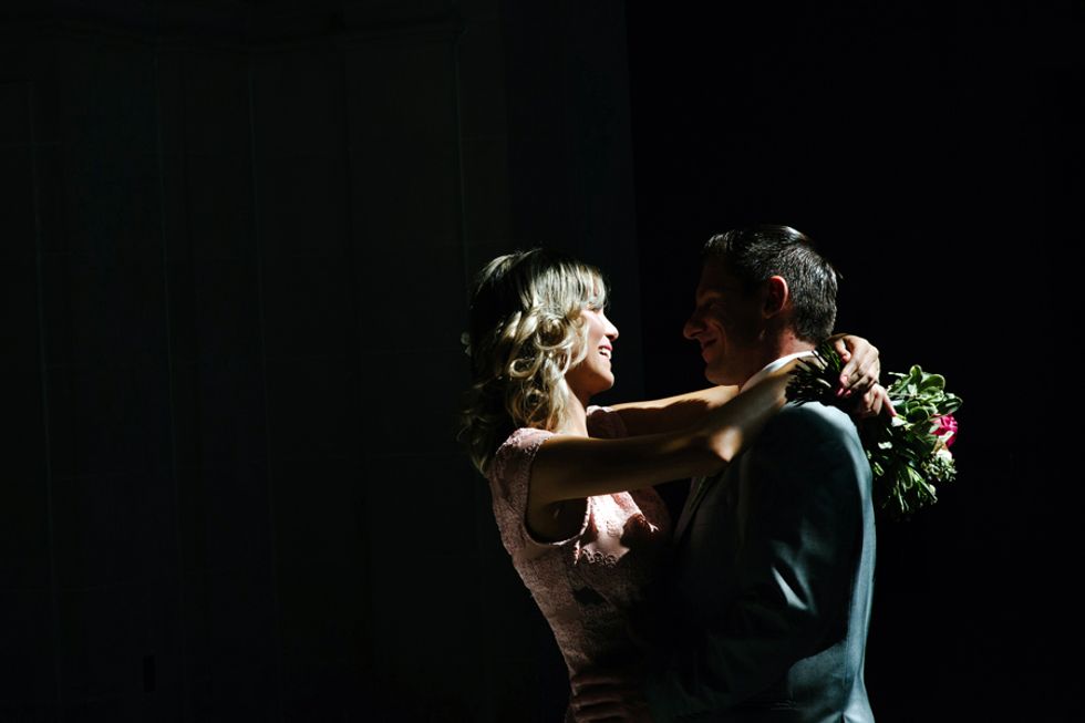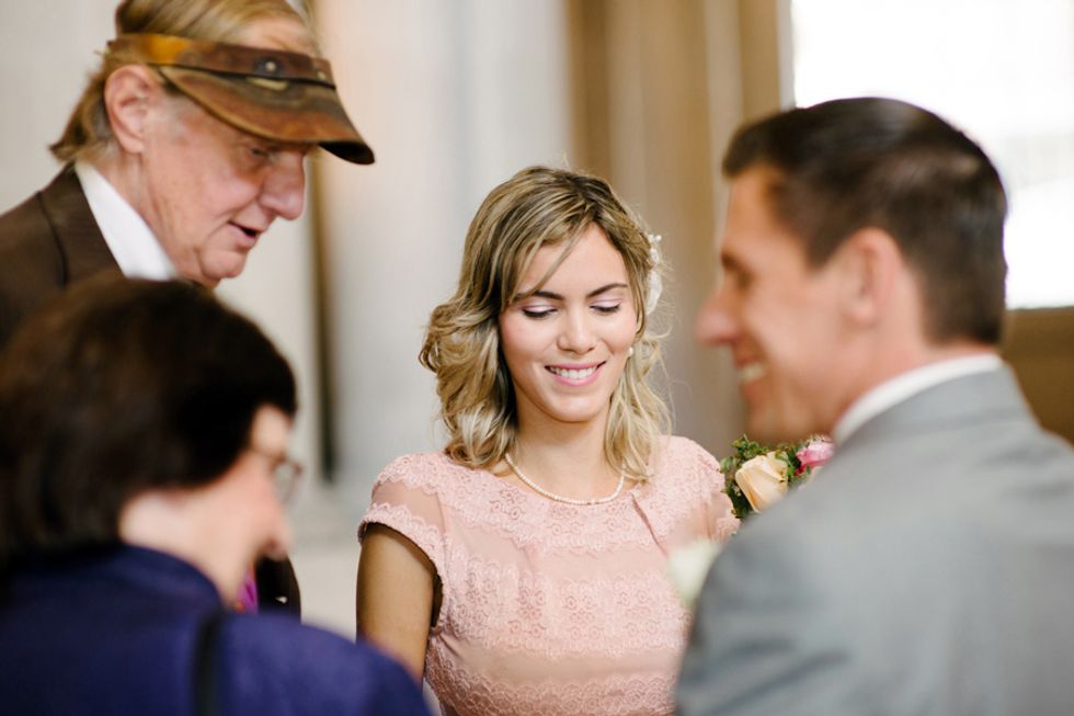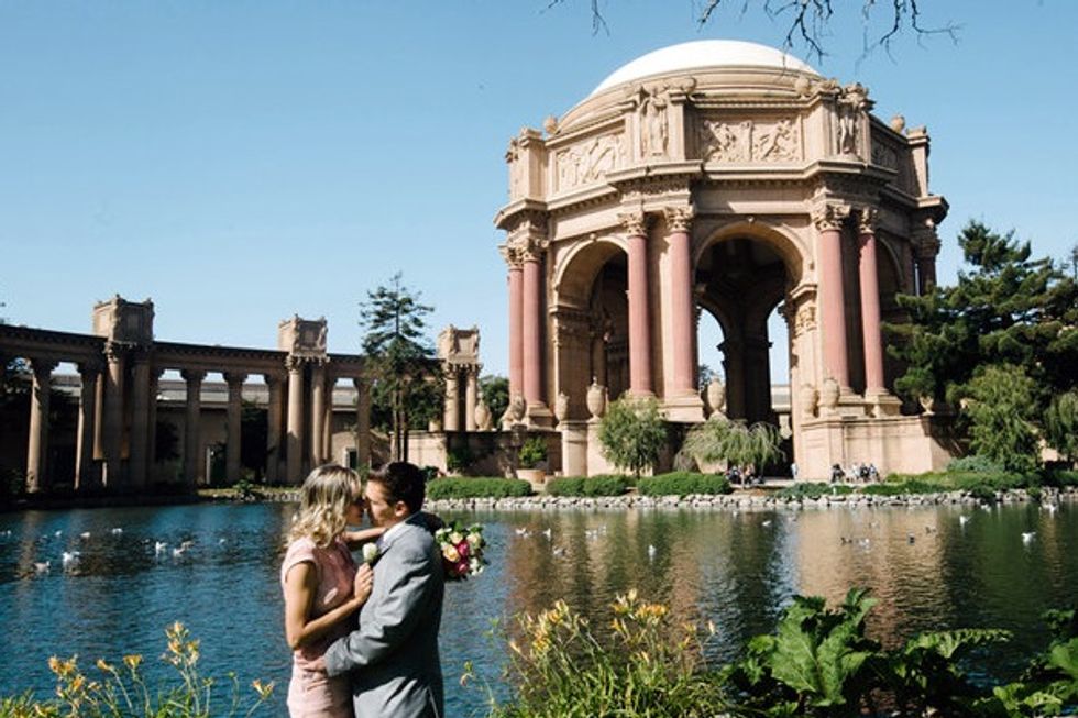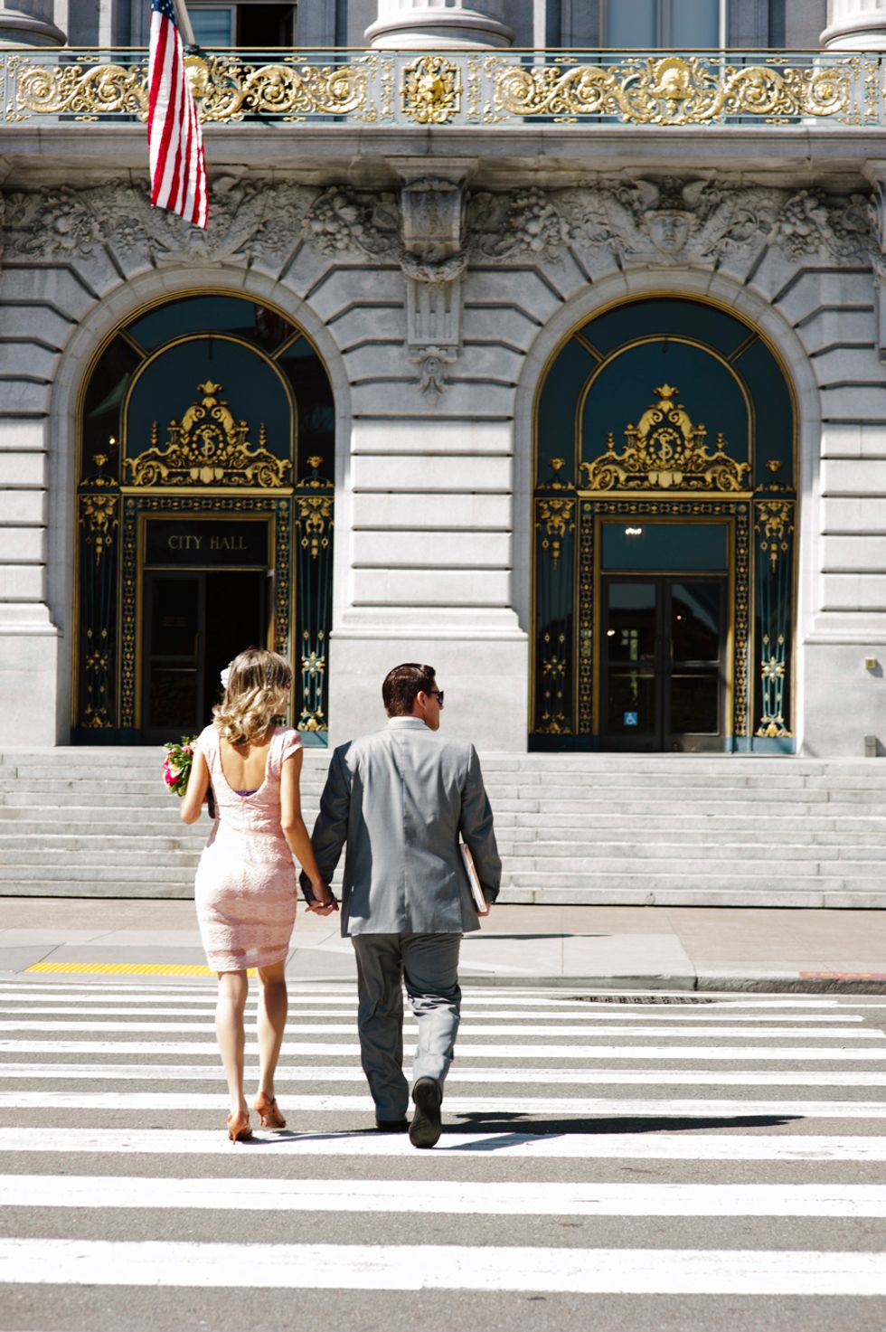 The couple had an intimate exchange of vows under the rotunda at San Francisco City Hall, surrounded by the art deco-style windows, the glassy marble floors, and golden filigree throughout the building. The groom’s parents were in attendance. The city hall elopement was just a short and sweet precursor to Trigg and Thalita’s upcoming wedding ceremony in Florianópolis, Brazil.
