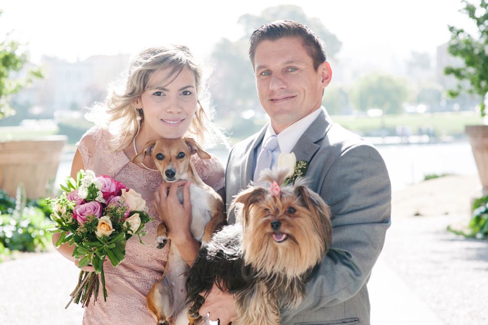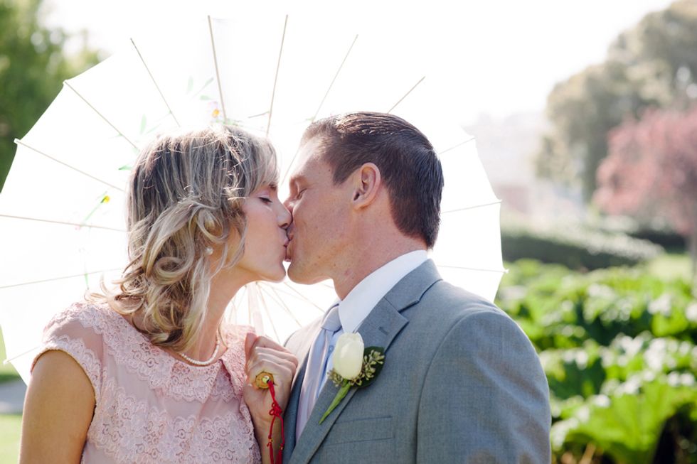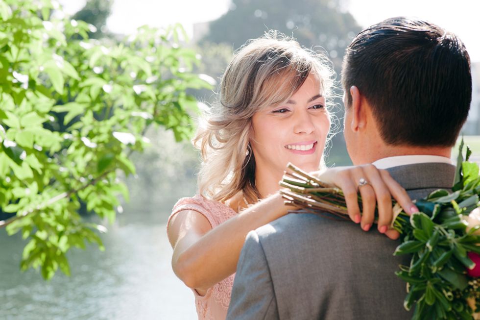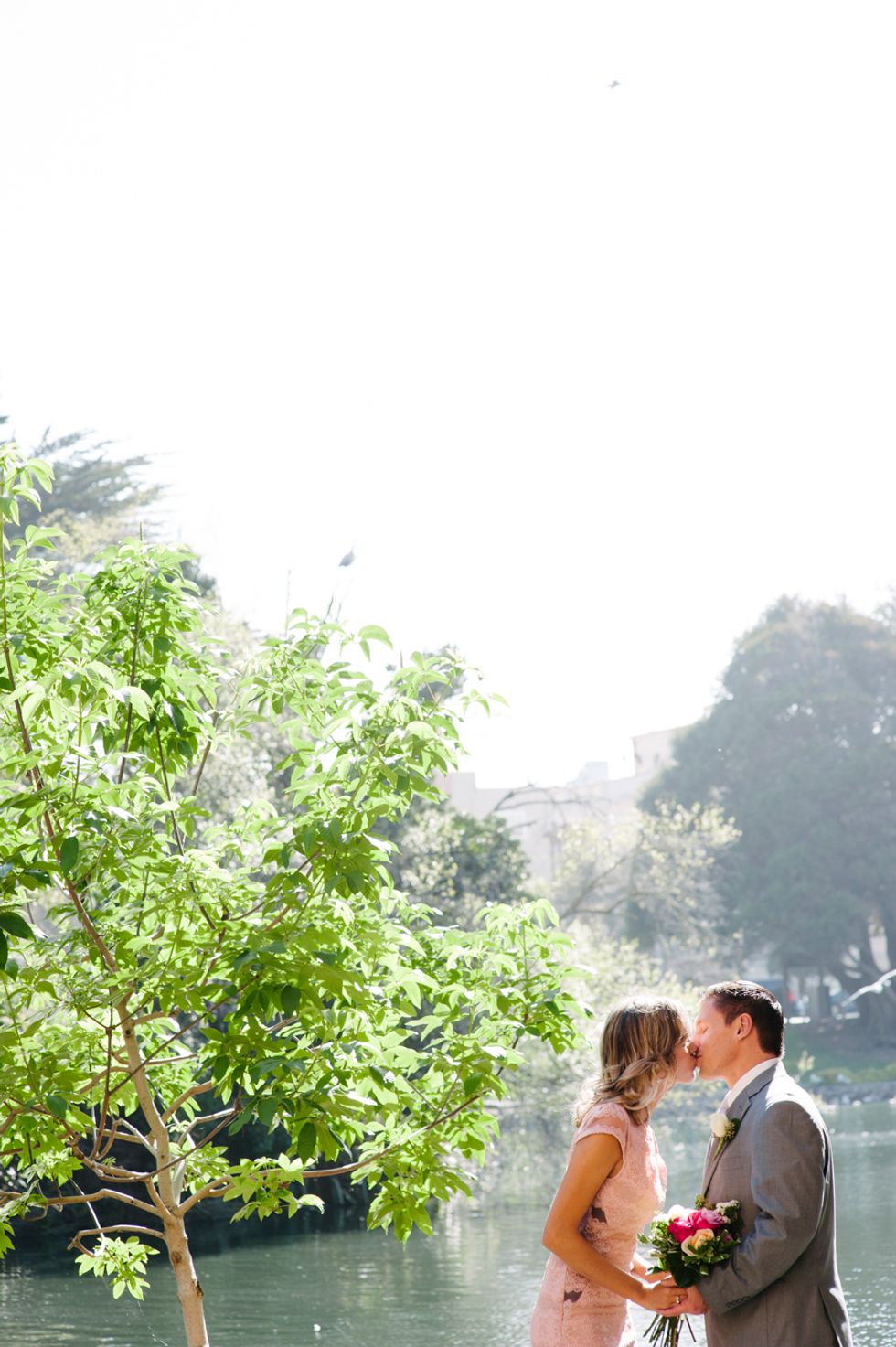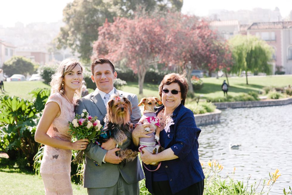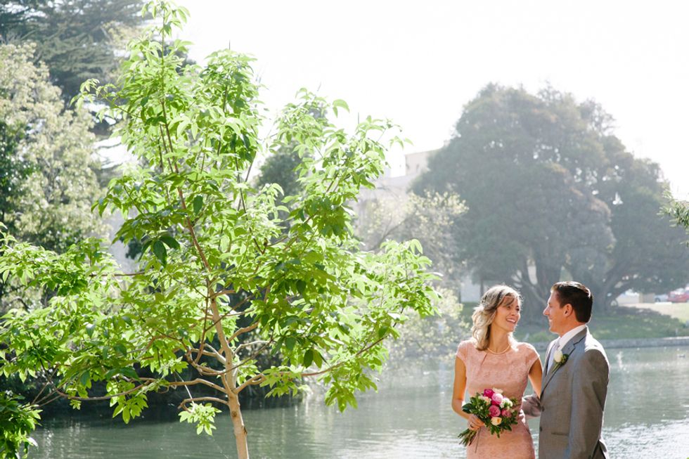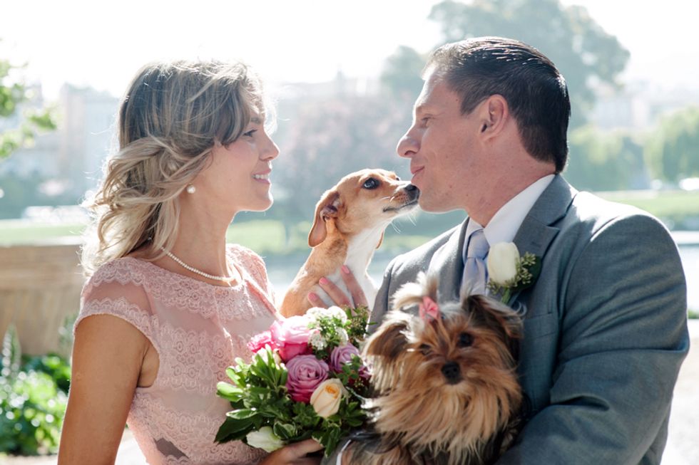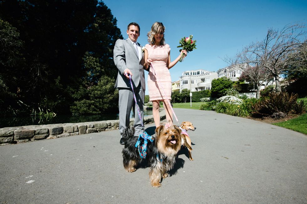 Trigg and Thalita’s sweet spring romance was tucked inside each detail of their laid back wedding. The sunlight streamed through the bride’s golden hair, pinned up by a delicate white flower, when the couple arrived at the Palace of Fine Arts to see the swans swimming along the edge of the lagoon. Thalita donned a rose lace cocktail dress, a bouquet of pink roses, and classic pearls, while their dogs Mel and Yoko made a wedding photo cameo,