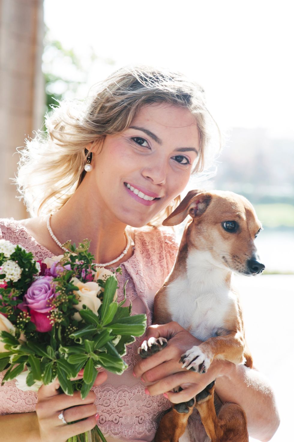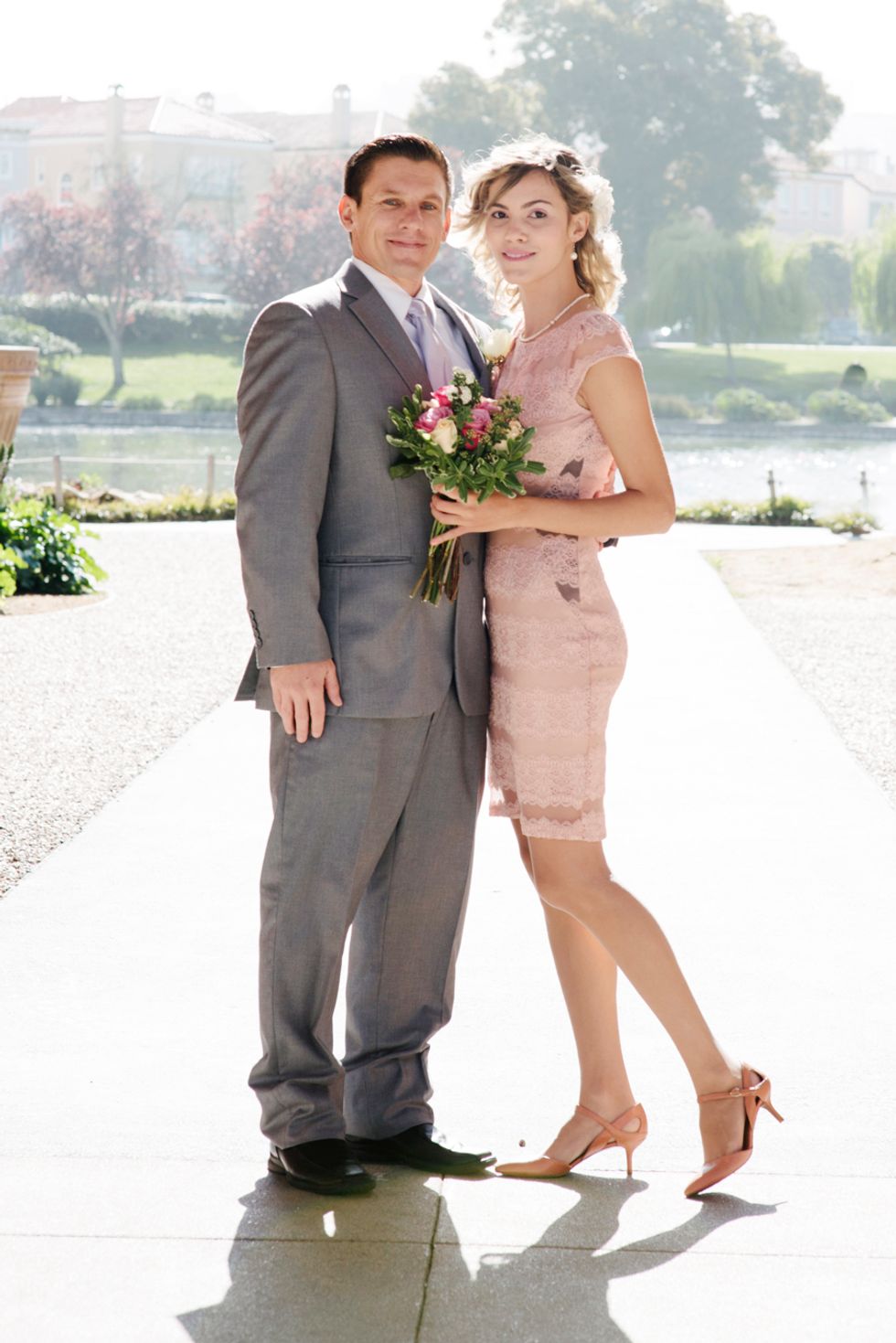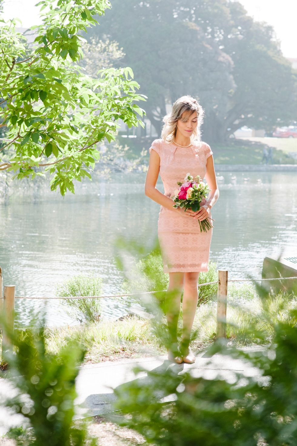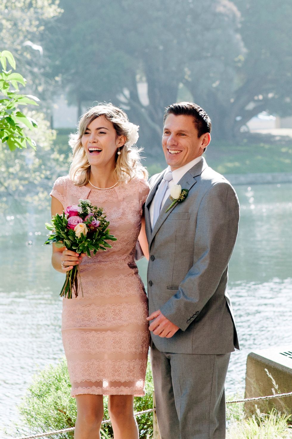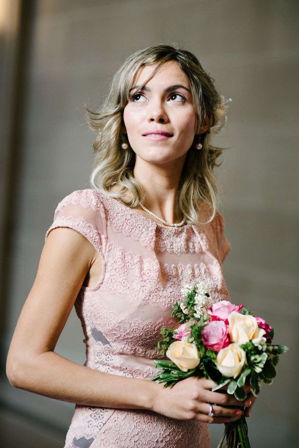 Trigg and Thalita’s sweet spring romance was tucked inside each detail of their laid back wedding. The sunlight streamed through the bride’s golden hair, pinned up by a delicate white flower, when the couple arrived at the Palace of Fine Arts to see the swans swimming along the edge of the lagoon. Thalita donned a rose lace cocktail dress, a bouquet of pink roses, and classic pearls, while their dogs Mel and Yoko made a wedding photo cameo,
