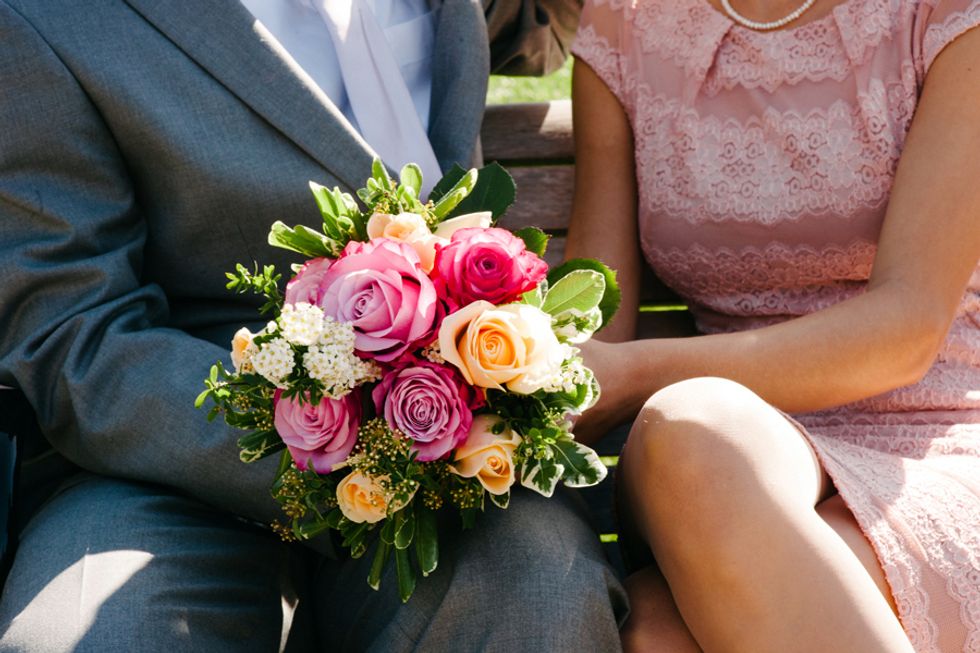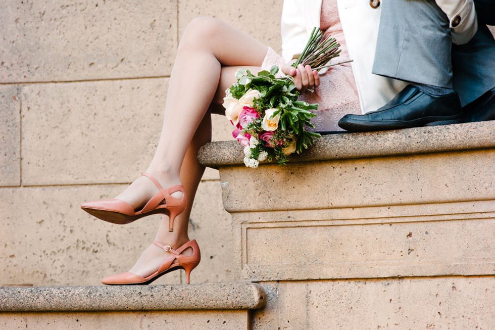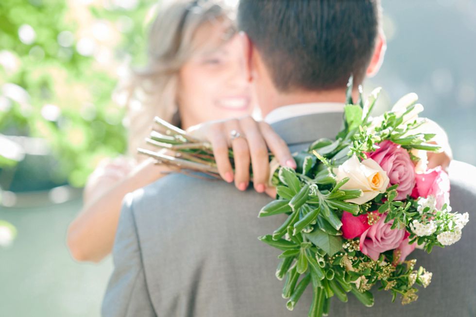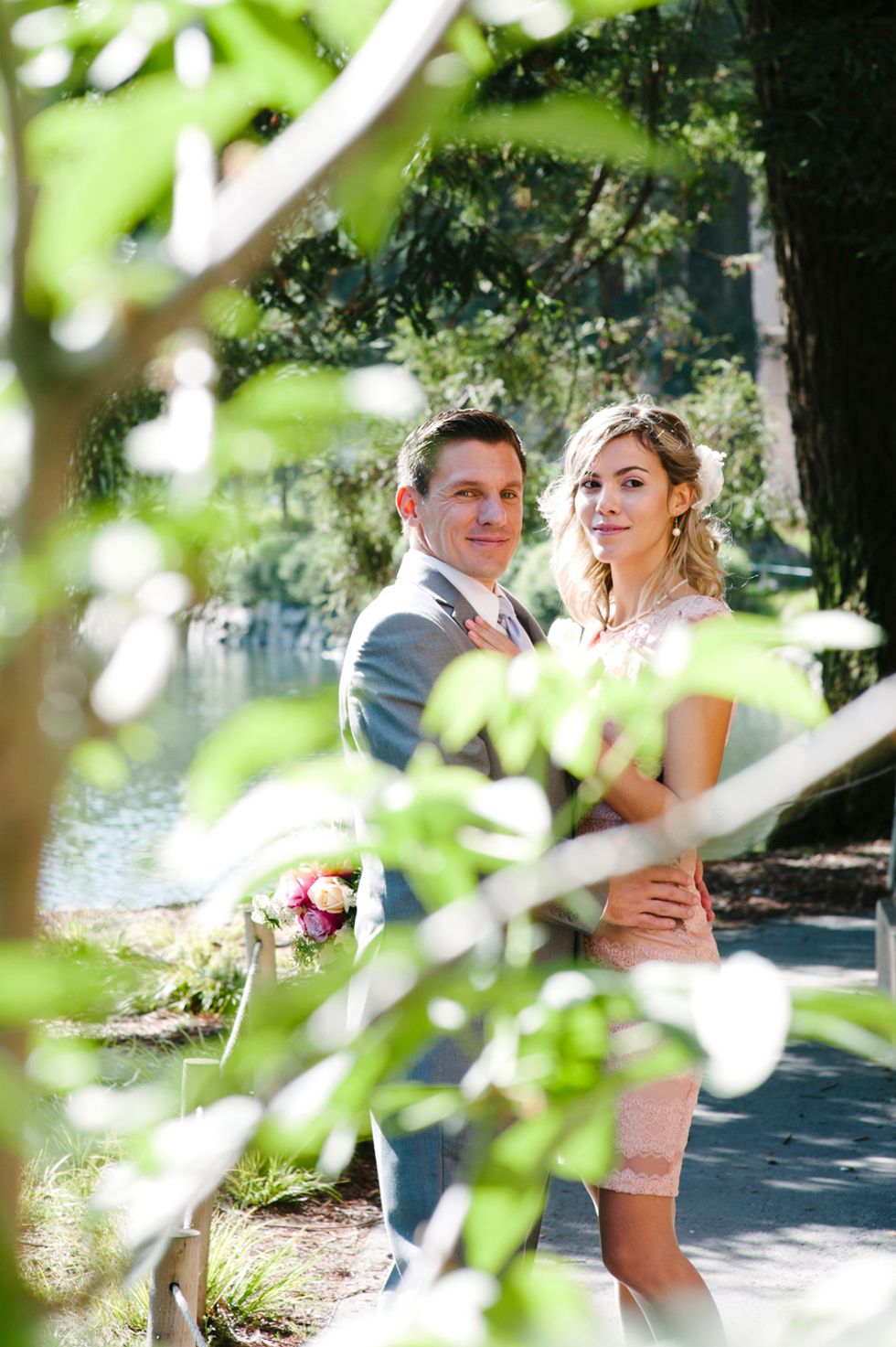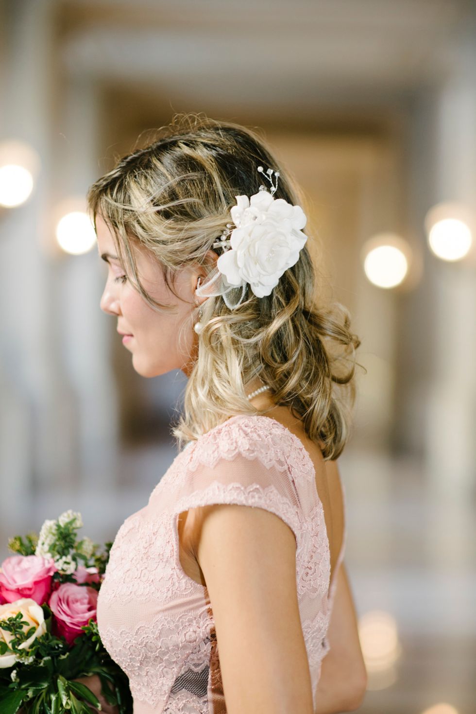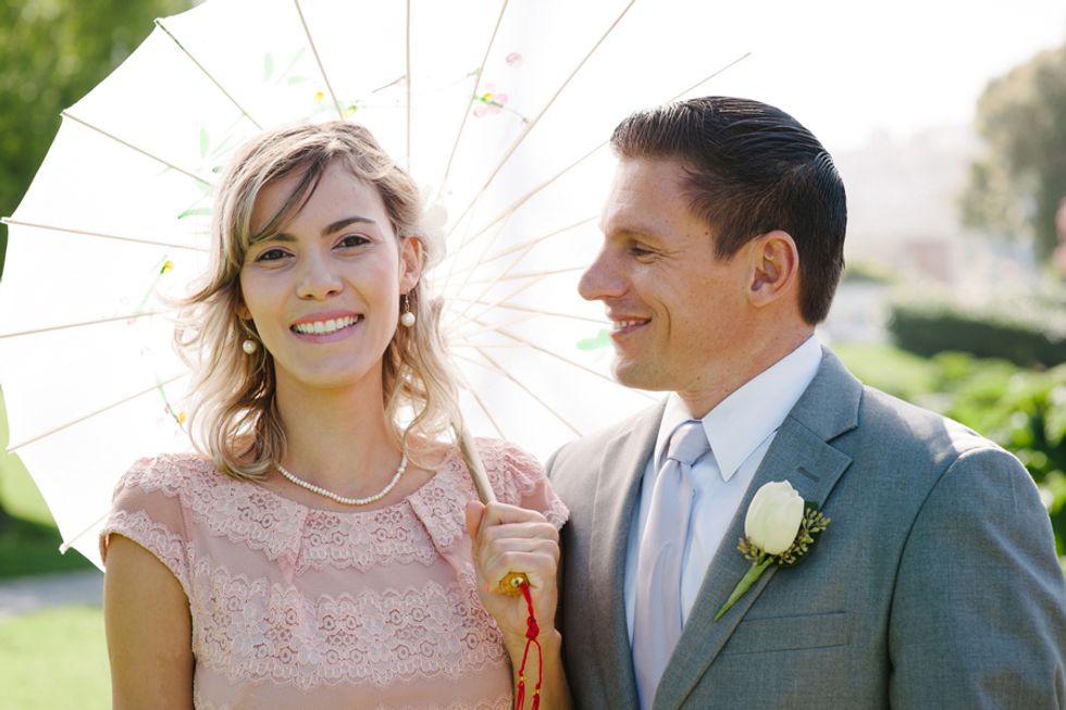 Trigg and Thalita’s sweet spring romance was tucked inside each detail of their laid back wedding. The sunlight streamed through the bride’s golden hair, pinned up by a delicate white flower, when the couple arrived at the Palace of Fine Arts to see the swans swimming along the edge of the lagoon. Thalita donned a rose lace cocktail dress, a bouquet of pink roses, and classic pearls, while their dogs Mel and Yoko made a wedding photo cameo,