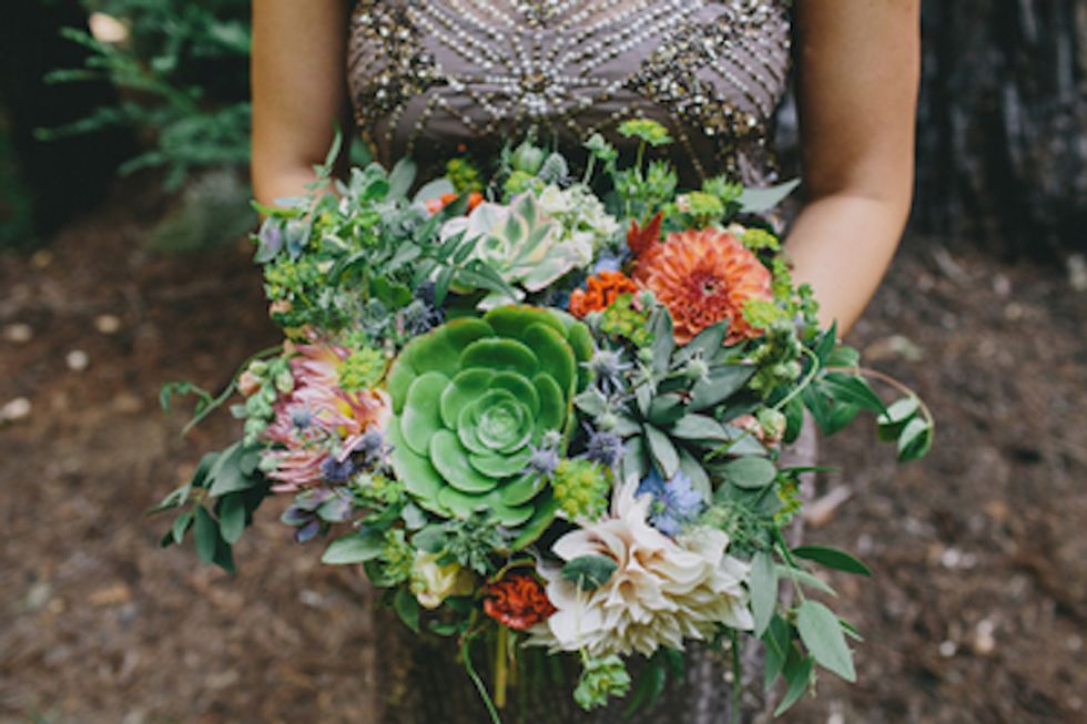 In a stunning ode to the surrounding trees as well as the bright succulents in their SF apartment, newlyweds Mirra and Adrian modeled their wedding cake and décor after nature's bounty. The bride sparkled in a gold dress, rather than the traditional white, as she walked down a dirt aisle to the flower-adorned altar.