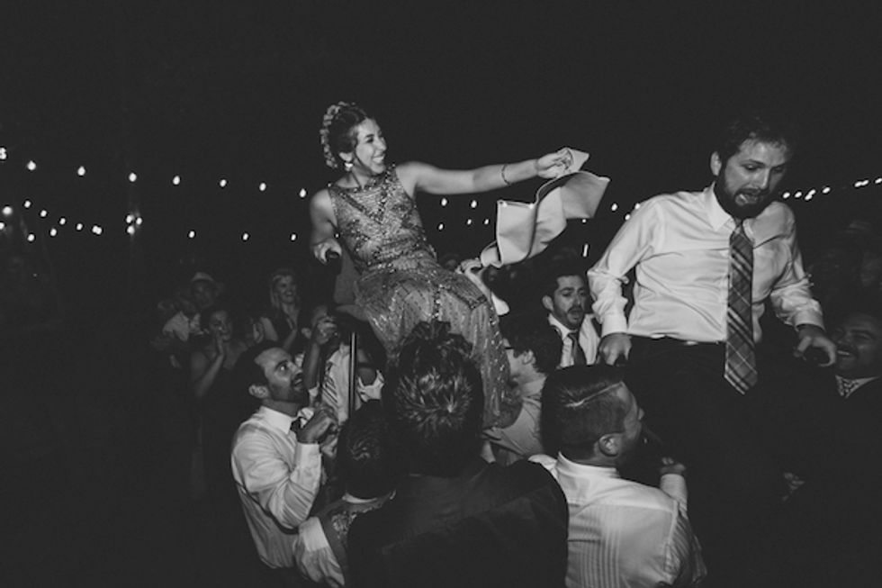 As a tribute to their multicultural backgrounds, the nuptials had elements of traditional English, Hebrew, and Spanish ceremonies. The Jewish traditions of dancing the hora, breaking the glass, and lifting the newlyweds up on chairs were an integral part of the night. For the reception, the couple's friends Paul and Emily of Rhythm Rangellers provided festive music—because who doesn’t like a good fiddle?