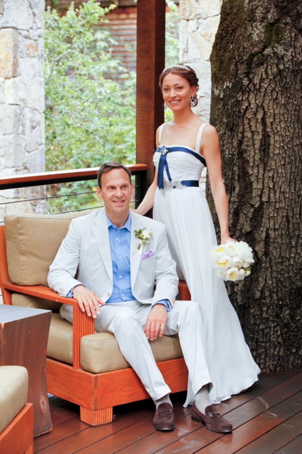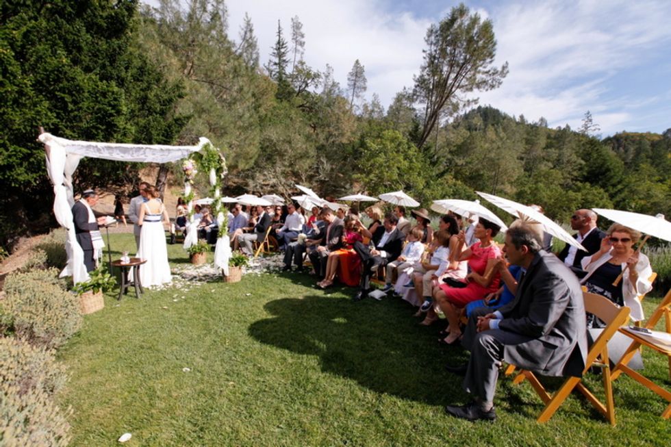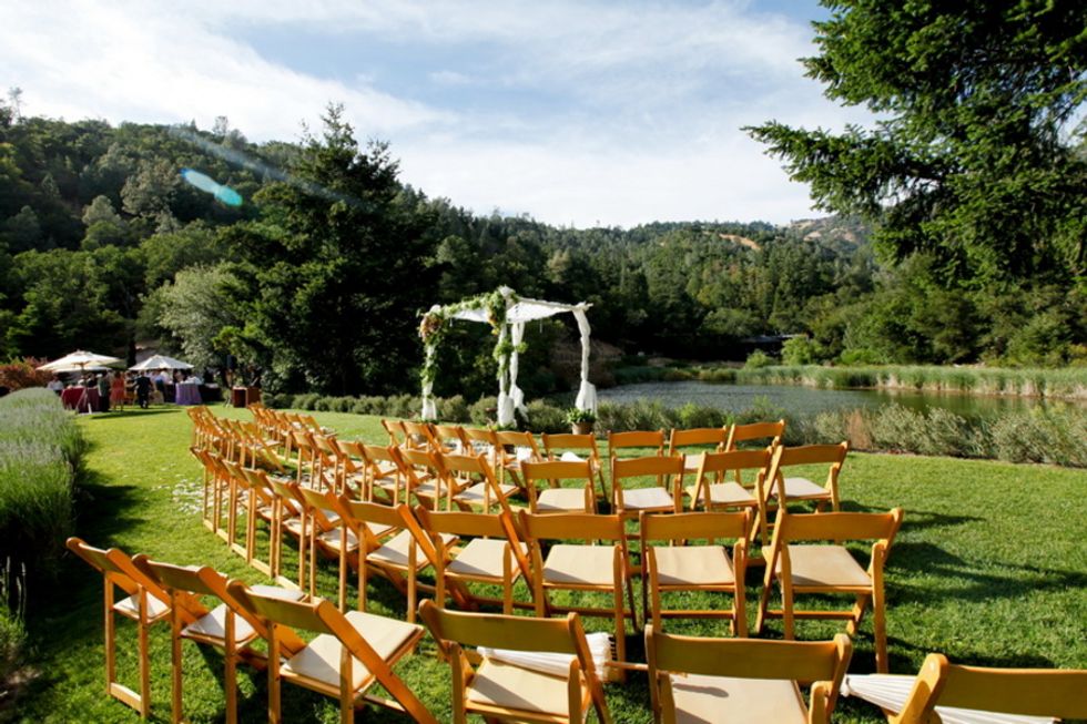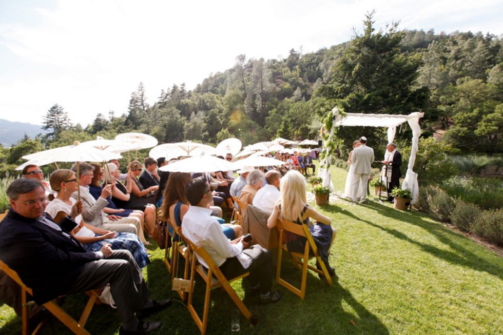 The dress code for the first half of the day was light, bright, and airy. The bride and groom said their vows beneath a canopy festooned with flowers on the beautiful lawns of Calistoga Ranch. Friends and family clad in different shades of pastel shielded themselves from the sun with ivory paper parasols.