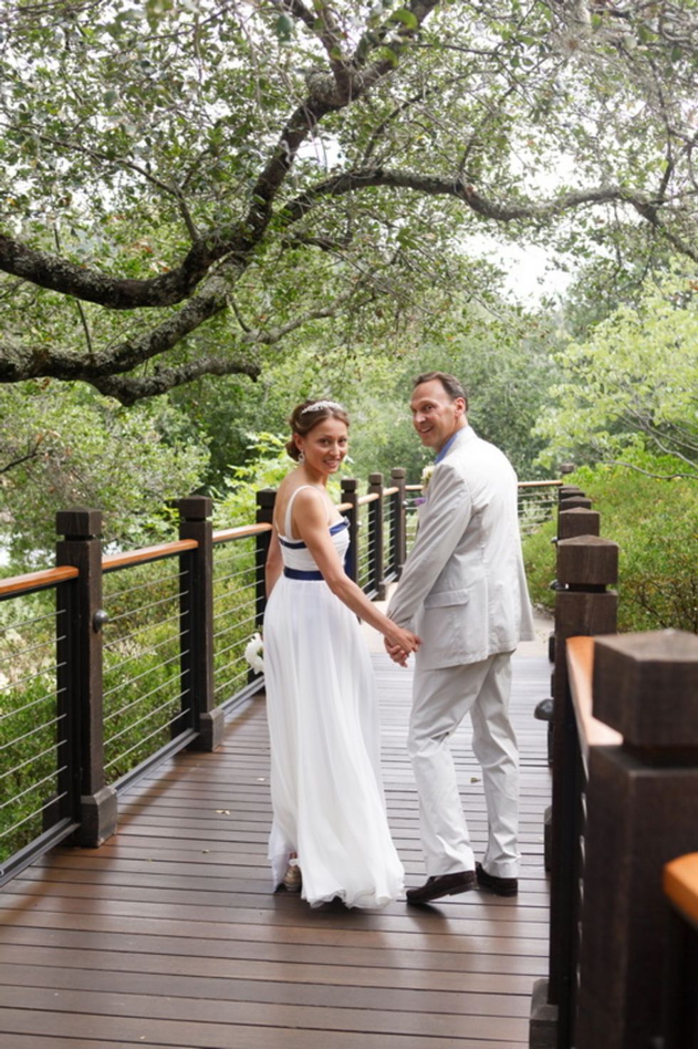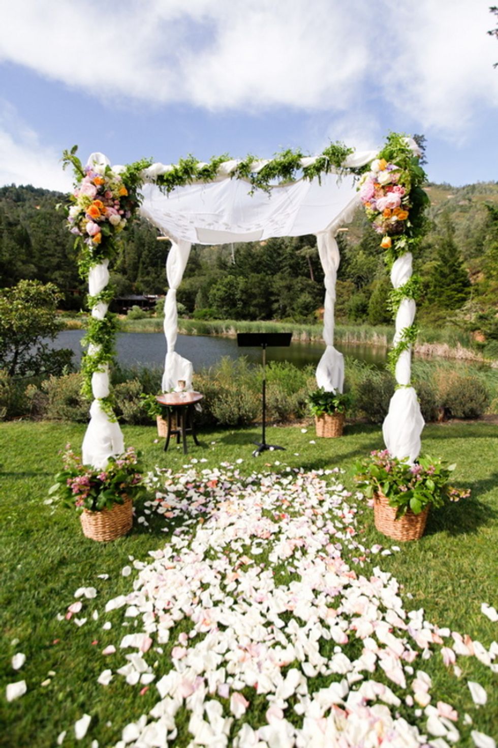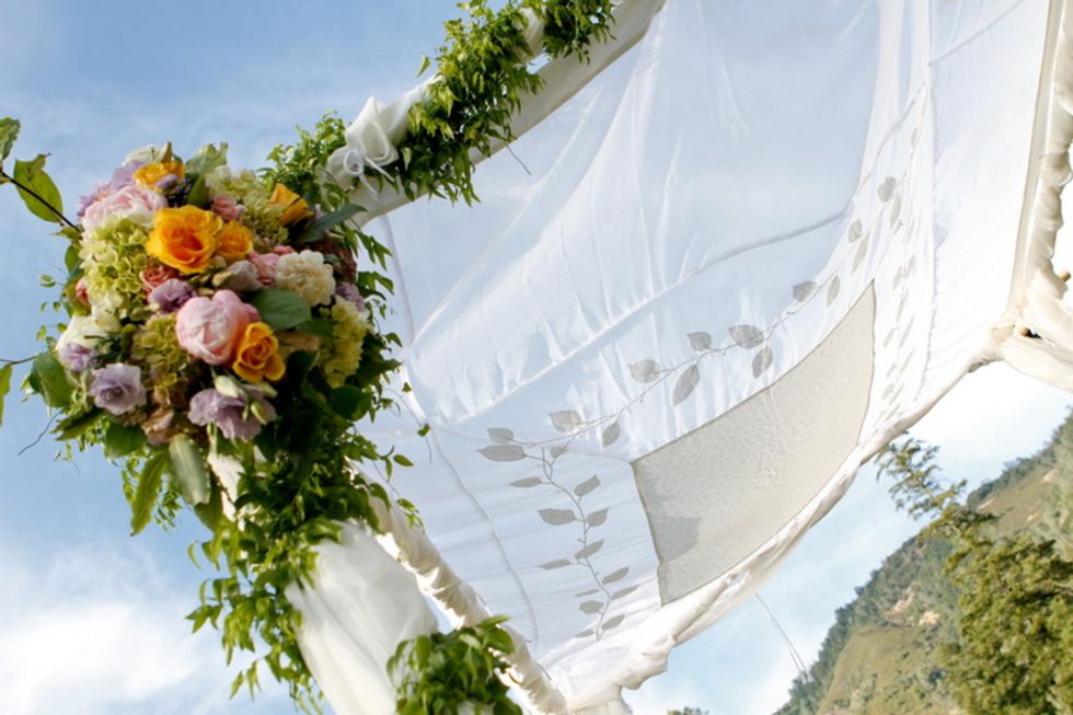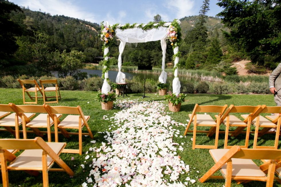 The dress code for the first half of the day was light, bright, and airy. The bride and groom said their vows beneath a canopy festooned with flowers on the beautiful lawns of Calistoga Ranch. Friends and family clad in different shades of pastel shielded themselves from the sun with ivory paper parasols.