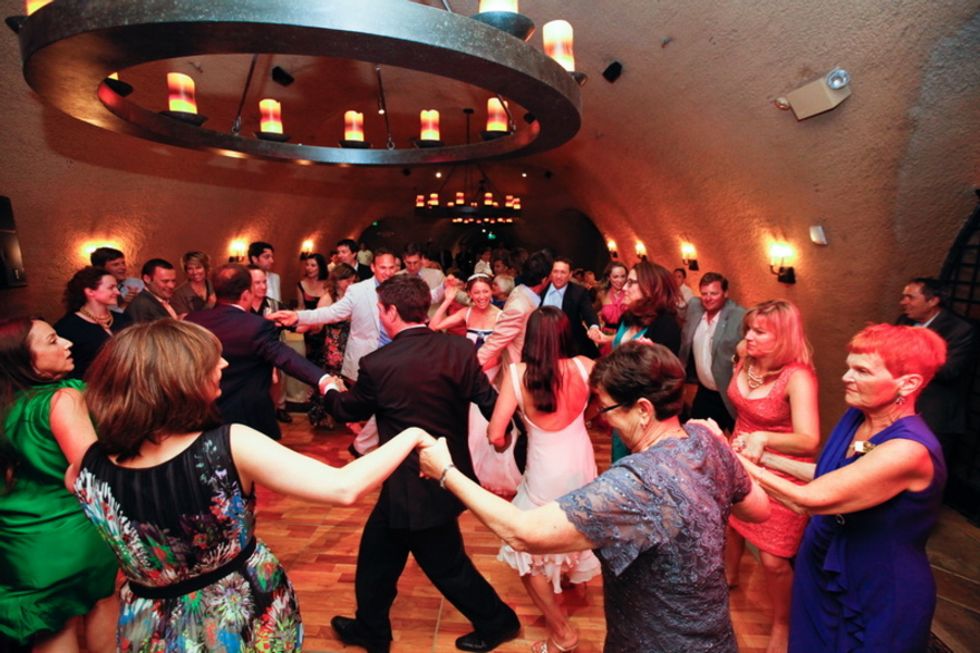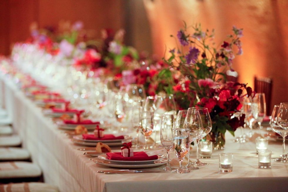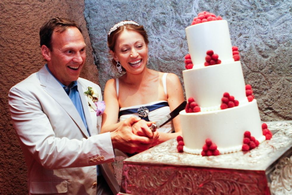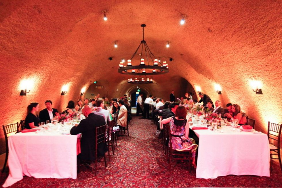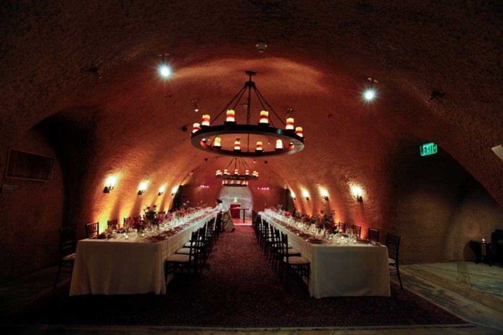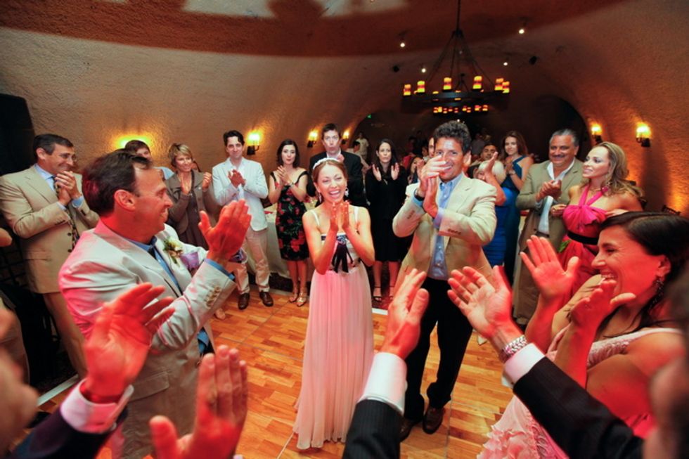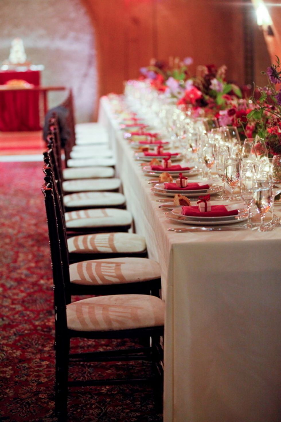After the ceremony, the couple switched the elegant floral decor for a more stately, opulent red-and-gold theme as guests filled the ranch's wine caves. Inside, partygoers were treated to handmade chocolates, homemade bread, gourmet pastries, and a triple-decker cake studded with raspberries. As guests feasted to their hearts' content, Julia and David took to the subterranean dance floor for the first dance of the evening.