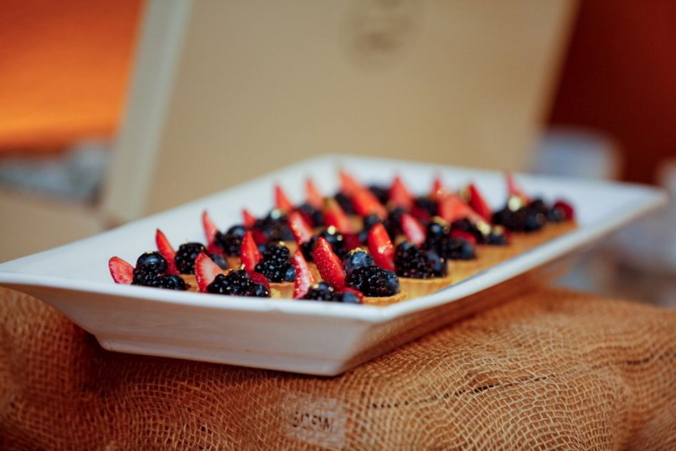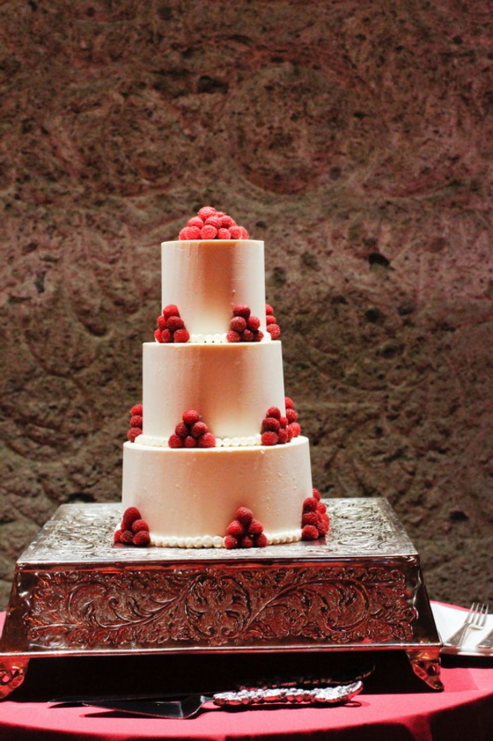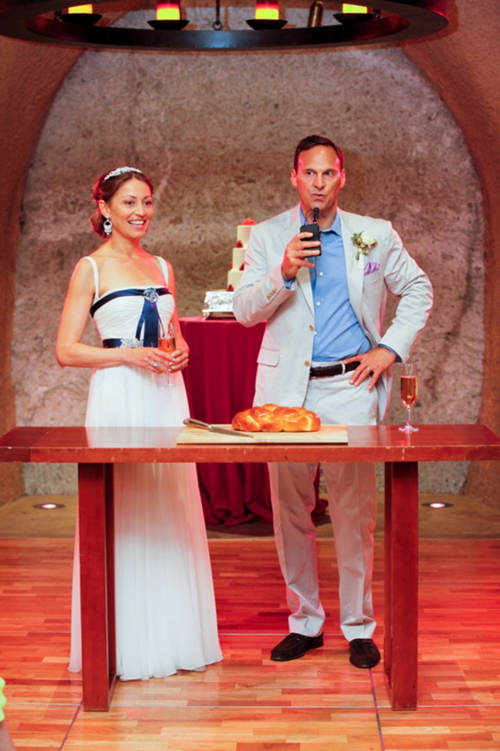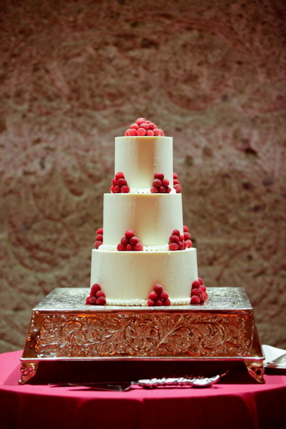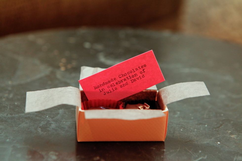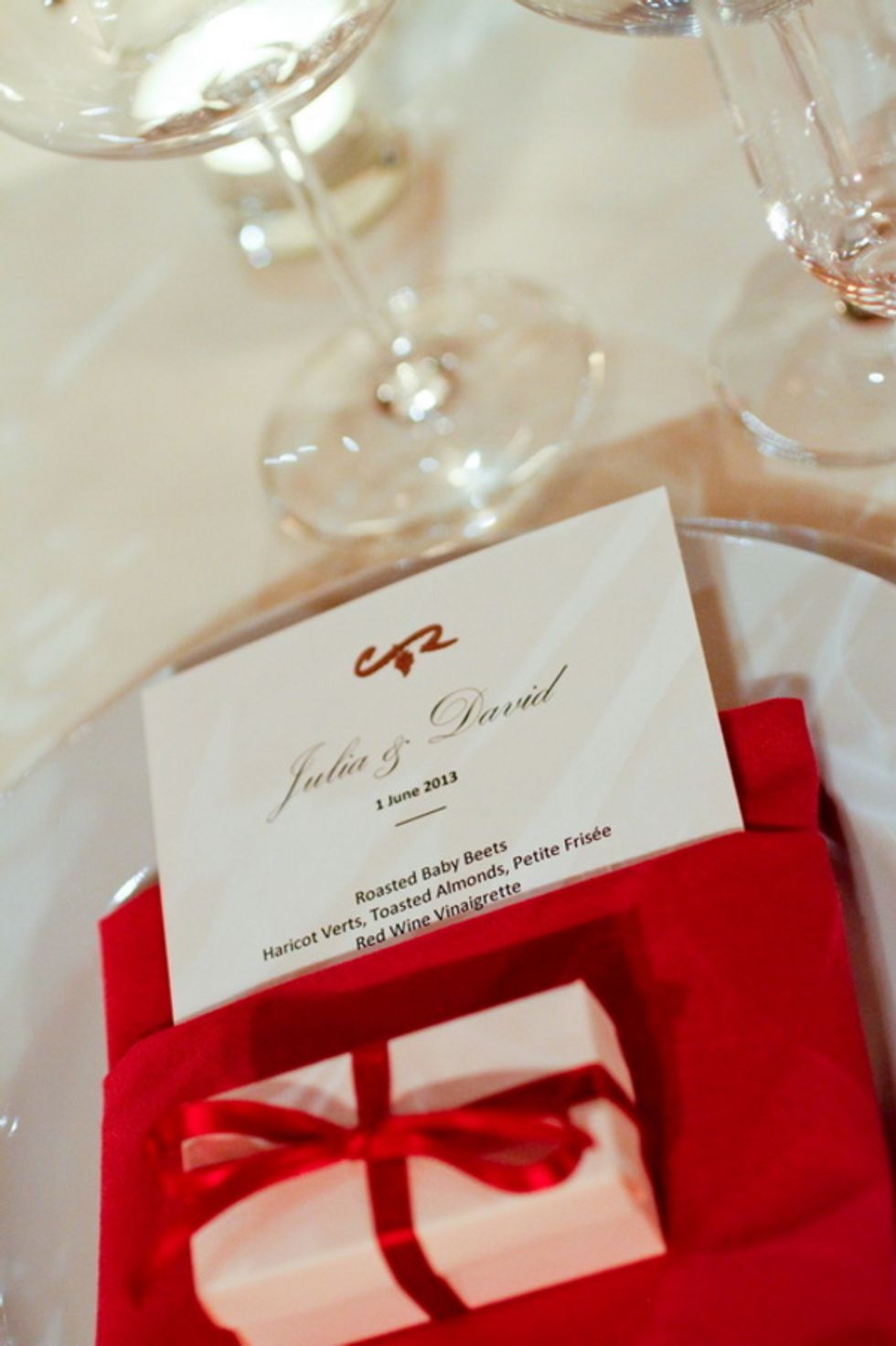 After the ceremony, the couple switched the elegant floral decor for a more stately, opulent red-and-gold theme as guests filled the ranch's wine caves. Inside, partygoers were treated to handmade chocolates, homemade bread, gourmet pastries, and a triple-decker cake studded with raspberries. As guests feasted to their hearts' content, Julia and David took to the subterranean dance floor for the first dance of the evening.