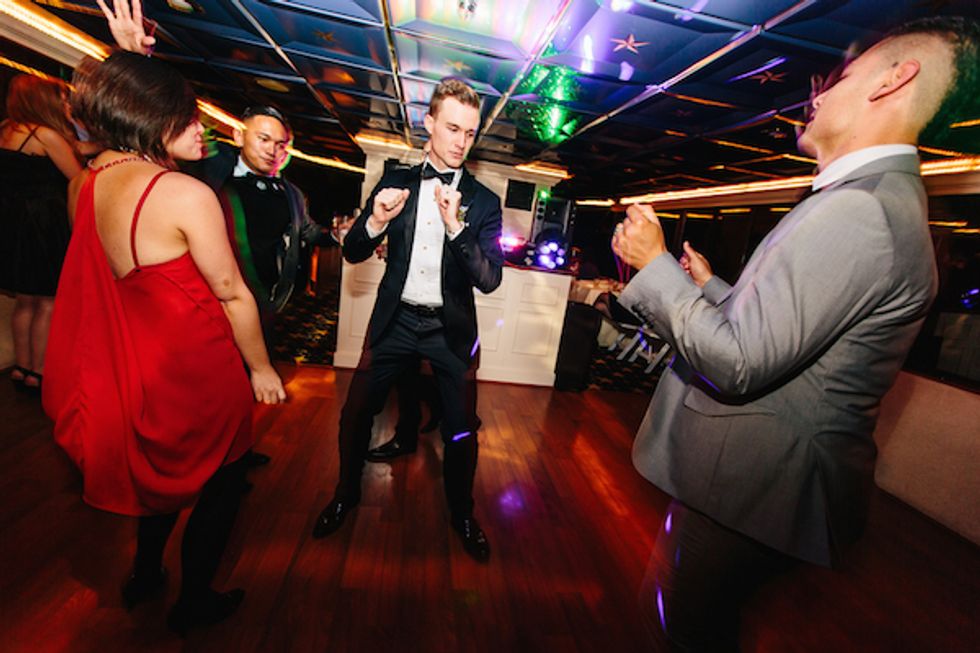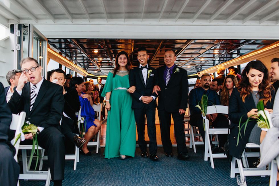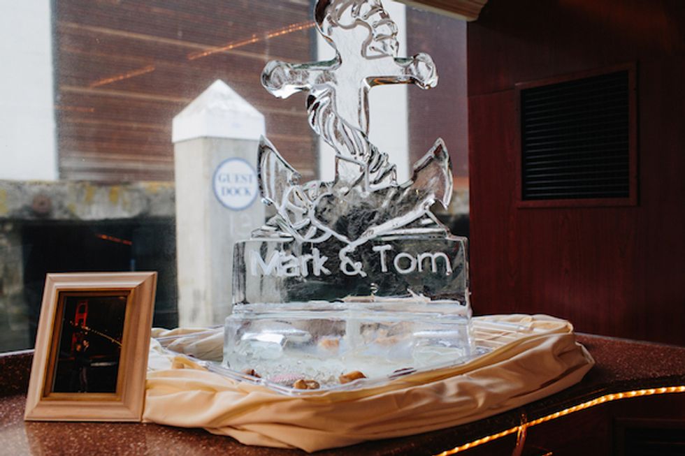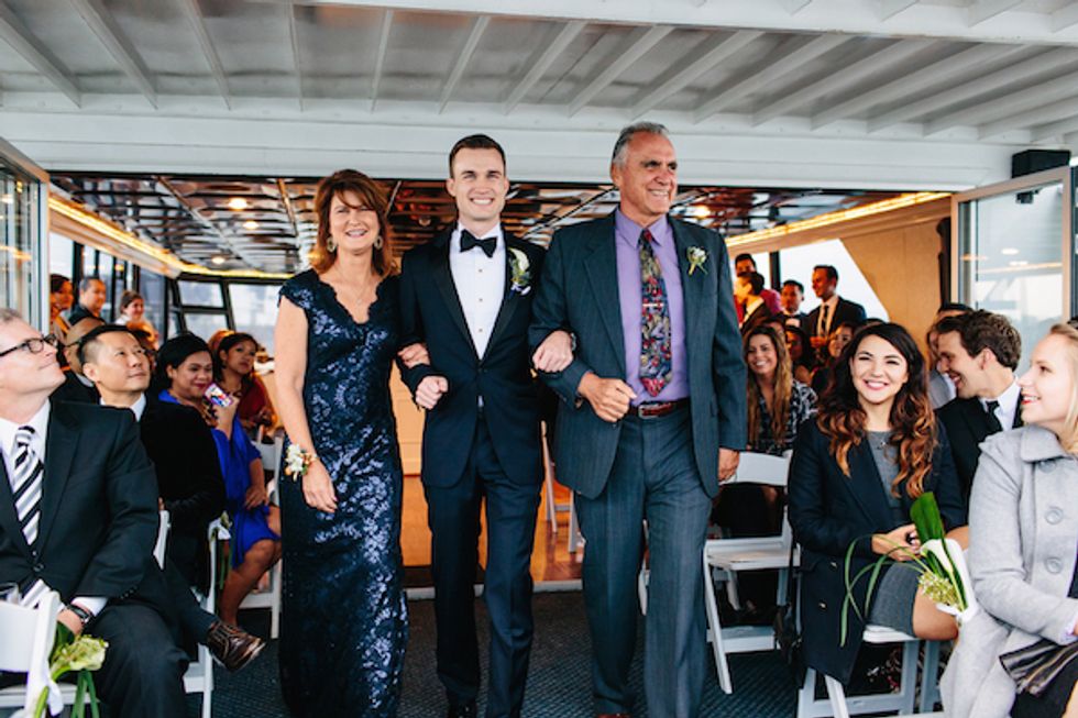 On the day of the nautical nuptials, Mark welcomed his sister and Thomas welcomed his mother into their respective dressing rooms, straightening ties, fixing hair, and giving hugs. Once the music played and it was time to get the show on the road, the gentlemen began their walk down the aisle, arms linked—Thomas with his parents and Mark with his brother and sister. I dos were recited and kisses exchanged, and before the party started, the newly married couple enjoyed a secluded moment on the yacht.
