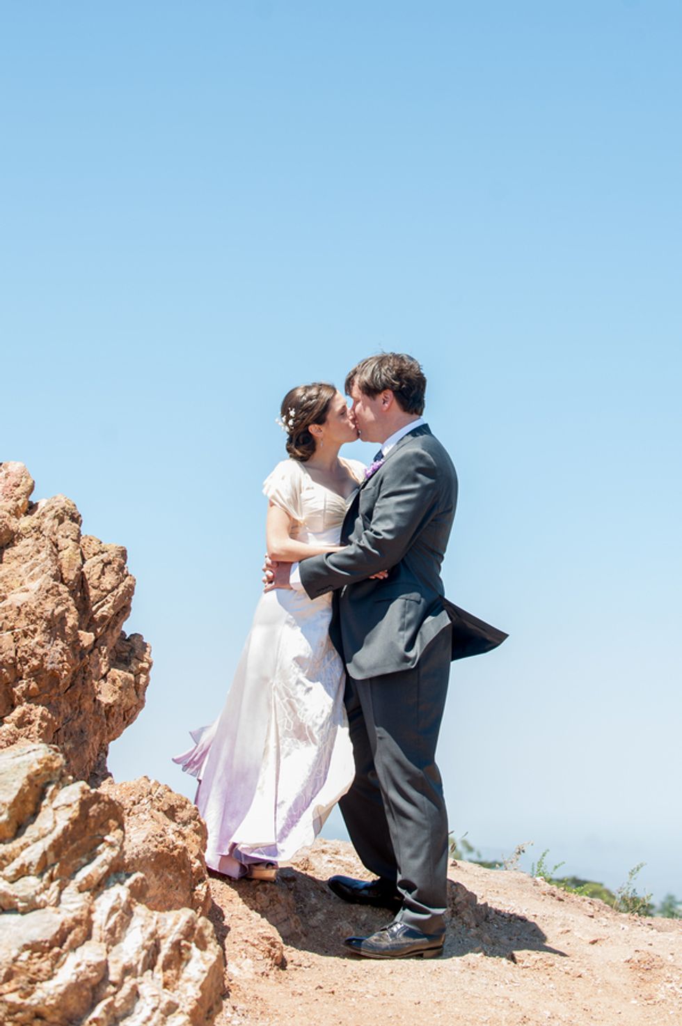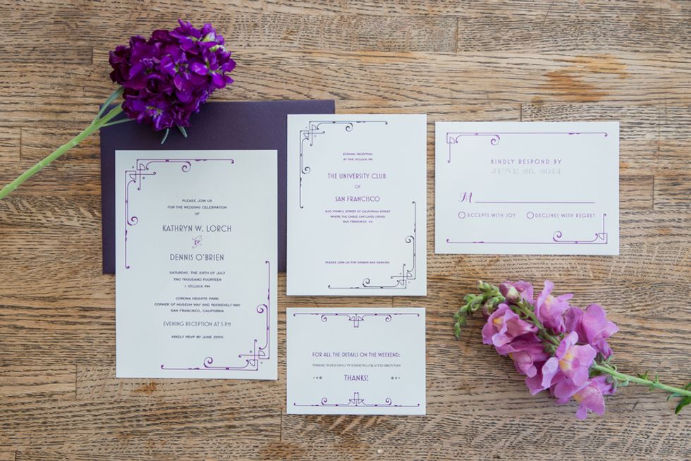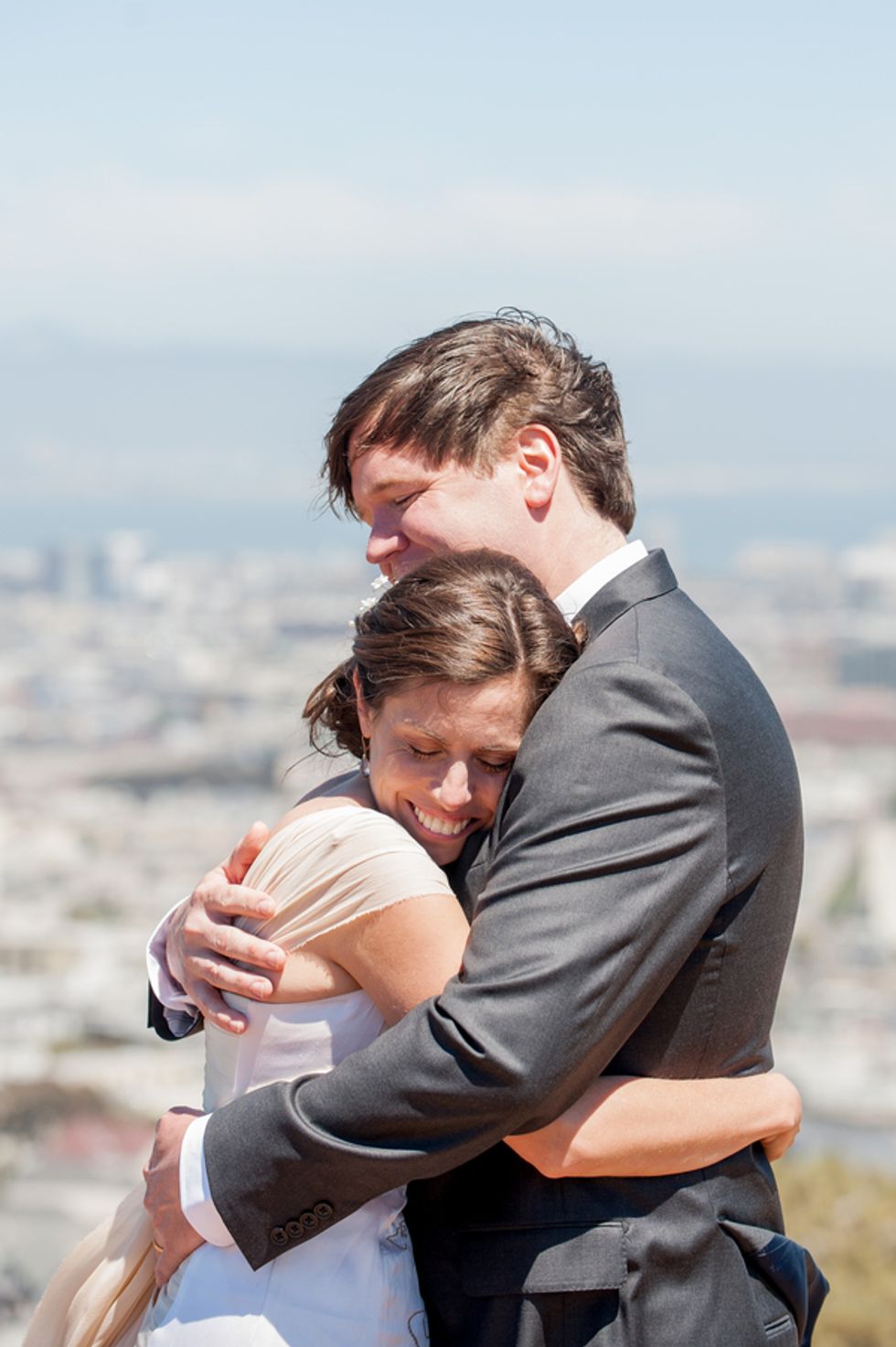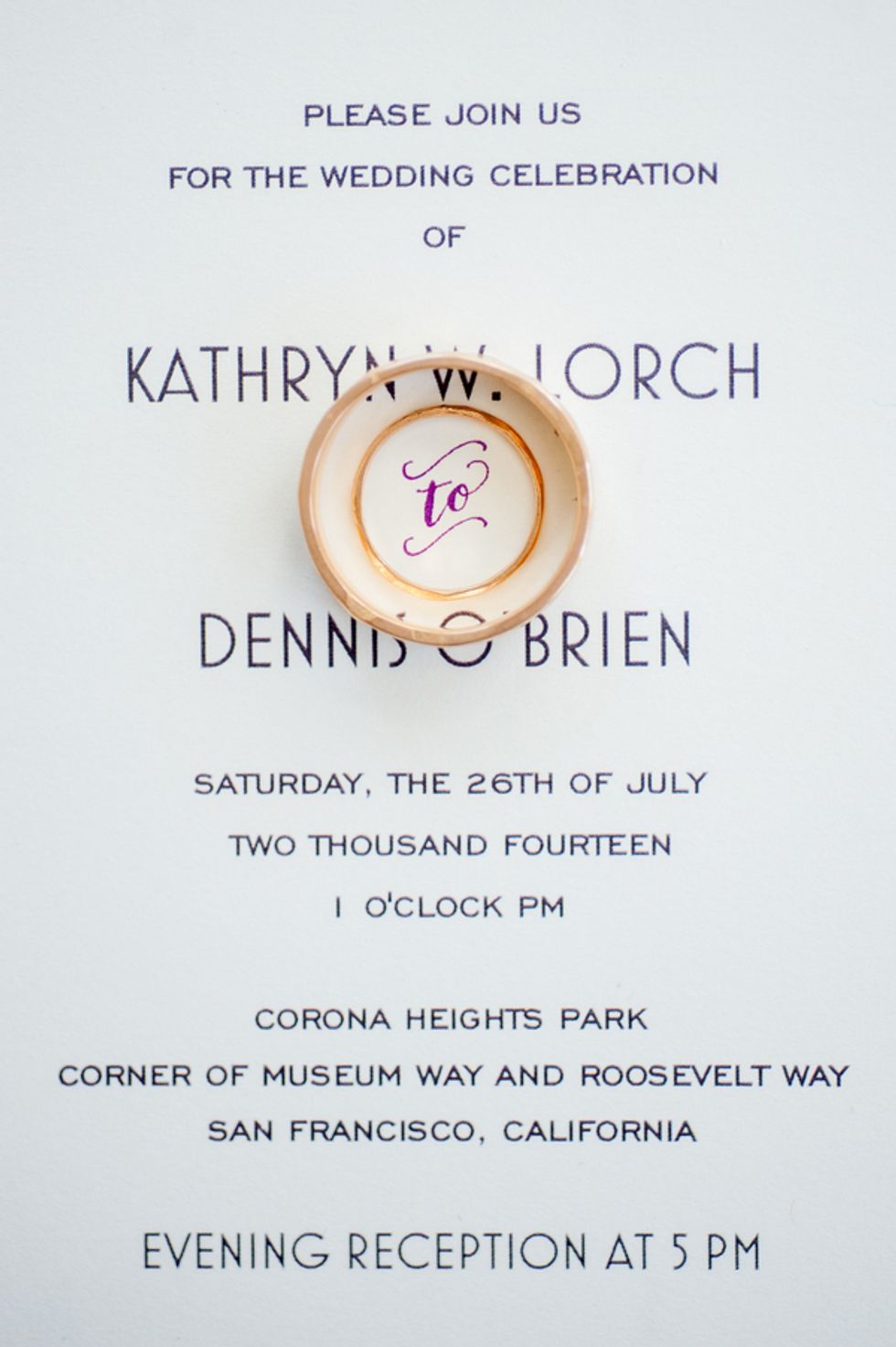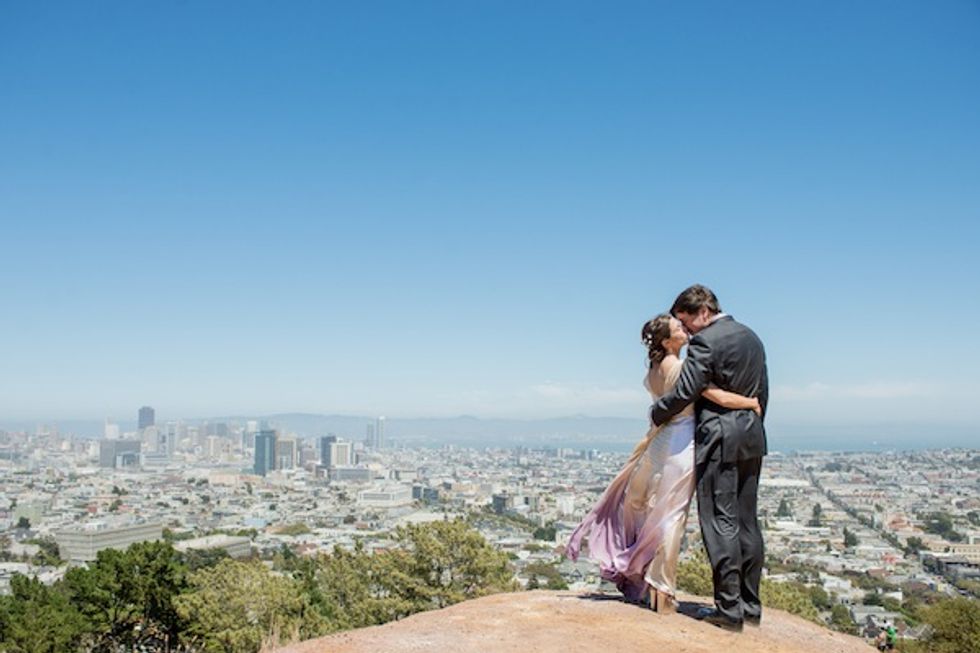 From the ceremony, the guests were ushered to the top of Corona Heights Park for gorgeous views of the city, and then on to the University Club, where the reception proved to be a real party: Kate's family sang “Our House" to cement the union, Dennis' brother used a line from Prince in his speech, and the vows included a moment of silence to contemplate nature. And then, as a surprise to everyone but the couple, a brass band burst into the space and led the guests downstairs to dance the night away.