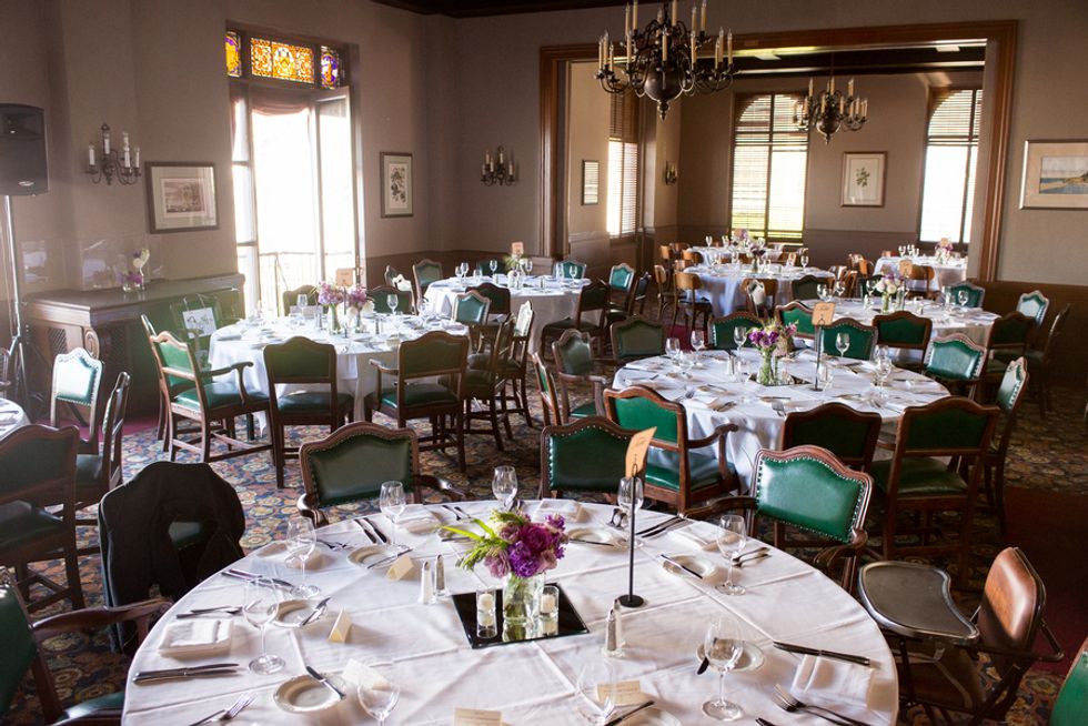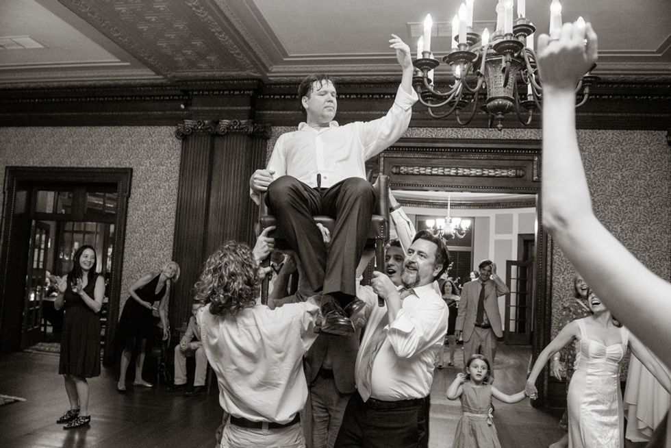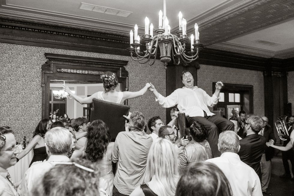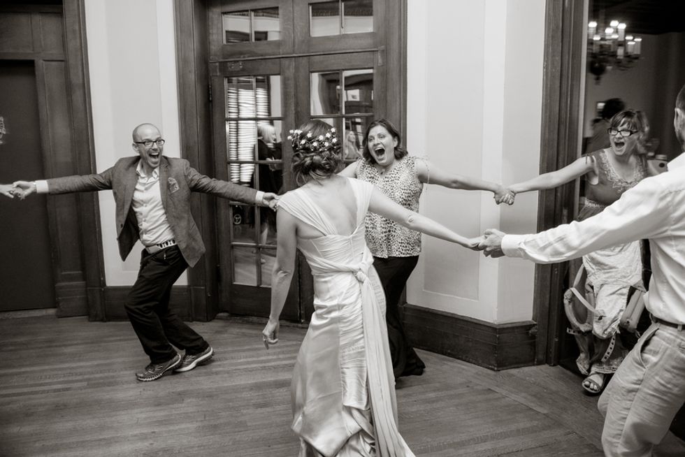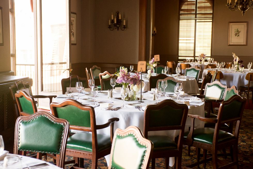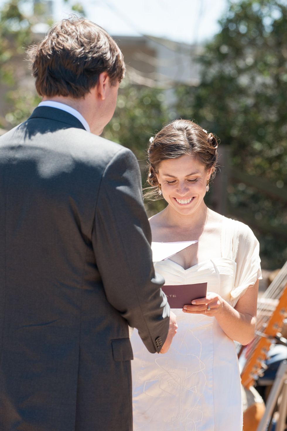 From the ceremony, the guests were ushered to the top of Corona Heights Park for gorgeous views of the city, and then on to the University Club, where the reception proved to be a real party: Kate's family sang “Our House" to cement the union, Dennis' brother used a line from Prince in his speech, and the vows included a moment of silence to contemplate nature. And then, as a surprise to everyone but the couple, a brass band burst into the space and led the guests downstairs to dance the night away.