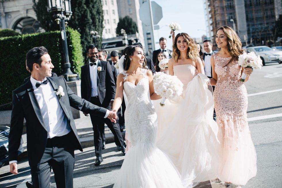 The entire ceremony was swathed in gold and ivory with gilded chairs under the towering ceilings of the museum. Along the aisles were bouquets tied to each row with just a single pop of blush. At the alter was a stunning spread of florals, a mirror, and seats for the bride and groom. Under a soaring chandelier, the two placed rings on each other's fingers and then sashayed back down the aisle and through a hallway of alabaster curtains. There was no getting away with not seeing some of the sights for their destination wedding, so they took to the streets for photos, strolling through the gardens in front of San Francisco City Hall.