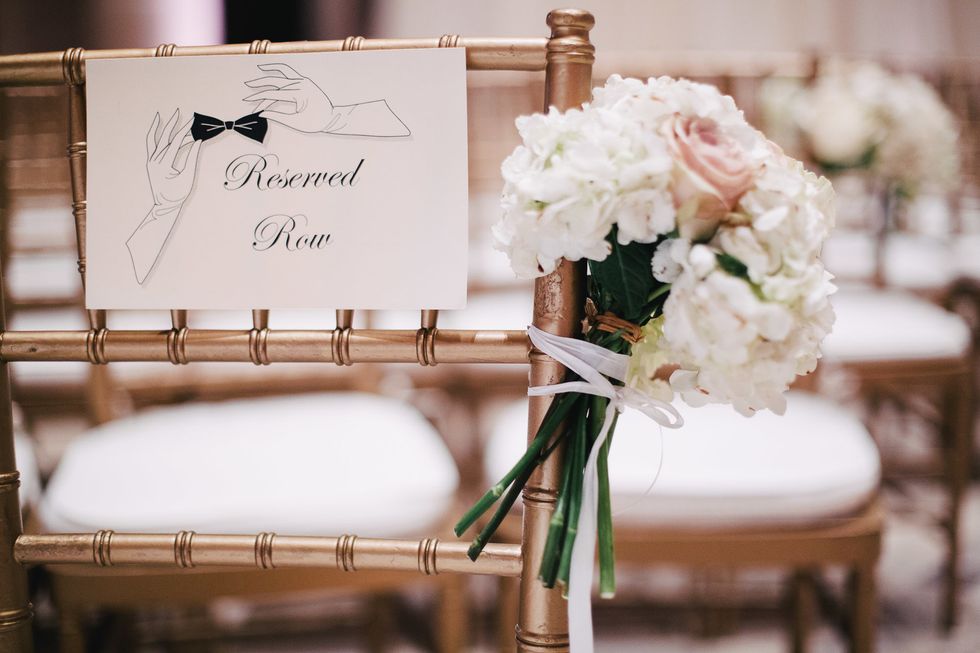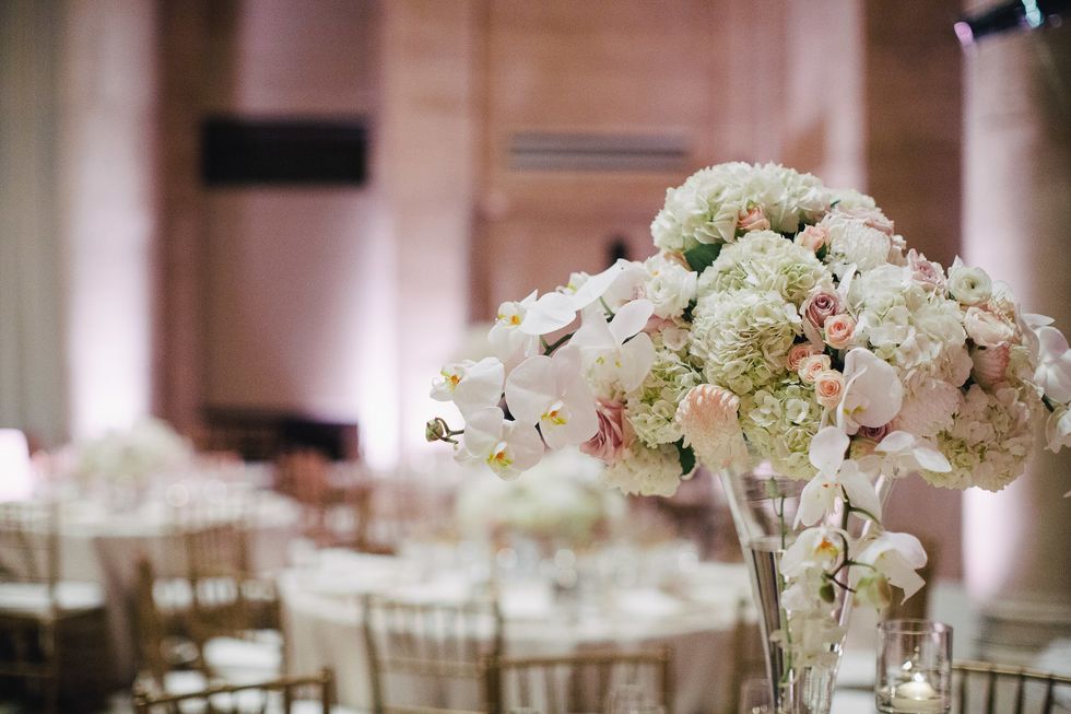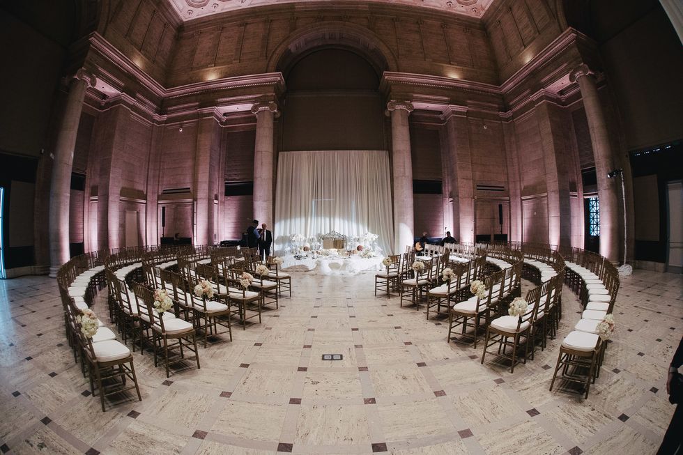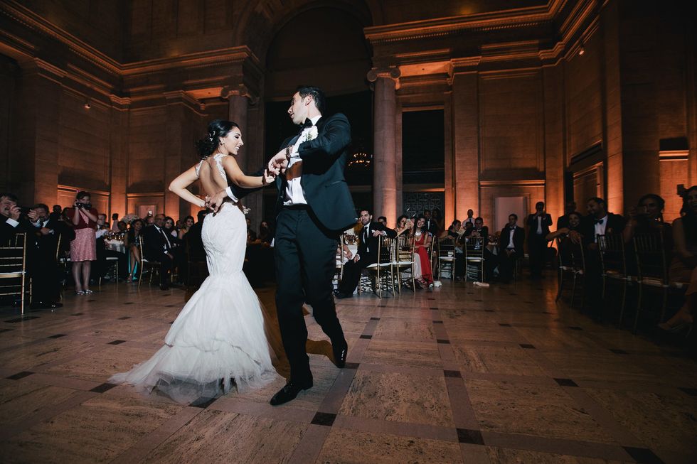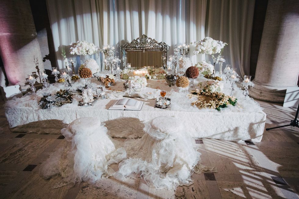 The same neutral palette permeated the reception back at the museum with the same gilded chairs with matching tableware. An abundance of bursting florals in ivory and blush made up a collection of centerpieces, but the museum's beaux-arts architecture was otherwise left to shine on its own. The newlyweds danced, noshed on an array of bites including mini crème brûlée cups in addition to their four-tiered cake, and then moved to Sydney to live happily ever after.