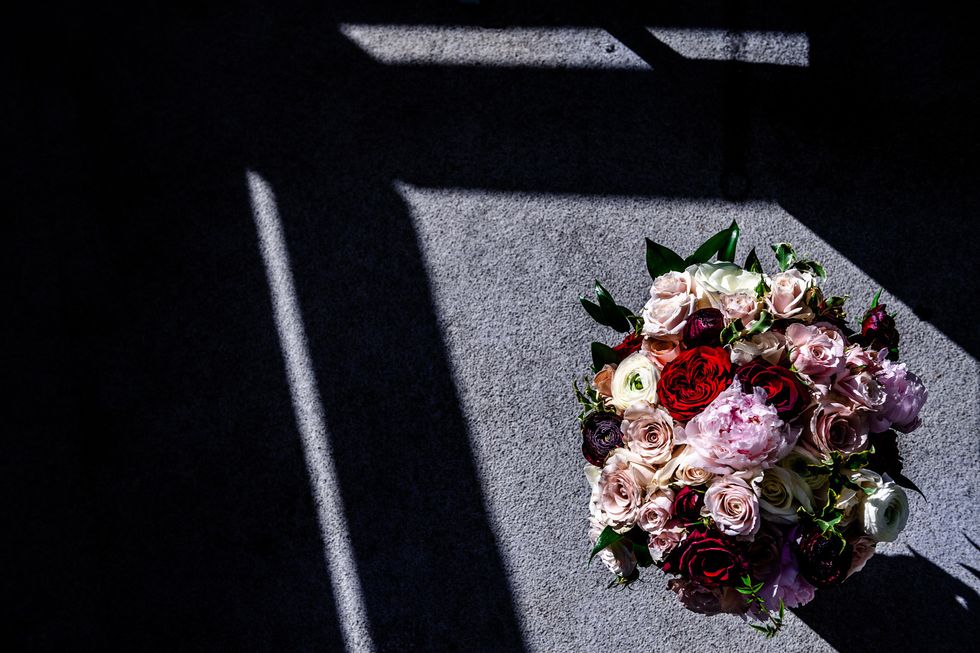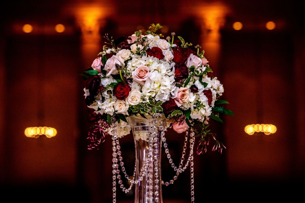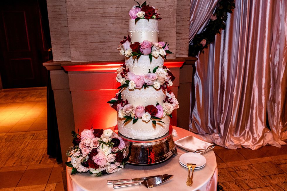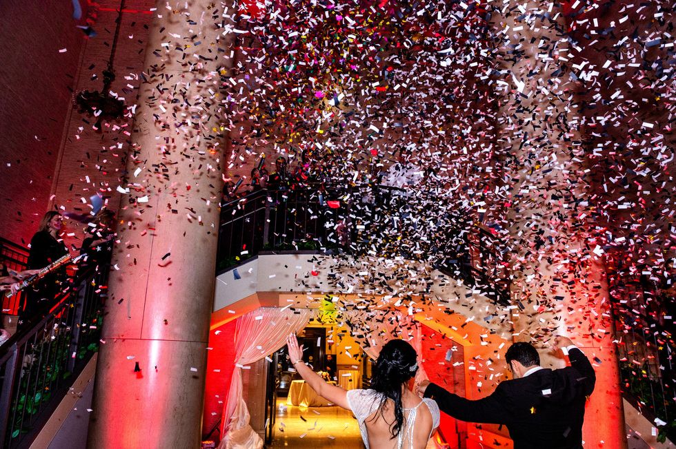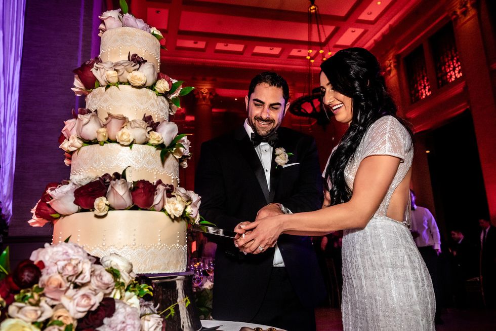 At the reception, colorful roses and peonies adorned the tables alongside metallic accents—gilded chairs, vases, candle holders, and silverware paired with silver napkins and tablecloths. The same crimson, blush, and ivory blooms made their way onto their four-layer cake. At their sweetheart table, the newlyweds cried and laughed their way through speeches, and then partied like rockstars as a saxophonist serenaded them on the dance floor and a torrent of confetti came raining down—quite the way to ring in married life!