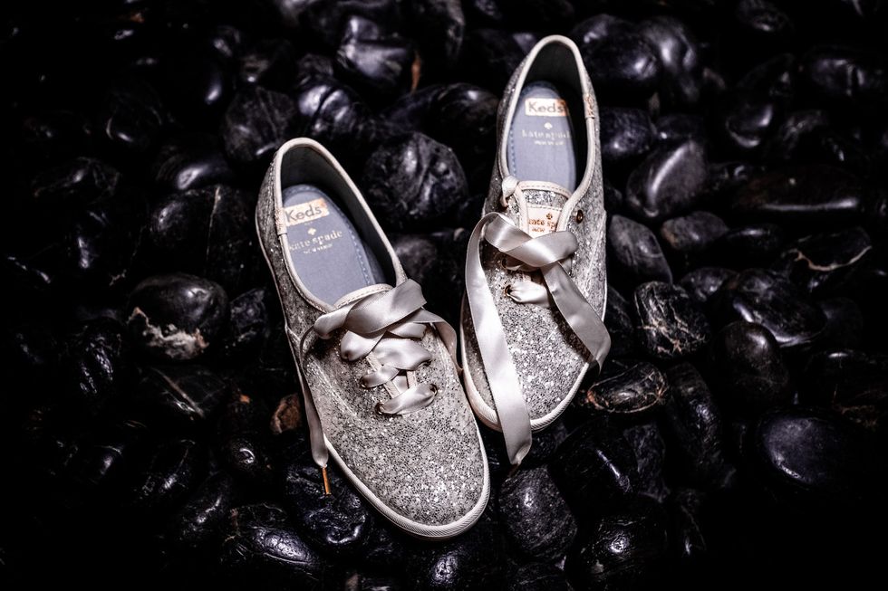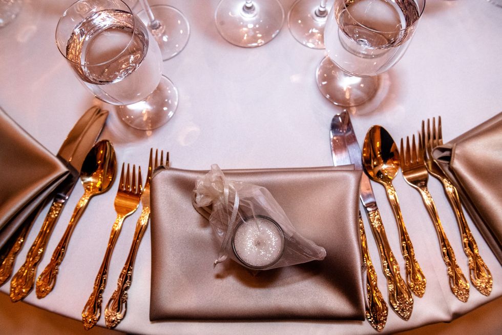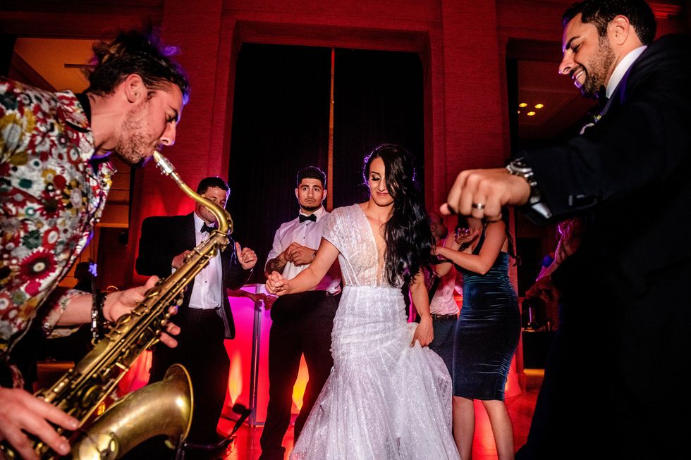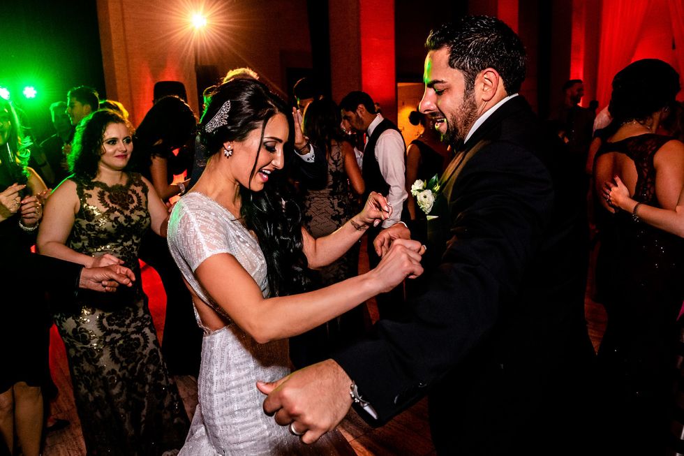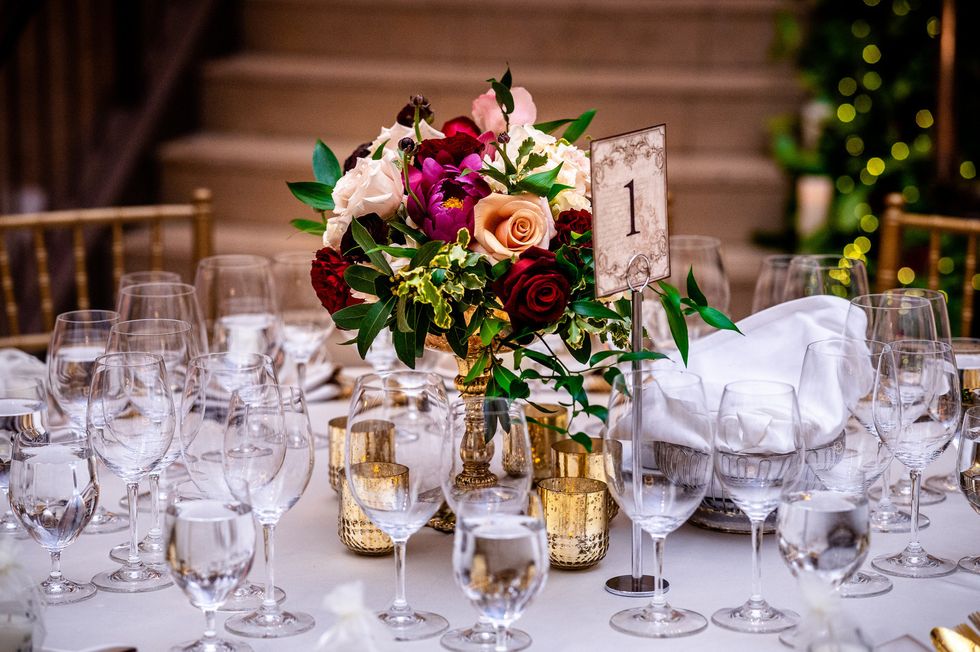 At the reception, colorful roses and peonies adorned the tables alongside metallic accents—gilded chairs, vases, candle holders, and silverware paired with silver napkins and tablecloths. The same crimson, blush, and ivory blooms made their way onto their four-layer cake. At their sweetheart table, the newlyweds cried and laughed their way through speeches, and then partied like rockstars as a saxophonist serenaded them on the dance floor and a torrent of confetti came raining down—quite the way to ring in married life!