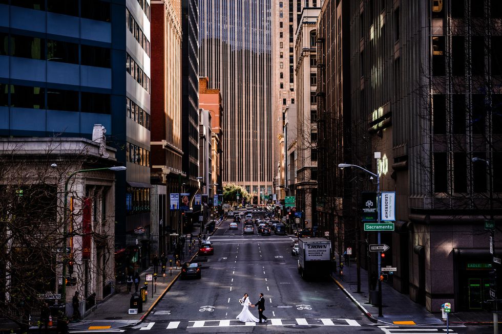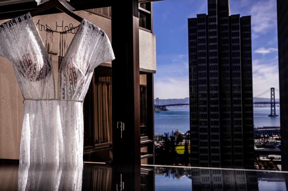 Once she was fastened into her sparkling gown and silk Louboutins, the bride joined her groom made for first looks downstairs, and then out to Sacramento Street for photo ops among the neighborhood's iconic architecture.
