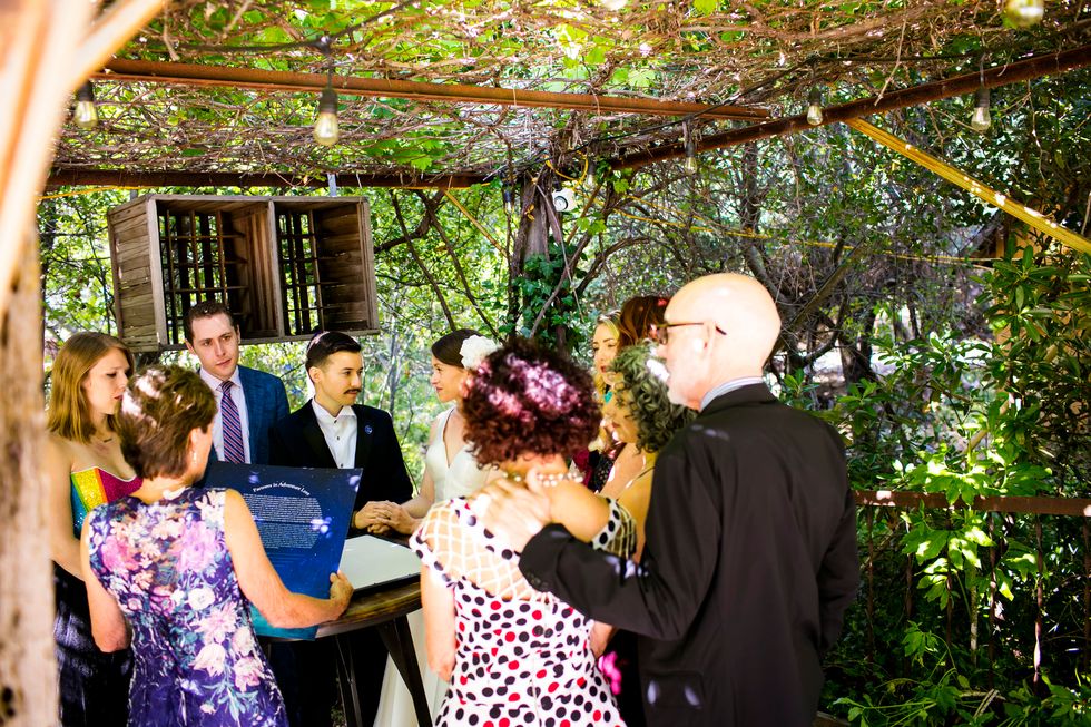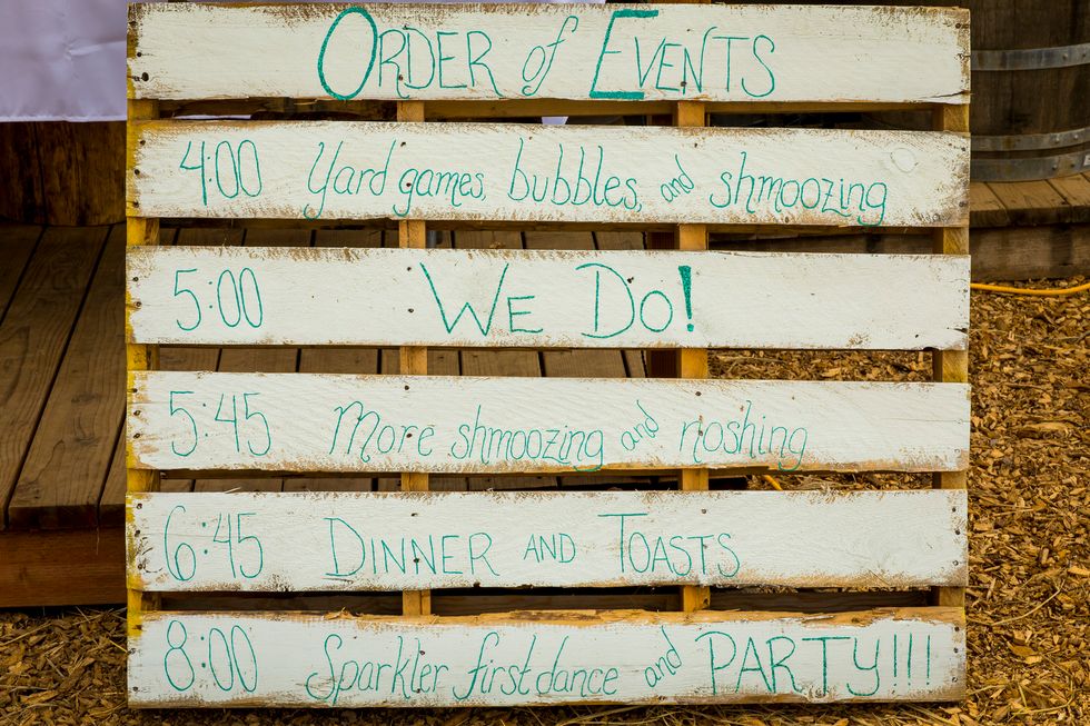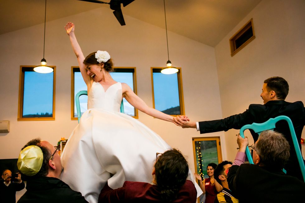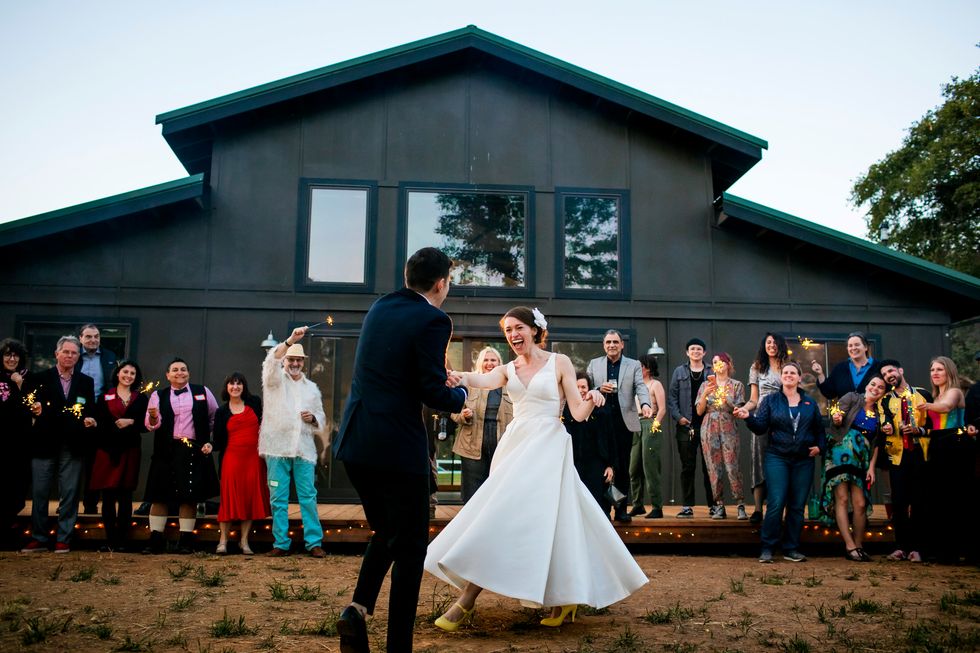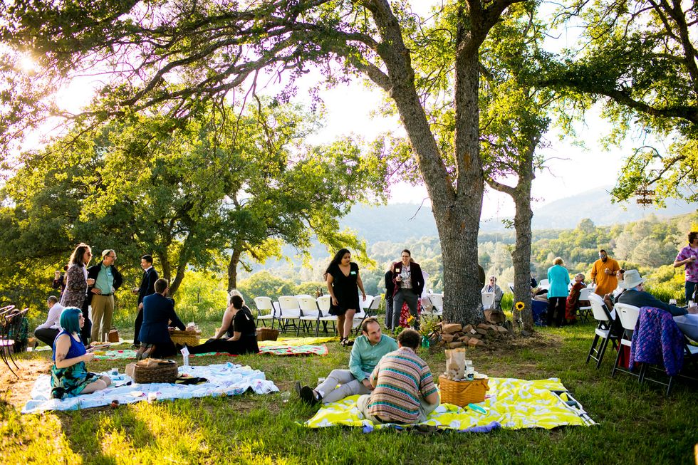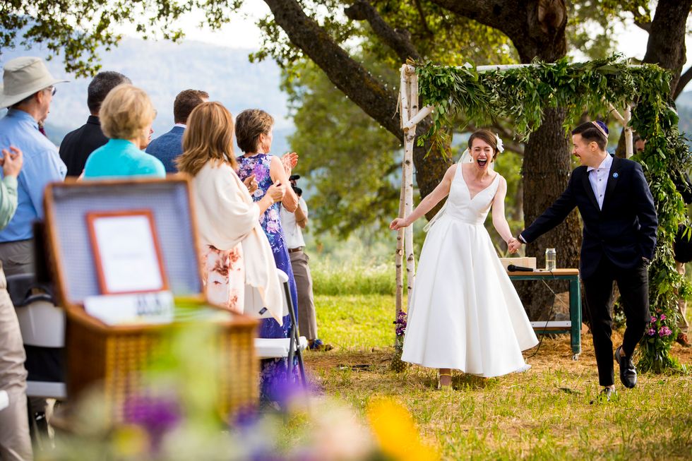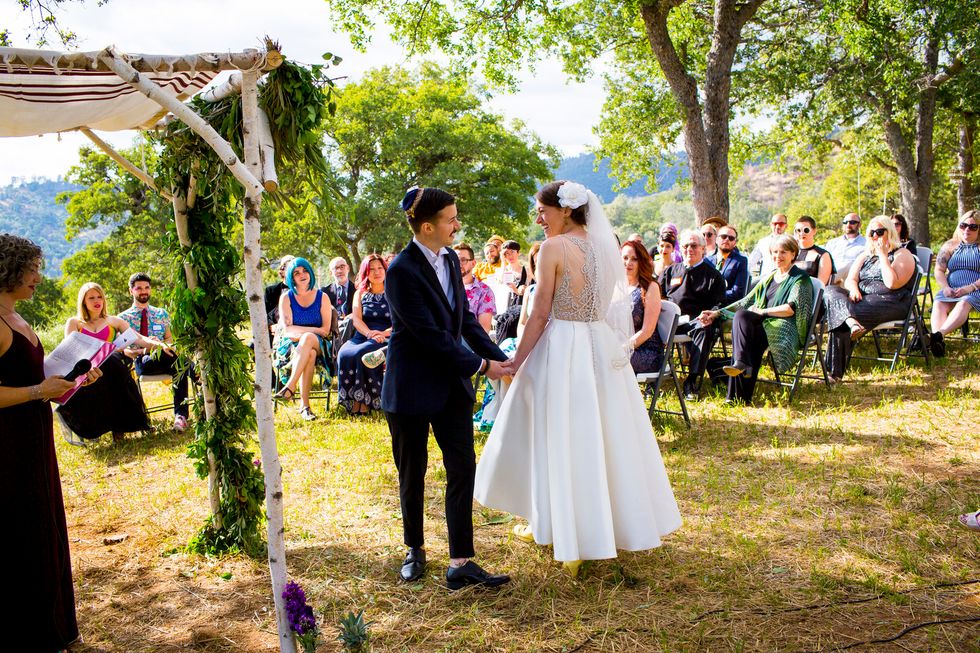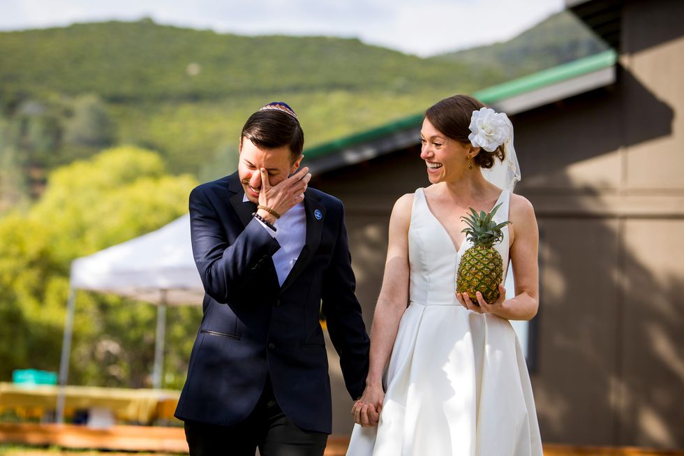 Traditional met quirky in their picnic-style bash with Jewish traditions including ketubah signing, the seven blessings, smashing the wine glass at the end of the ceremony, "yihud" (private time right after the ceremony), and horah dancing; and an eclectic assortment of personal touches and colorful attire. Following yard games and bubbles, the bride carried a pineapple down the aisle to a birch arch, adorned with lush foliage. A "seeding chart" showed guests to their blanket or table where they noshed on vegan Mexican fare complete with fresh agua fresca. Their friends also baked for several days to present a sprawling spread of pies and desserts. While the dance party began outside with sparklers, they took it indoors—along with the pastries—once the sun went down.