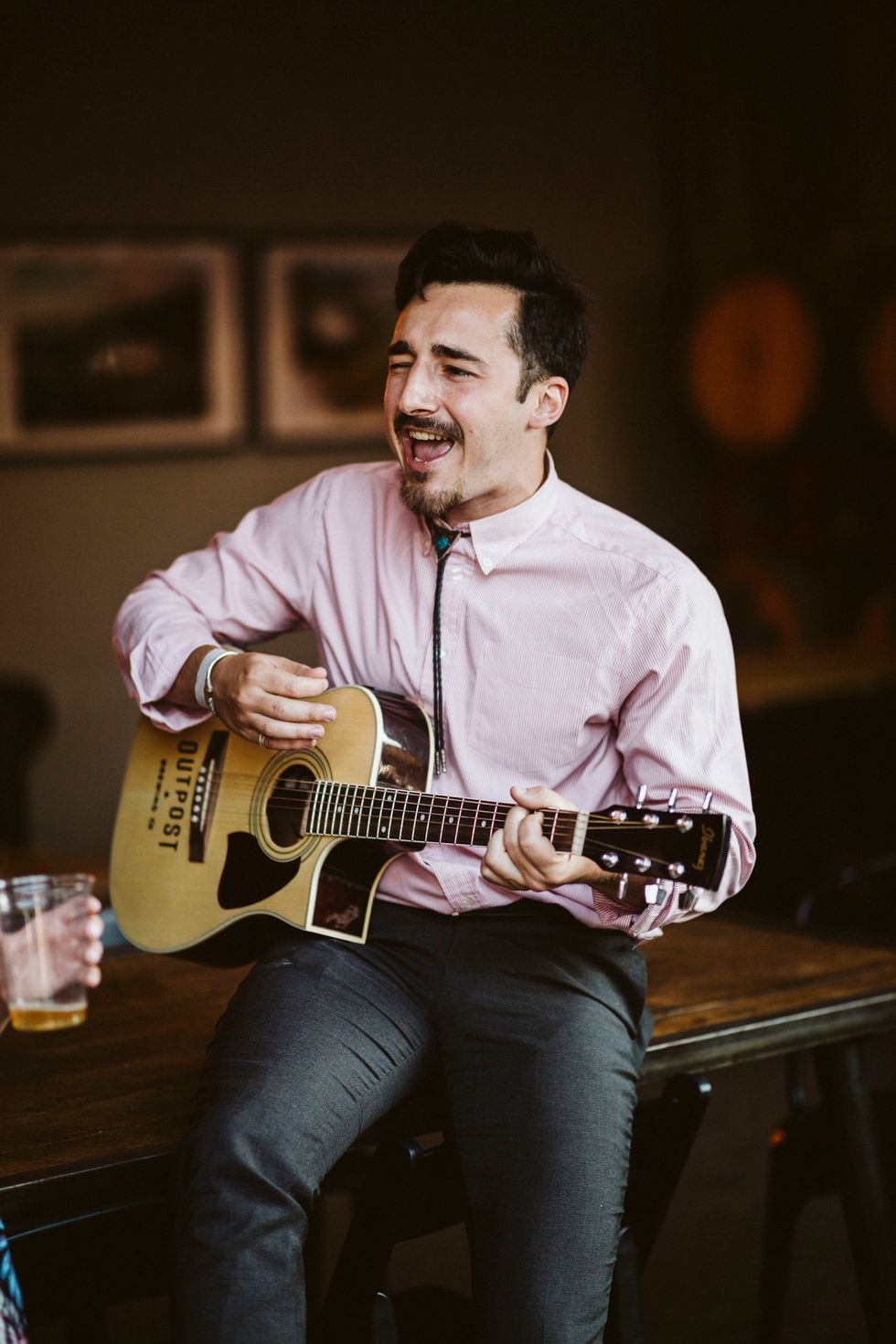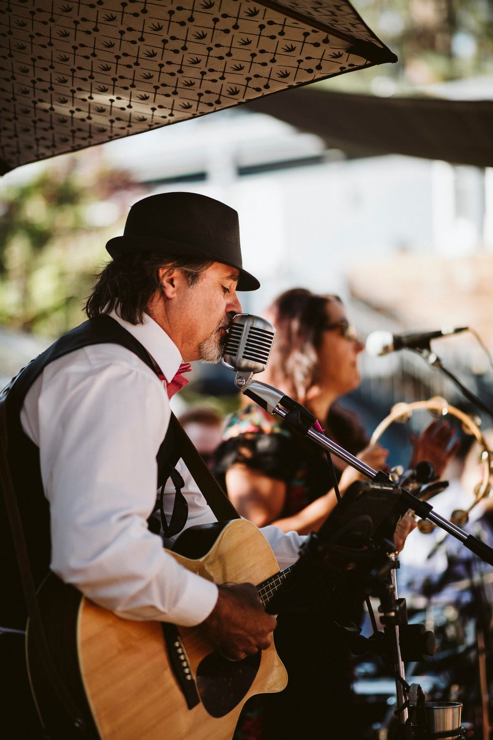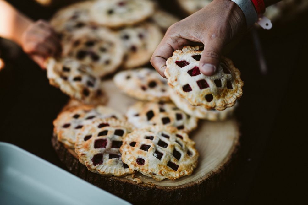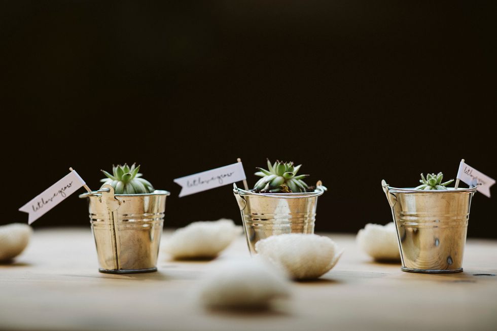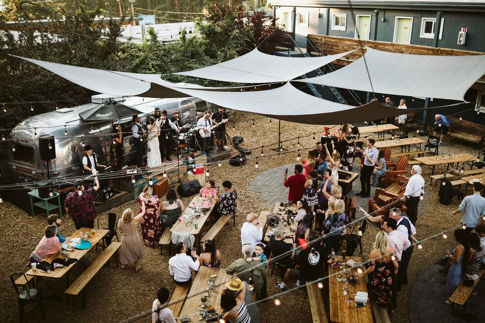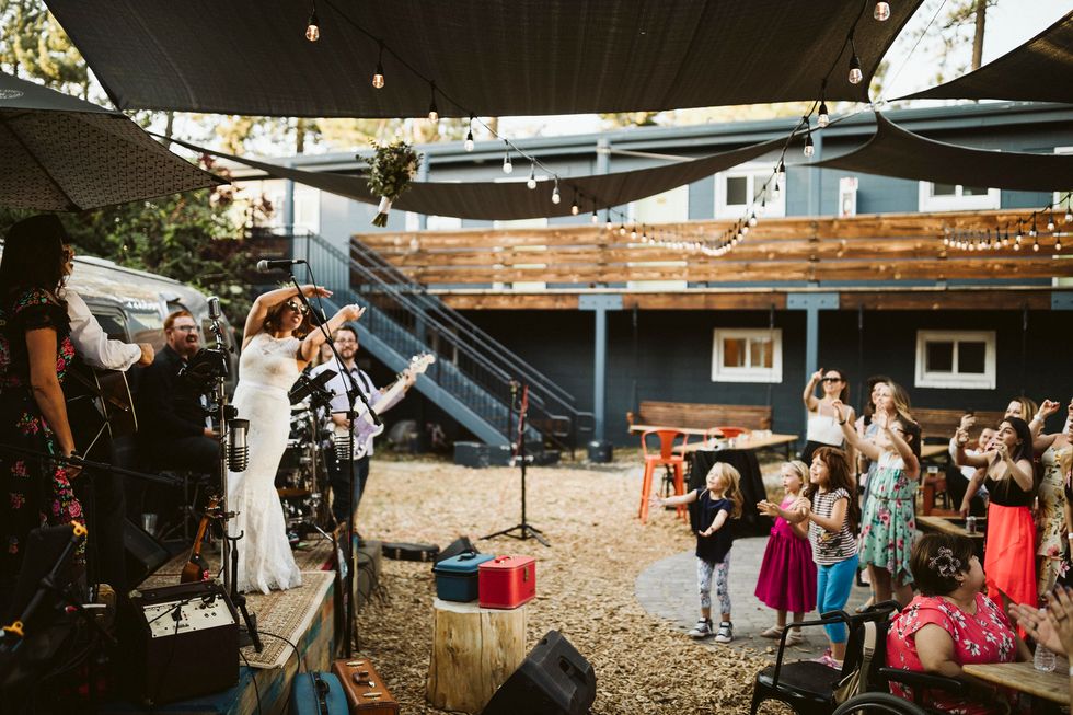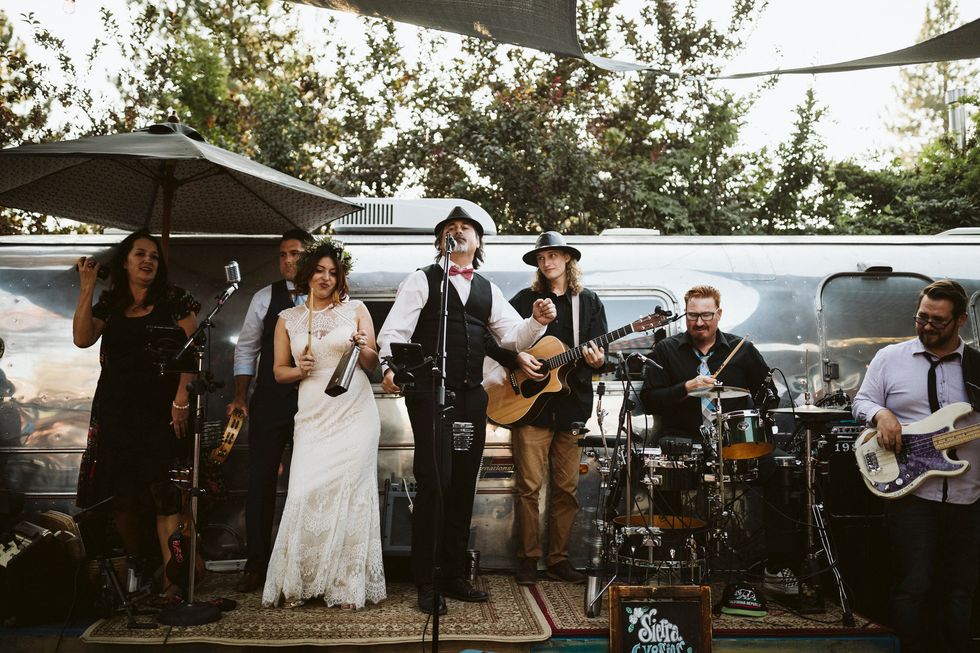 Reminiscent of a mini music festival, the reception included a live gypsy band playing in front of a vintage Airstream while the bride showed off her moves and played a cow bell. Wooden picnic tables bloomed with potted succulents, and string lights set the mood. For an added bit of sweetness, they served mixed berry hand pies for dessert.