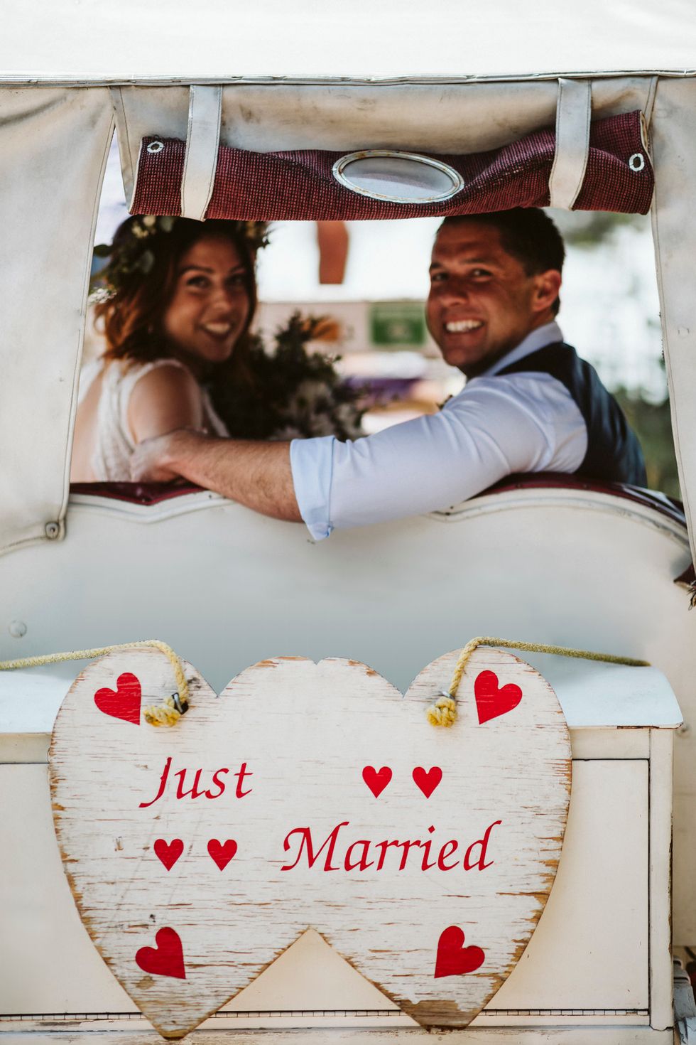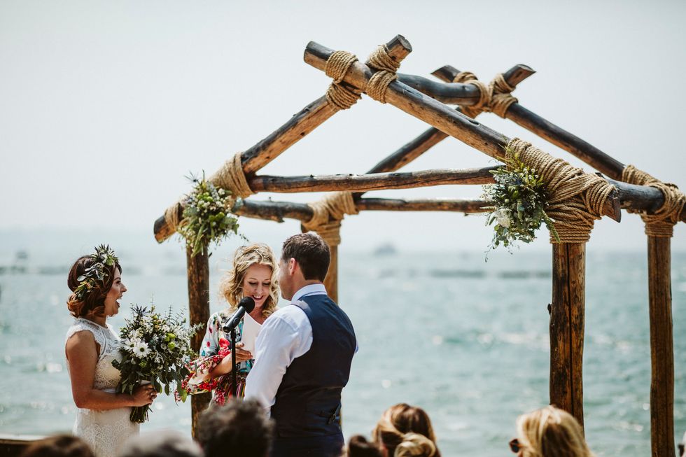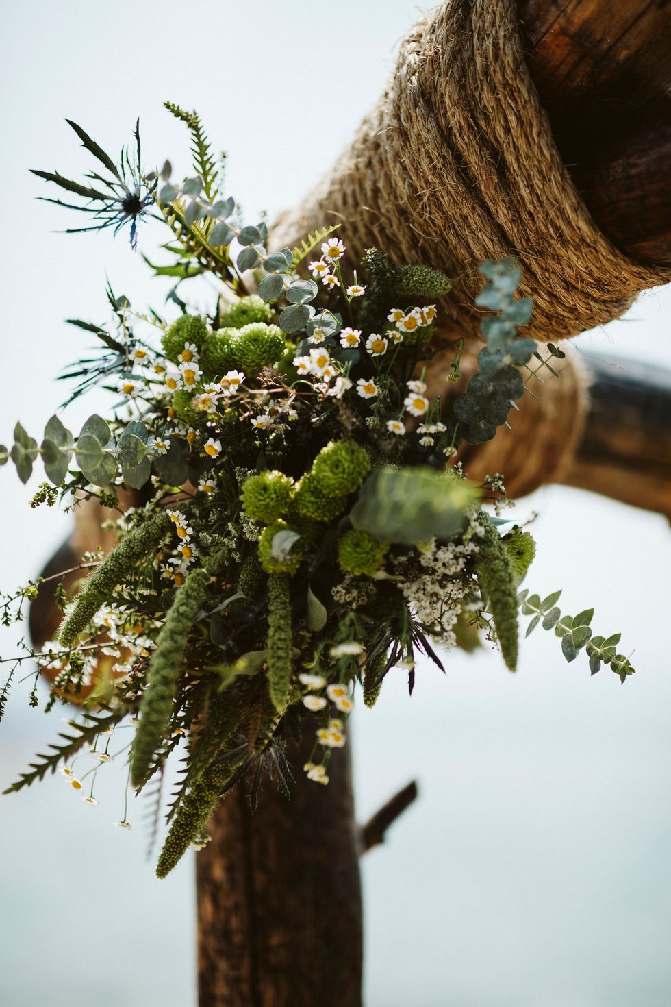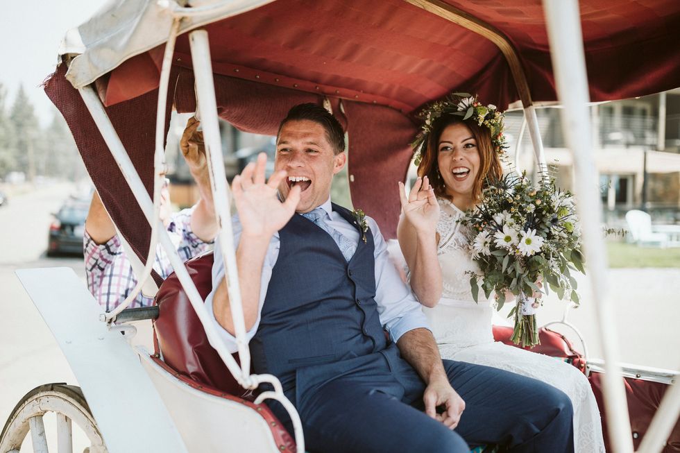 The bride, adorned with a flower crown, arrived on the scene in a Clydesdale-drawn carriage, and the pair said I do beneath a rustic arch adorned with wild blooms including eucalyptus, black foot daisies, and cattails.
