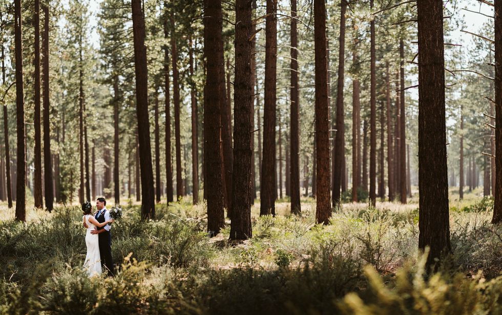 To celebrate their nine years of love, the bride and groom let loose in a laid-back ceremony on the waterfront at Lake Tahoe, and they kept it short and sweet, ready to get the party started. But first, a frolic in the woods for sun-soaked, forested portraits before joining their friends and family and a down-to-earth beer garden bash at Tahoe's Basecamp Hotel.