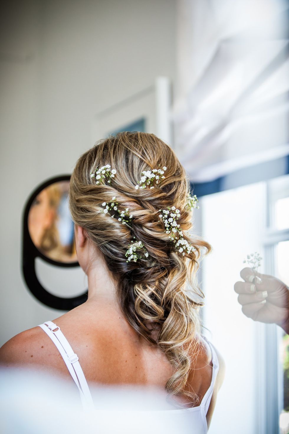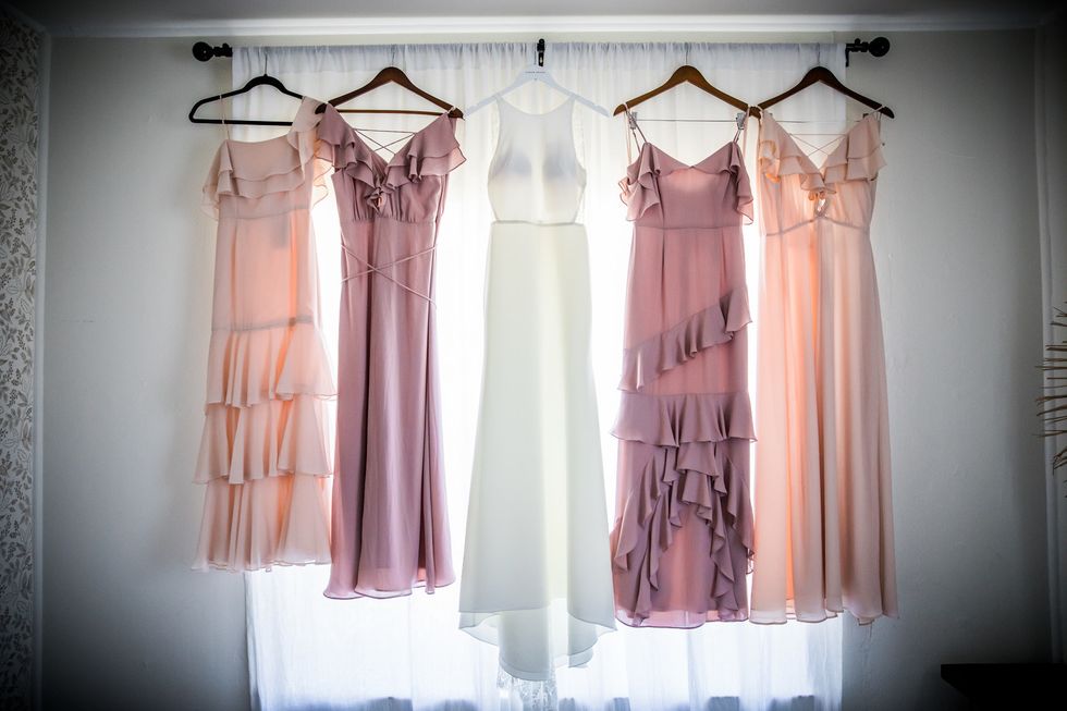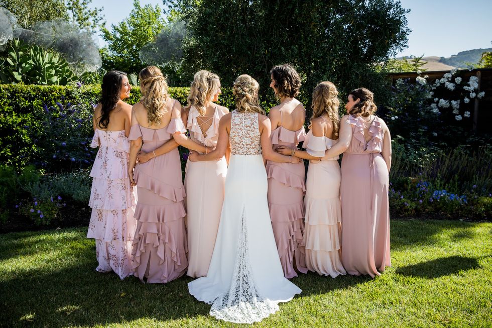 In a "minimalist California look," Severe strolled down the aisle in a high neck, fitted gown with baby's breath tucked into curled locks. The bridal party, adorned in floor-length blush frocks, held loose bouquets bursting with pinks, purples, and a pop of orange.