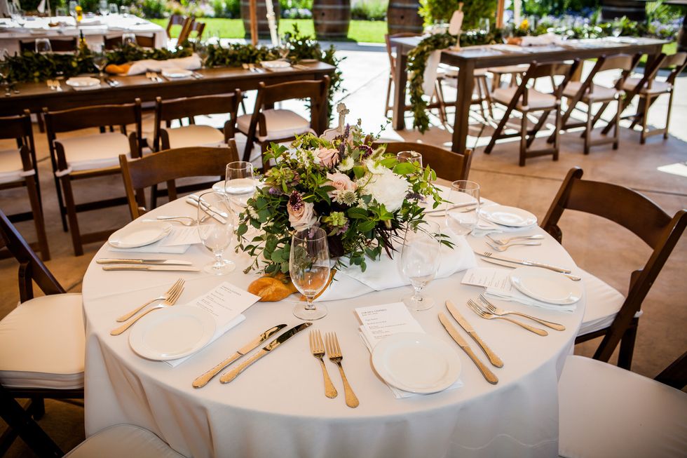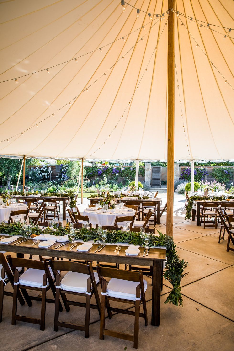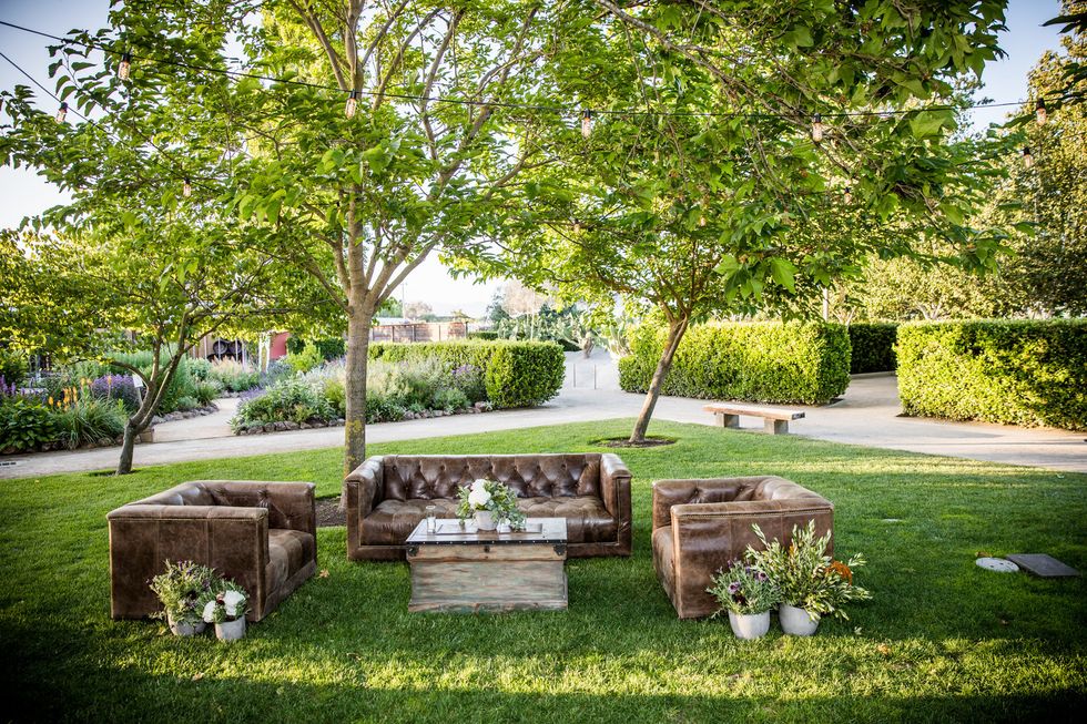 Capturing the essence of the valley, the two selected the iconic Cornerstone Sonoma for an elevated al fresco ceremony overlooking the vineyards. A spacious tent was erected for dinner and dancing, ad plush leather sofas were placed about for lounge-y vibes. Their "modern rustic" theme included wood tables, lots of candles and greenery, string lights, and a glittering chandelier.