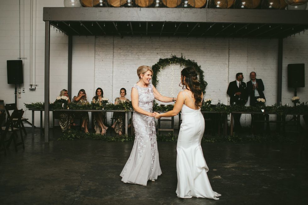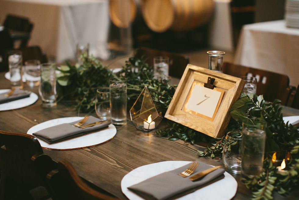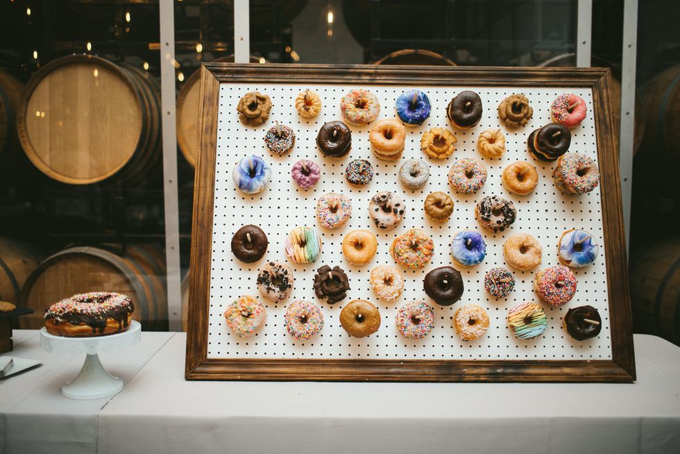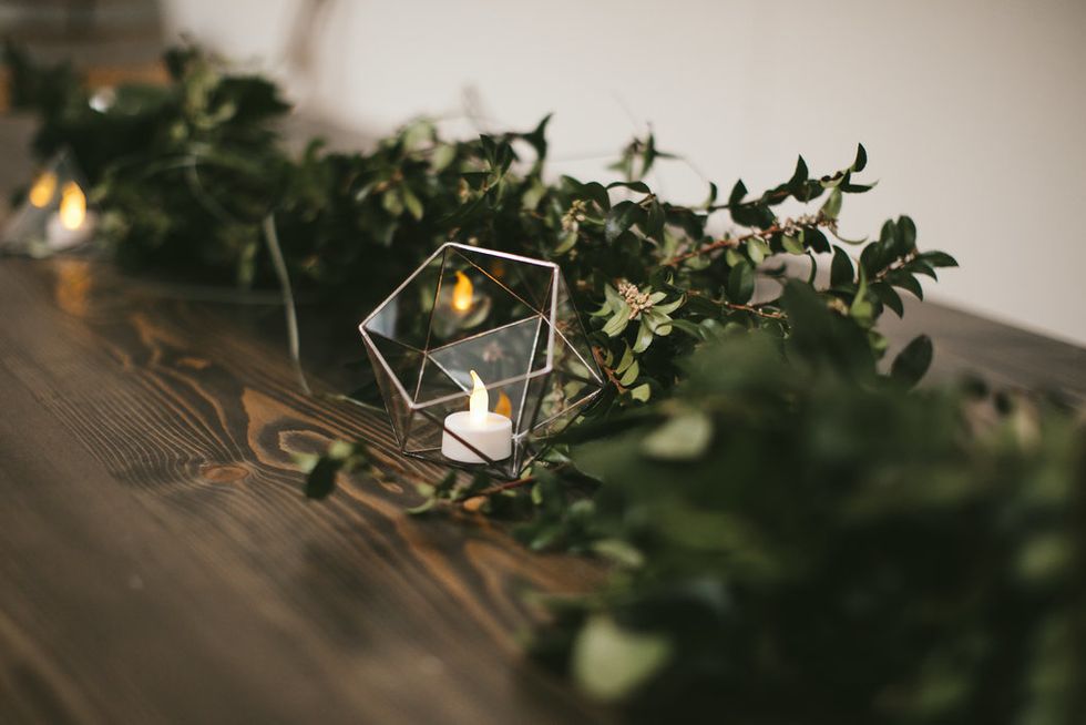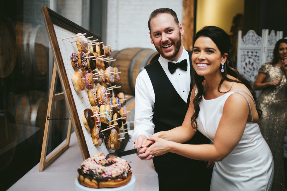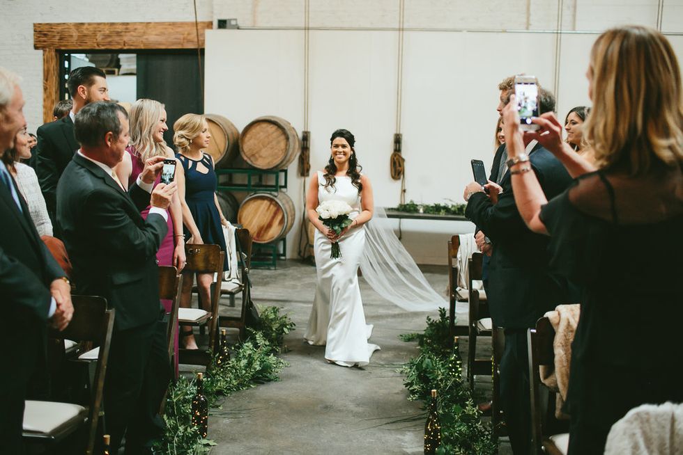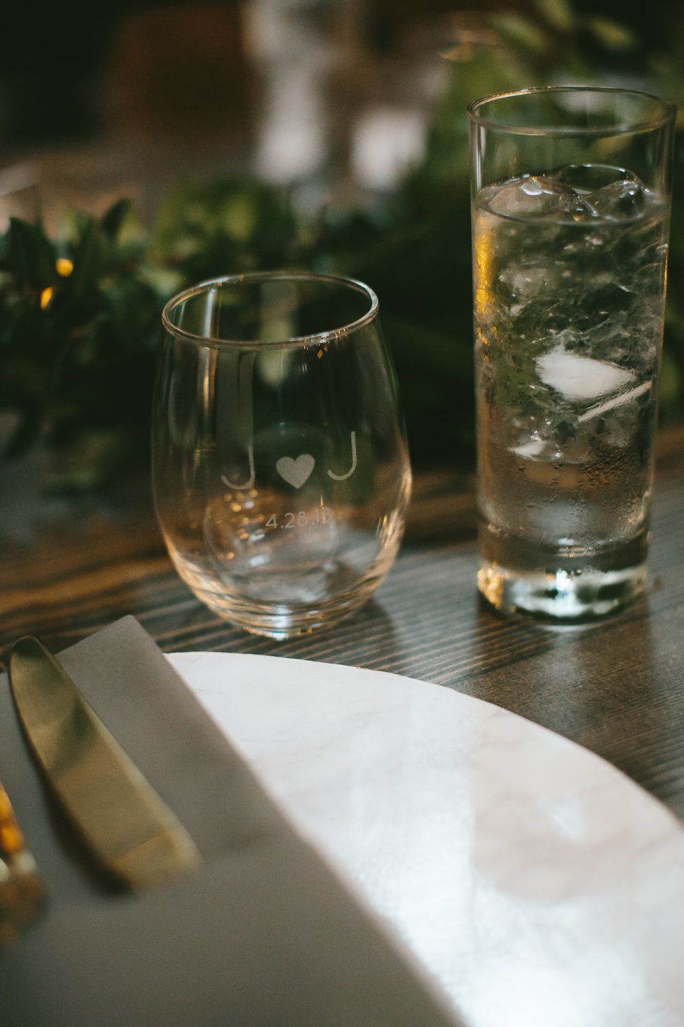 They rolled with the understated, industrial look of the place, seeking to complement its natural woods and unique lighting with lots of fresh green garlands and metallic details. The bridal party's bouquets were simple and chic with a handful of ivory roses. Tea lights in geometric glass containers and monogrammed glasses were speckled across the tables for added warmth. Ball's only two requirements: gold cutlery and donuts.