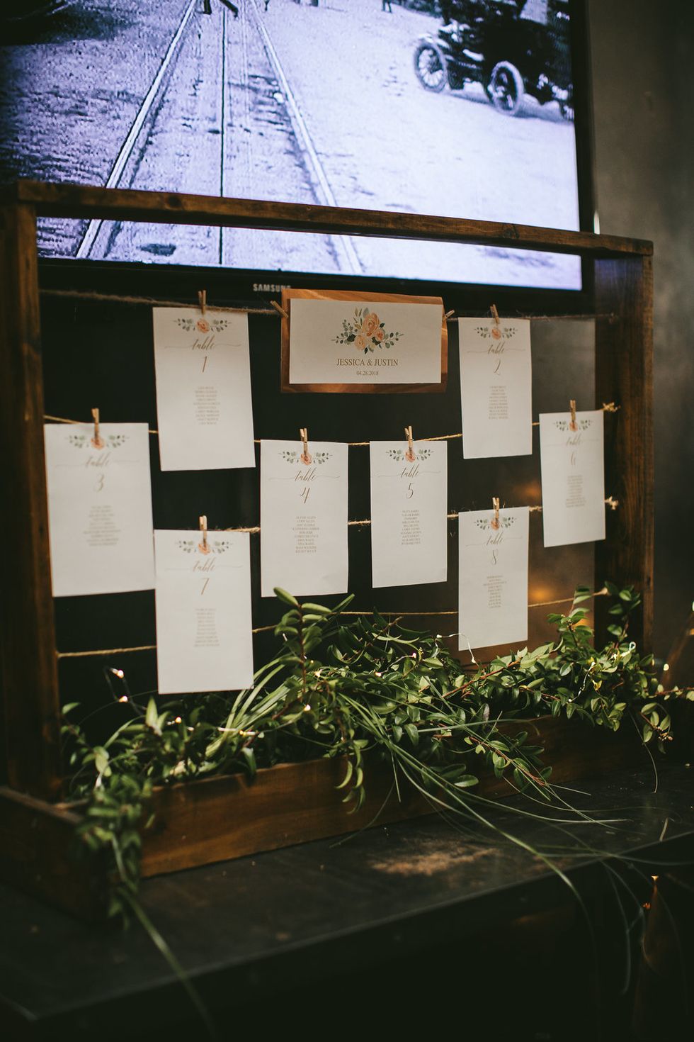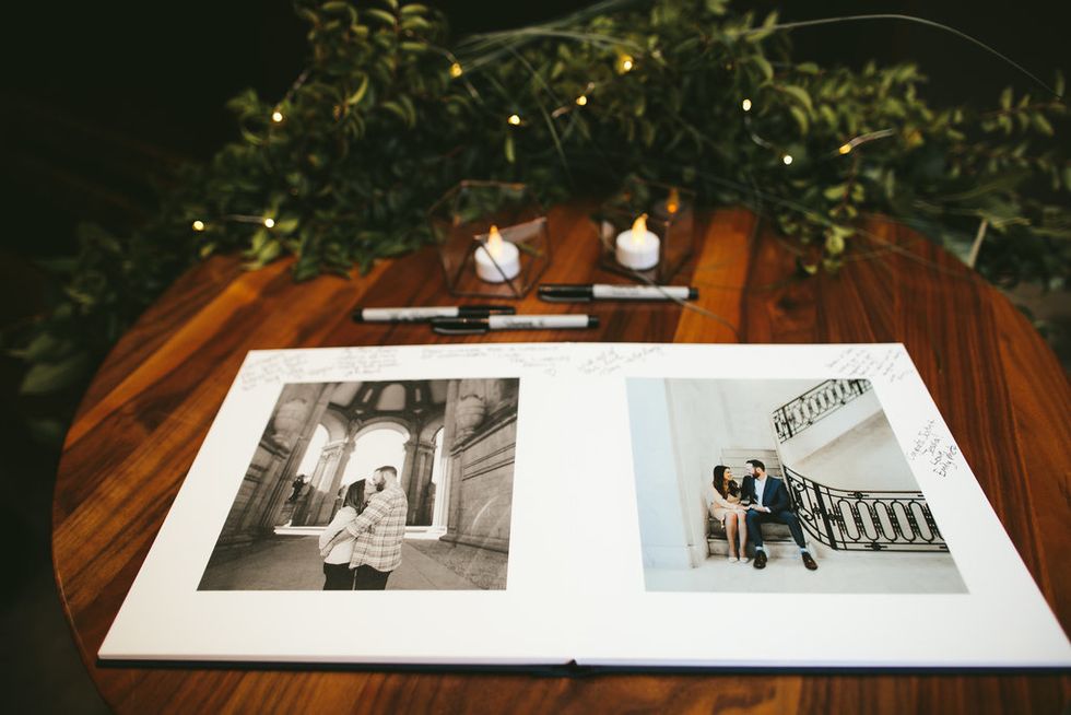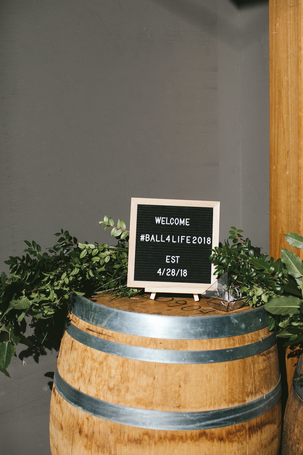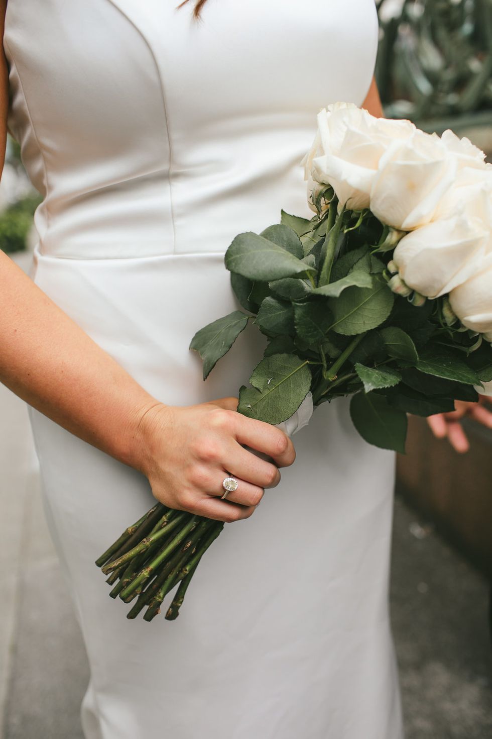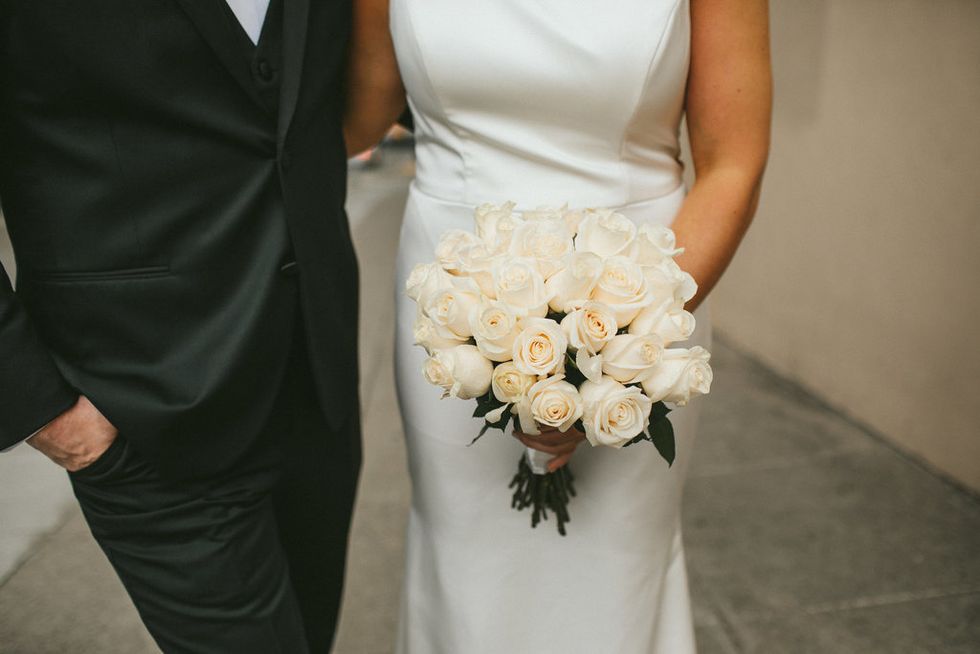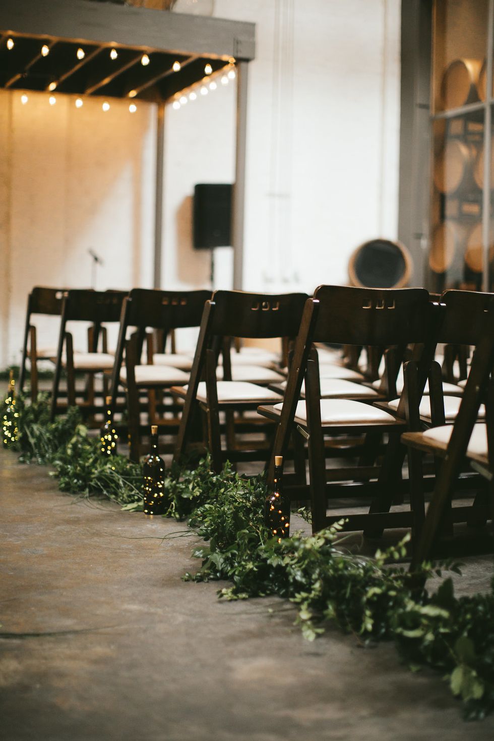 They rolled with the understated, industrial look of the place, seeking to complement its natural woods and unique lighting with lots of fresh green garlands and metallic details. The bridal party's bouquets were simple and chic with a handful of ivory roses. Tea lights in geometric glass containers and monogrammed glasses were speckled across the tables for added warmth. Ball's only two requirements: gold cutlery and donuts.