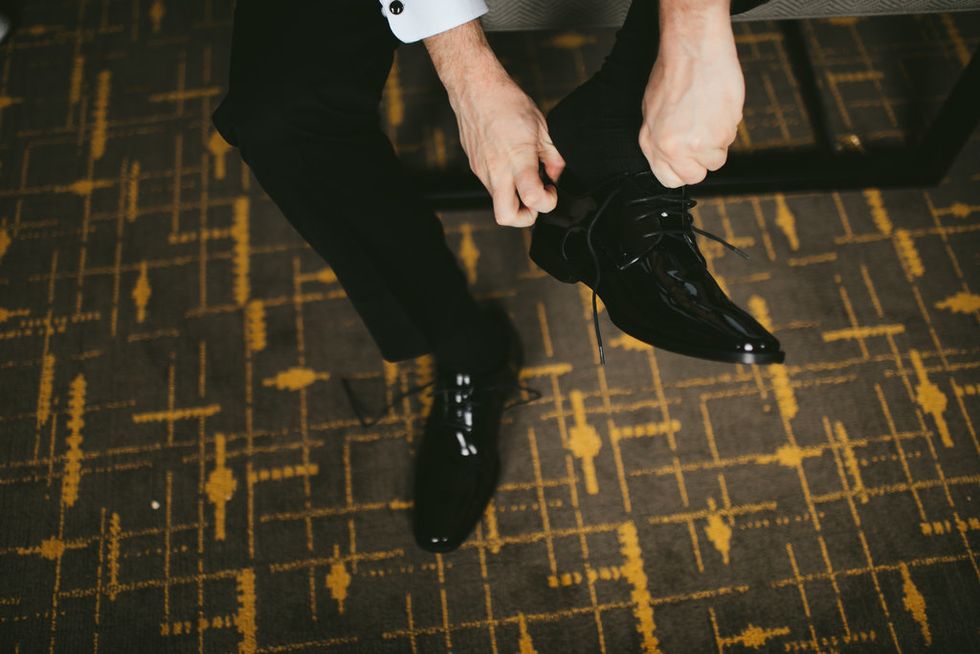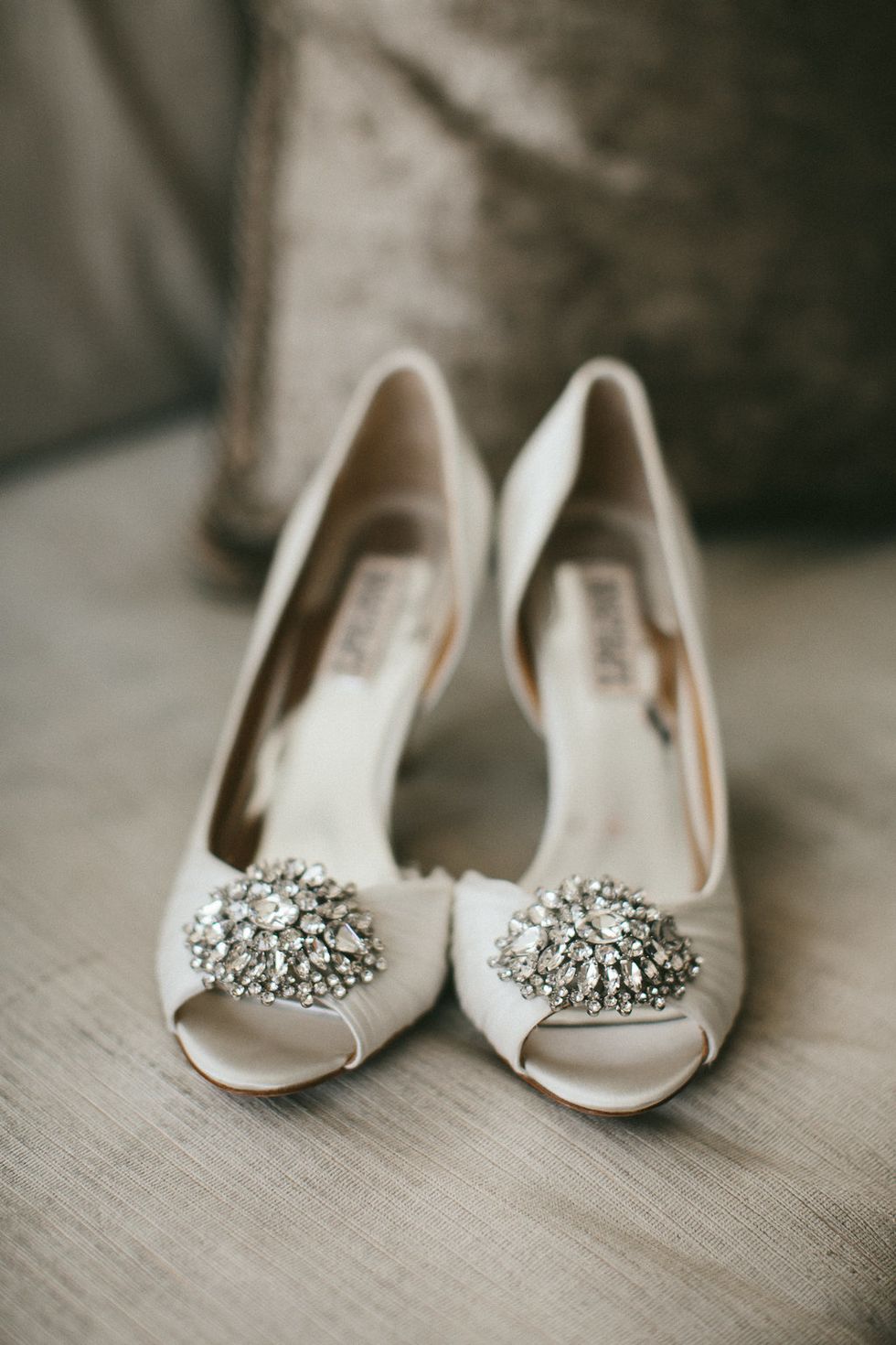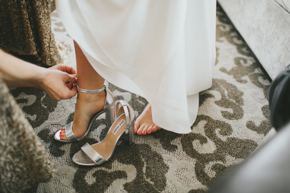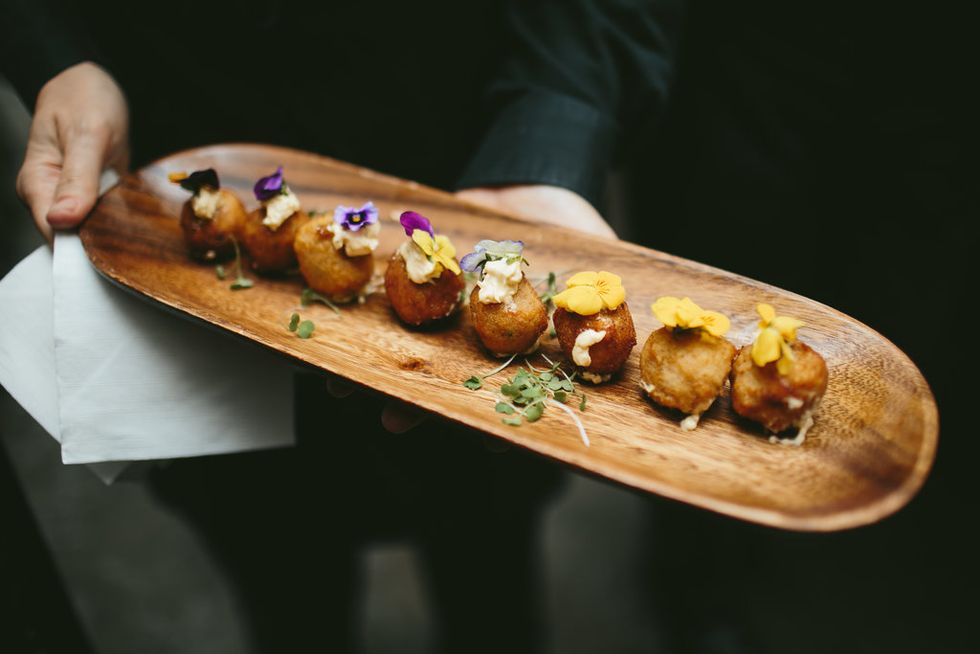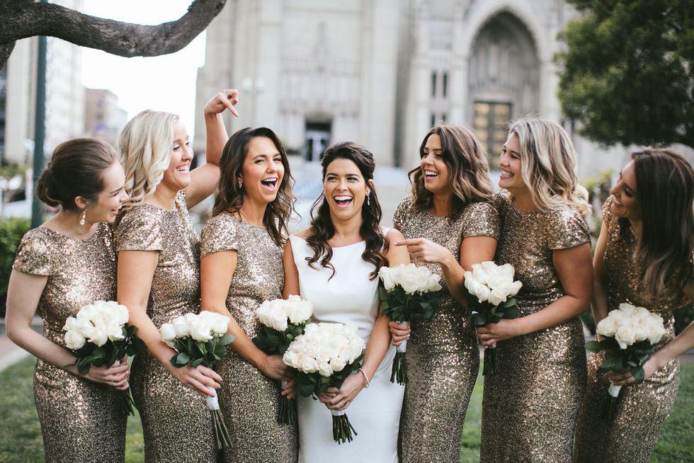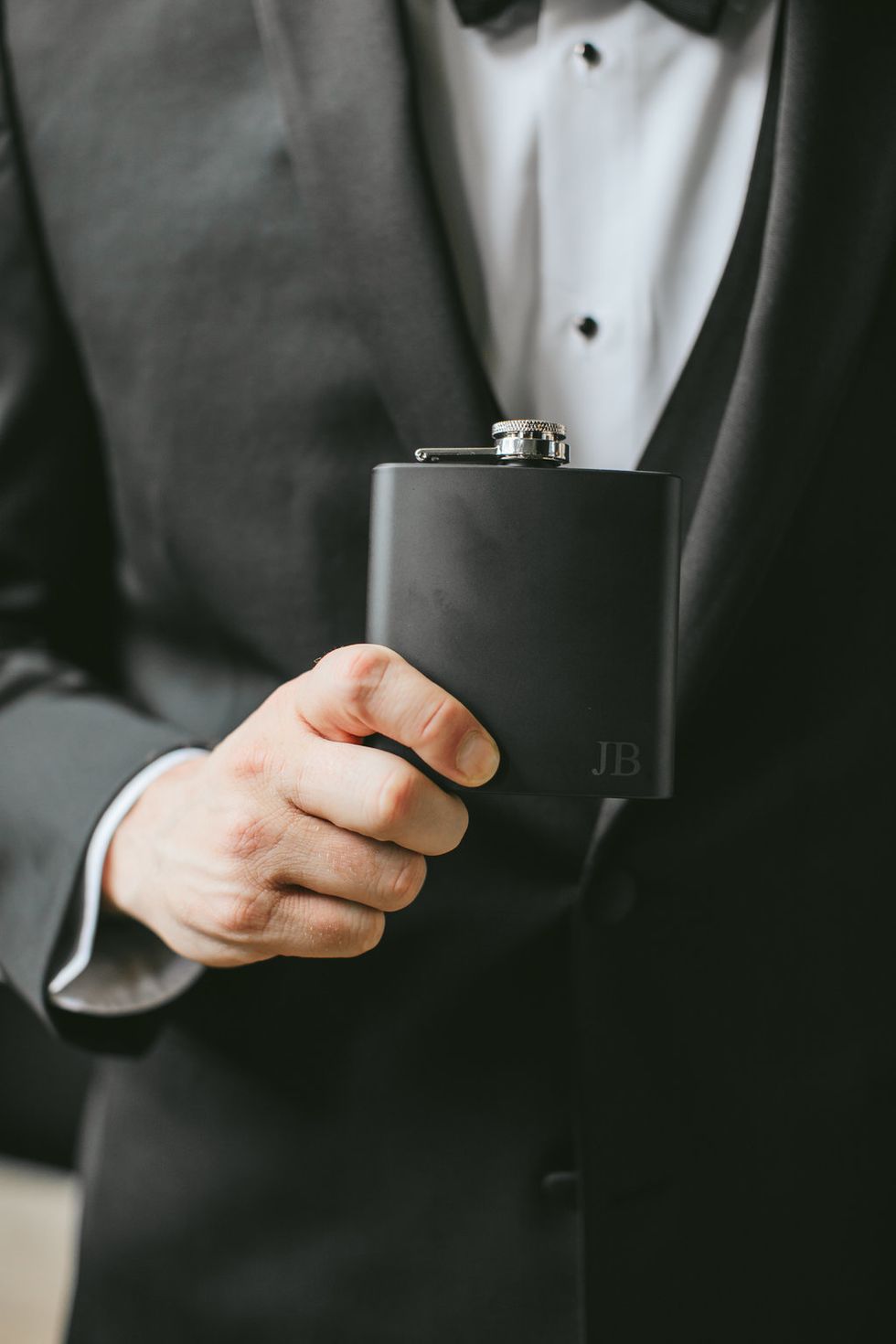 They rolled with the understated, industrial look of the place, seeking to complement its natural woods and unique lighting with lots of fresh green garlands and metallic details. The bridal party's bouquets were simple and chic with a handful of ivory roses. Tea lights in geometric glass containers and monogrammed glasses were speckled across the tables for added warmth. Ball's only two requirements: gold cutlery and donuts.