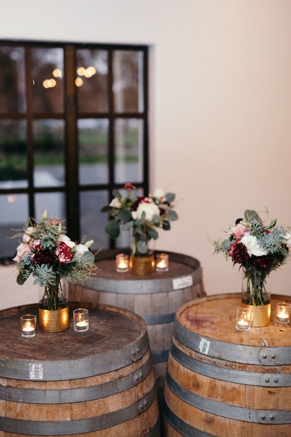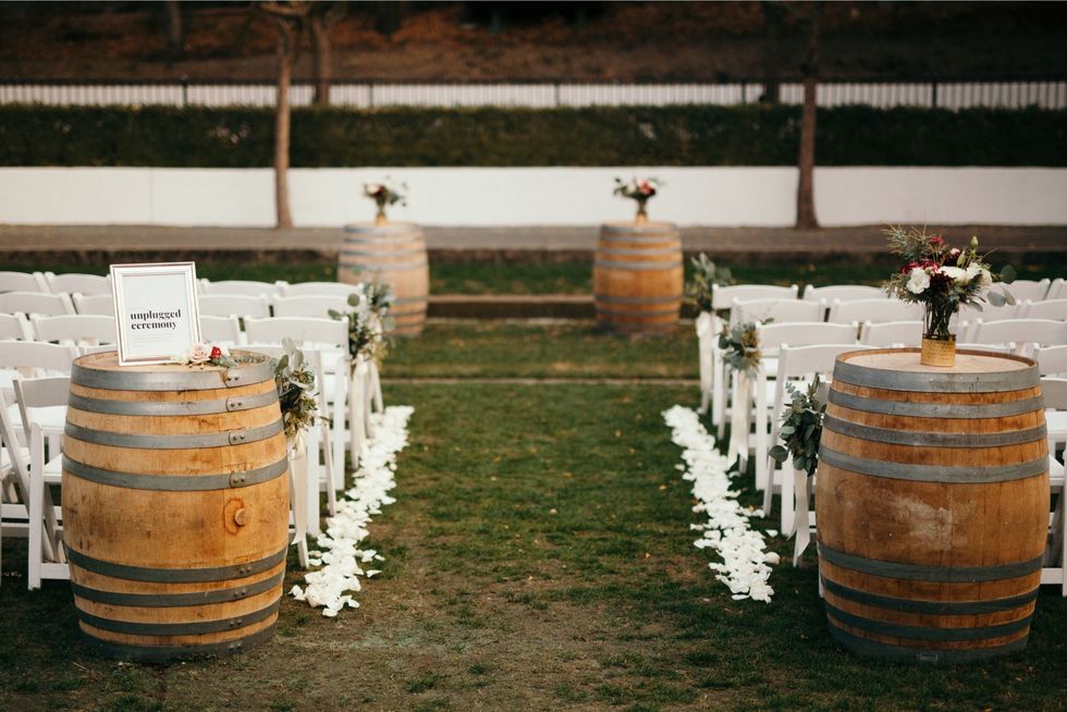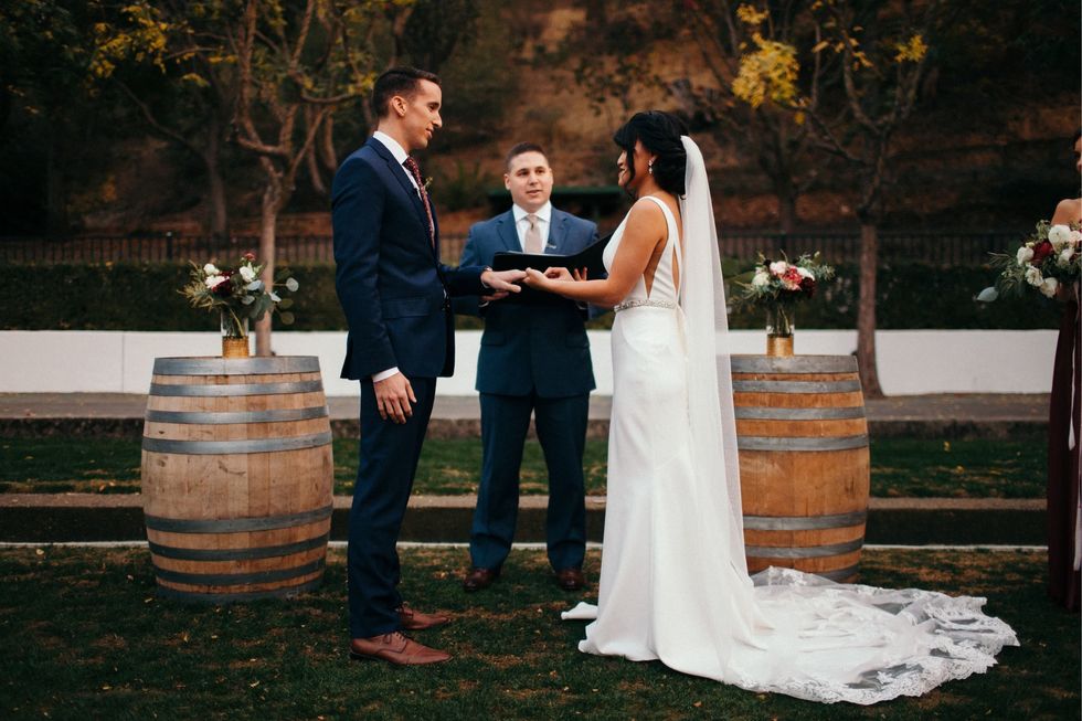 Held at Wente Vineyards in Livermore, the celebration was luxurious. The color palette as navy and wine; the florals burst with deep red and white roses and peonies; and gilded and dramatic black accents added glamorous contrast to rustic wine barrels and wooden chairs. DIY moments appeared in the printed place cards and handmade paper cones for the petal toss, and twinkling lanterns topped the tables at the reception.