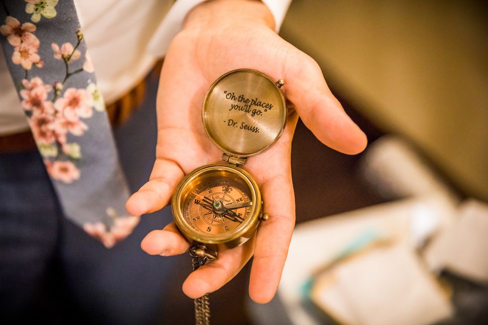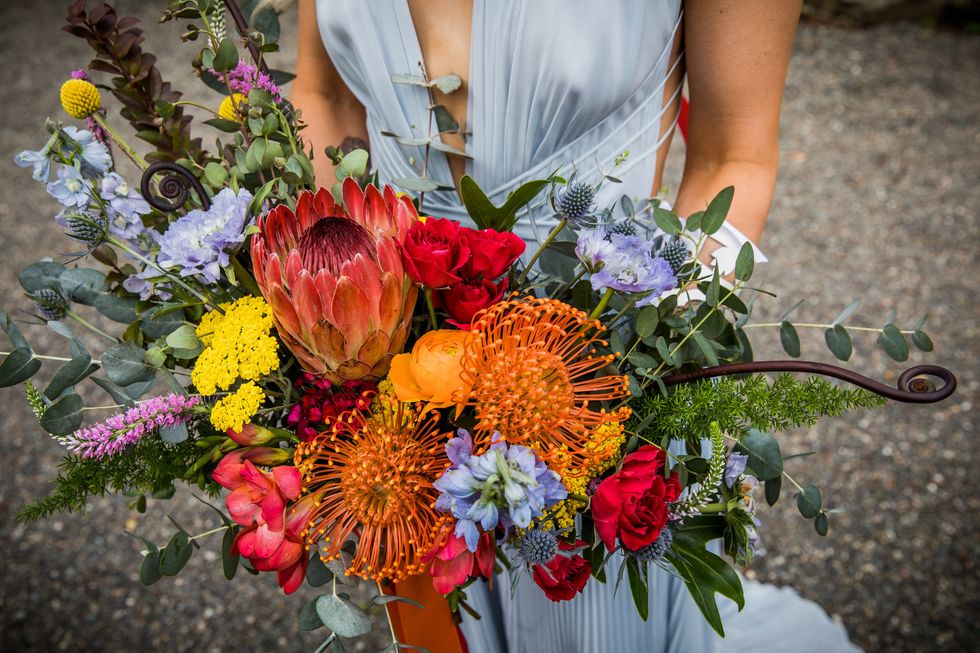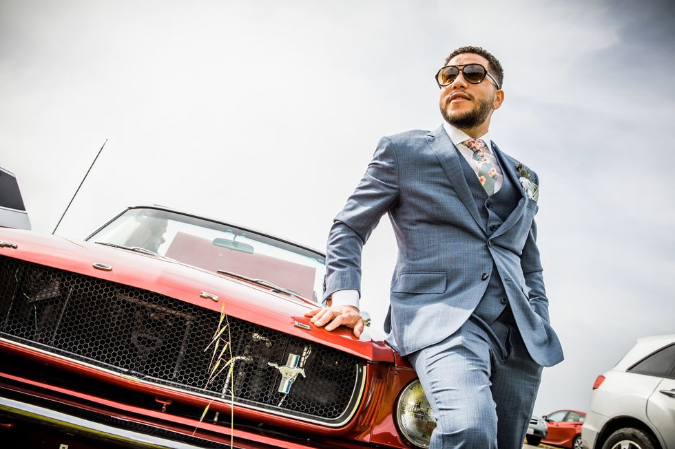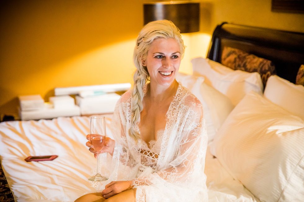 The couple began their wedding day as a couple should: sipping Champagne with their people and exchanging sweet notes and gifts. Then Young changed out of her lace robe and into her Khaleesi-inspired dress—pleated, with a plunging front and ribbon-tied back—designed by Tatyana Merenyuk, and topped her her loose, side swept braid with a flower crown. She carried an eclectic arrangement of exotic florals including dramatic pink and orange protea. Quvus, sharply dressed in a blue checked three-piece suit, sported a floral tie to match his bride.