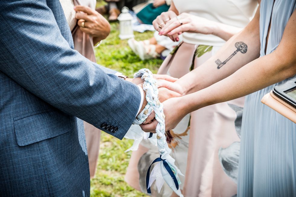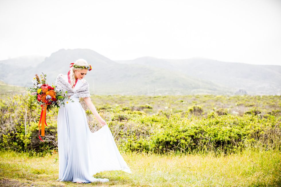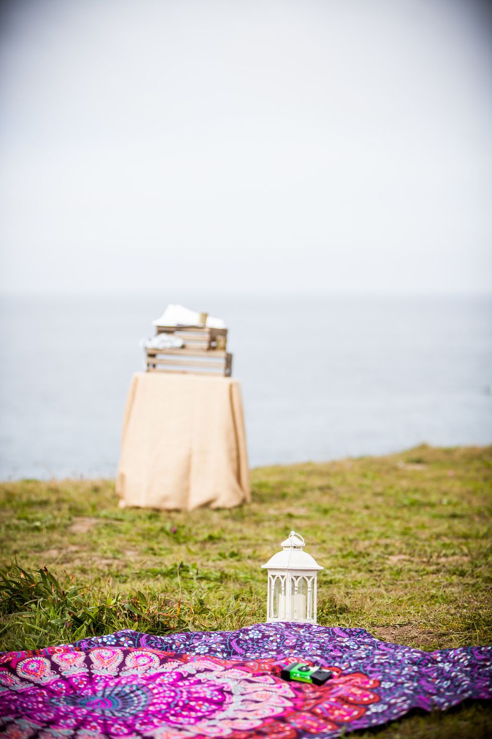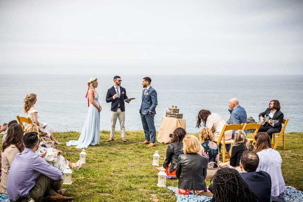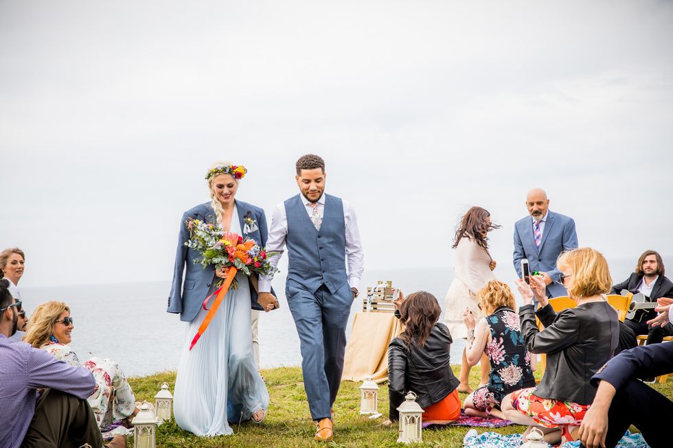 They held a casual ceremony perched on the cliffs overlooking the ocean. To let the setting shine, they opted for no arch—just a simple table with their ceremony items, and blankets and a few chairs for their loved ones. Walking across an eden of blooming florals, the pair had their hands tied together with a braided cloth, read their own vows, and exchanged rings.