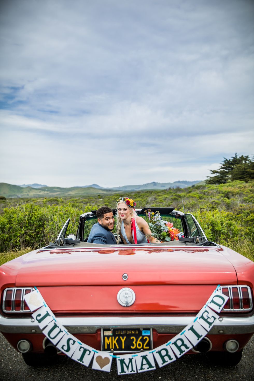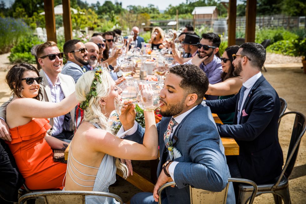 Afterwards, they drove away in their red Mustang convertible, top down with a "Just Married" banner flowing in the wind. Meanwhile, their guests piled into a rented bus for everyone to experience Sonoma's vast countryside and vineyards. Instead of a formal reception, they celebrated at two wineries, toasting to the next chapter in their lives with all of their favorite people.