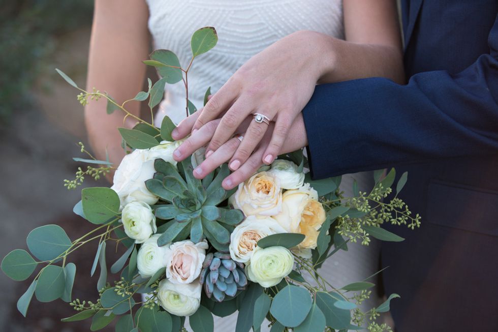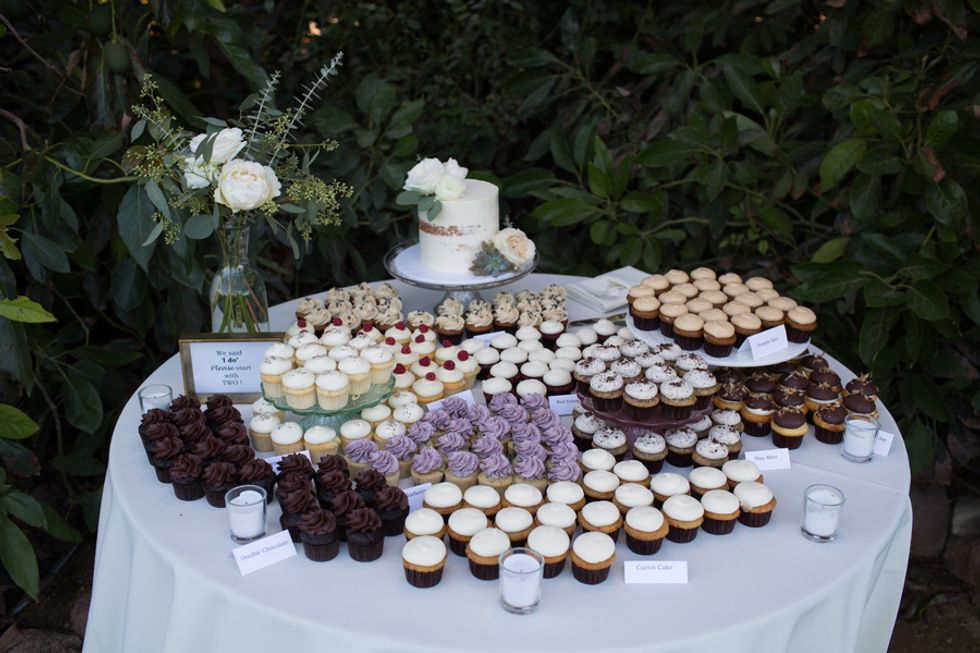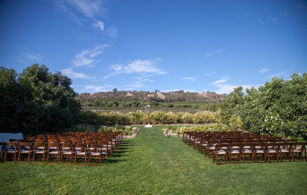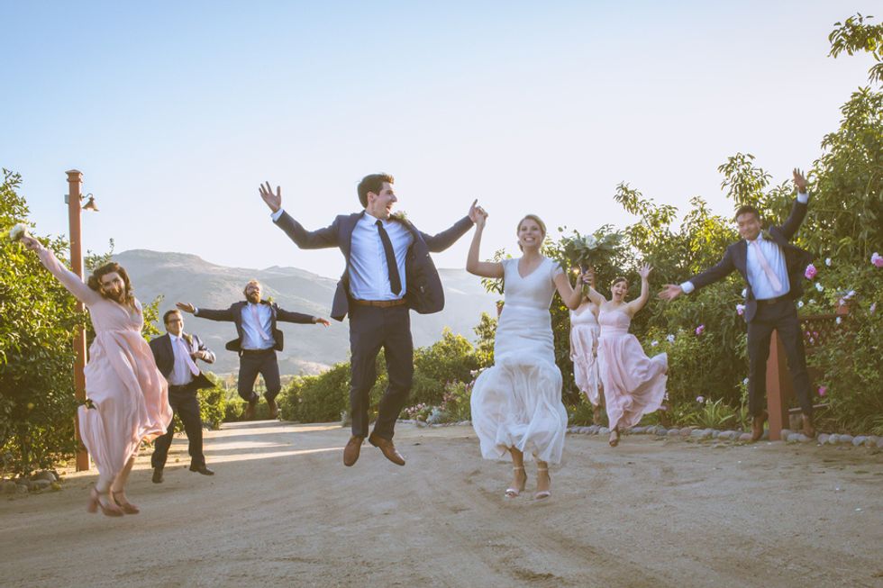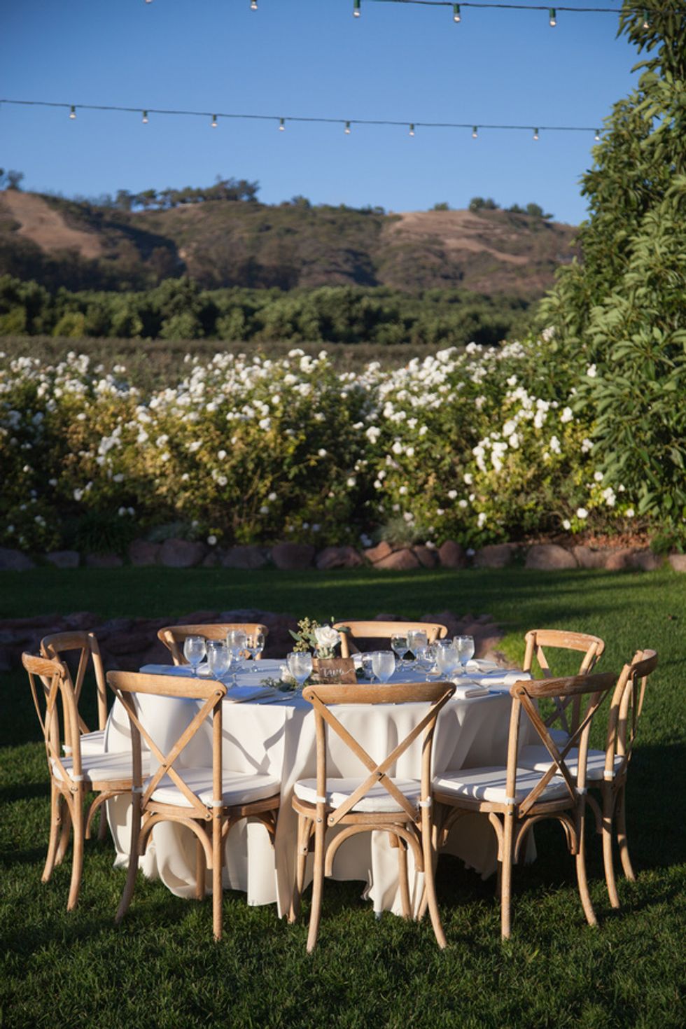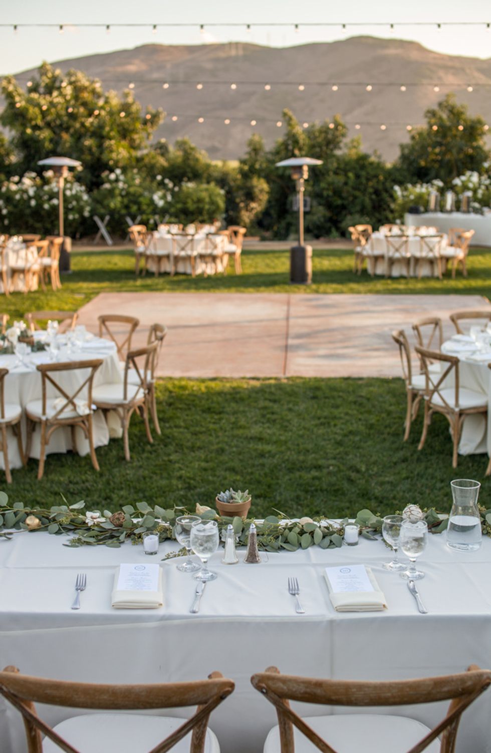 The rows of blueberry bushes and avocado trees at Gerry Ranch in Camarilo, CA were about all the decor that was needed to set a bucolic scene, accented with sweet DIY and earthy elements. At brunch on the Friday morning before the wedding, the bride and her squad ("including my sassy 88-year-old grandmother") made the bouquets and centerpieces together—romantic arrangements of ranunculus, roses, sage greens, and succulents. "They were my proudest DIY wedding element," she recalls.