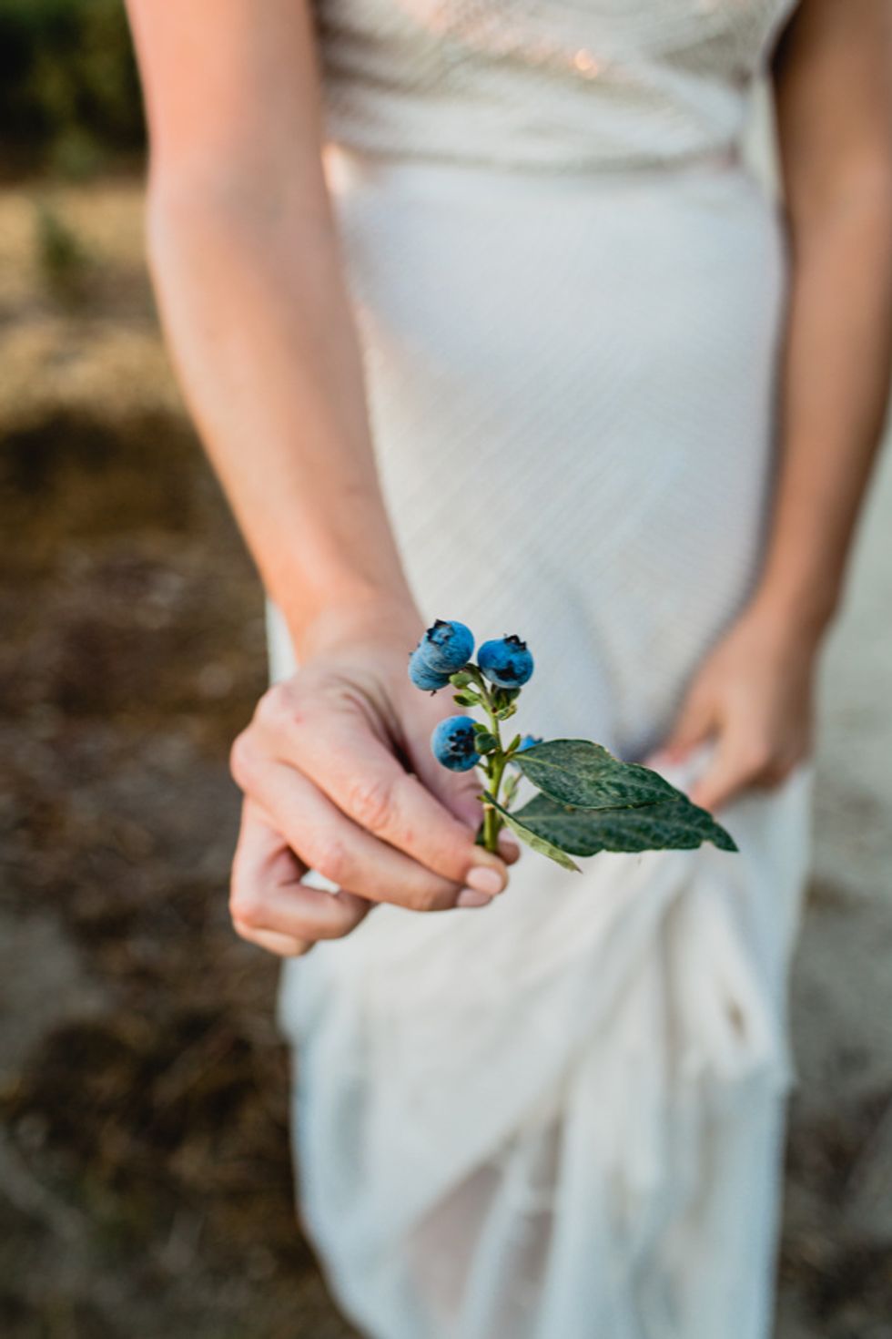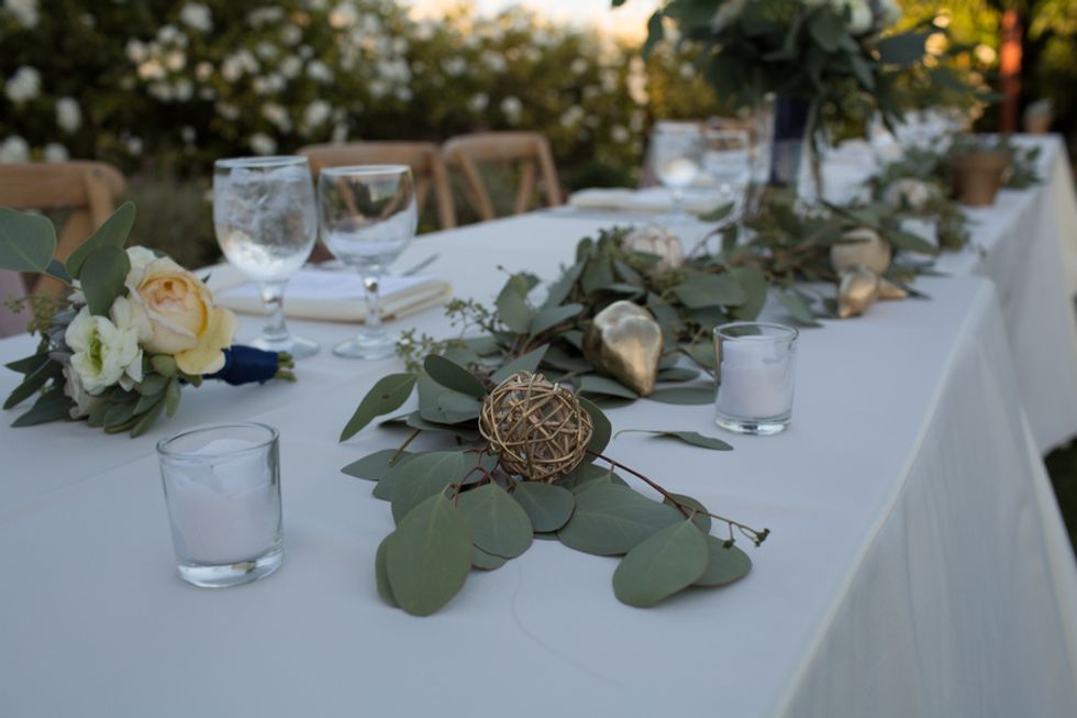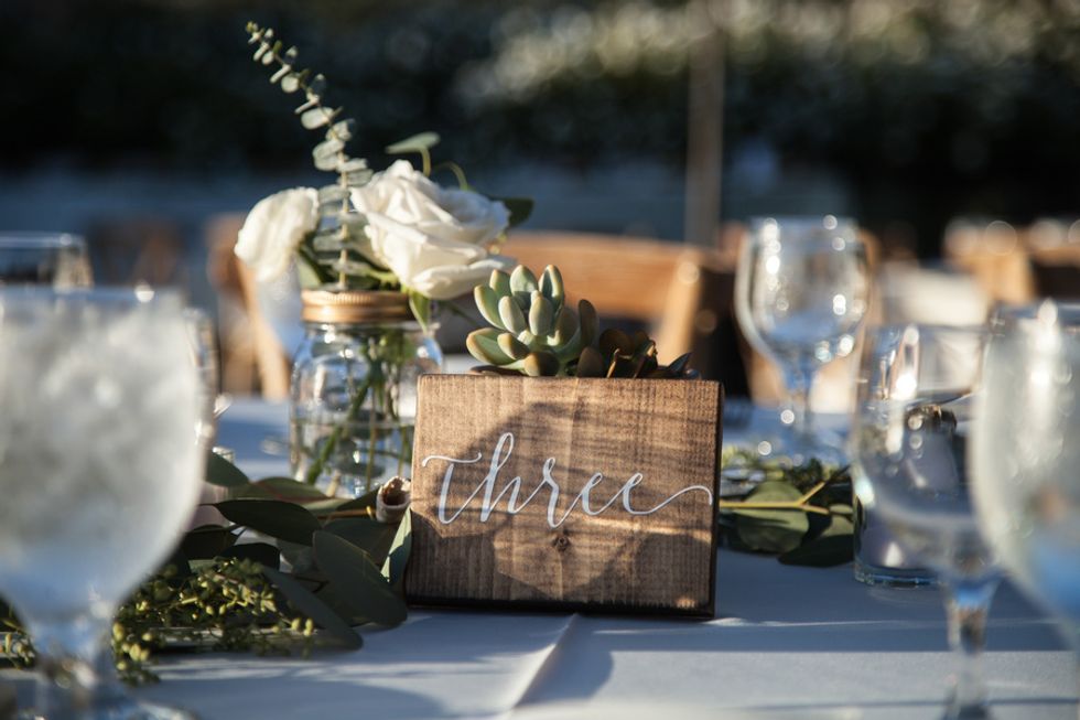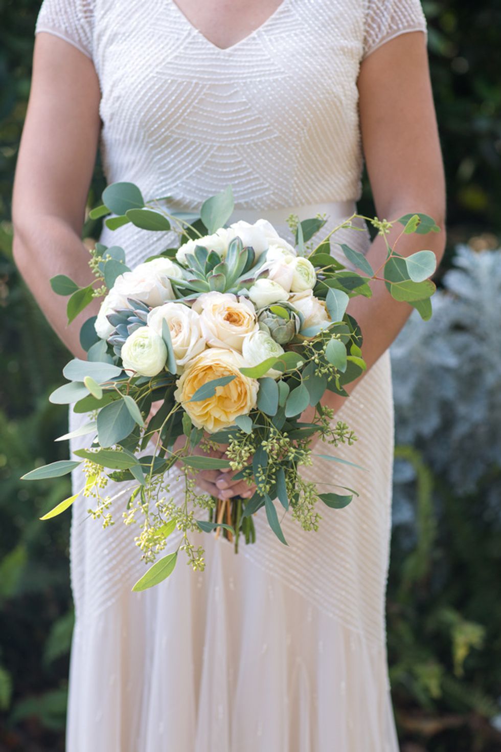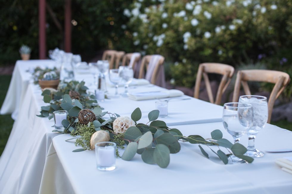 The rows of blueberry bushes and avocado trees at Gerry Ranch in Camarilo, CA were about all the decor that was needed to set a bucolic scene, accented with sweet DIY and earthy elements. At brunch on the Friday morning before the wedding, the bride and her squad ("including my sassy 88-year-old grandmother") made the bouquets and centerpieces together—romantic arrangements of ranunculus, roses, sage greens, and succulents. "They were my proudest DIY wedding element," she recalls.