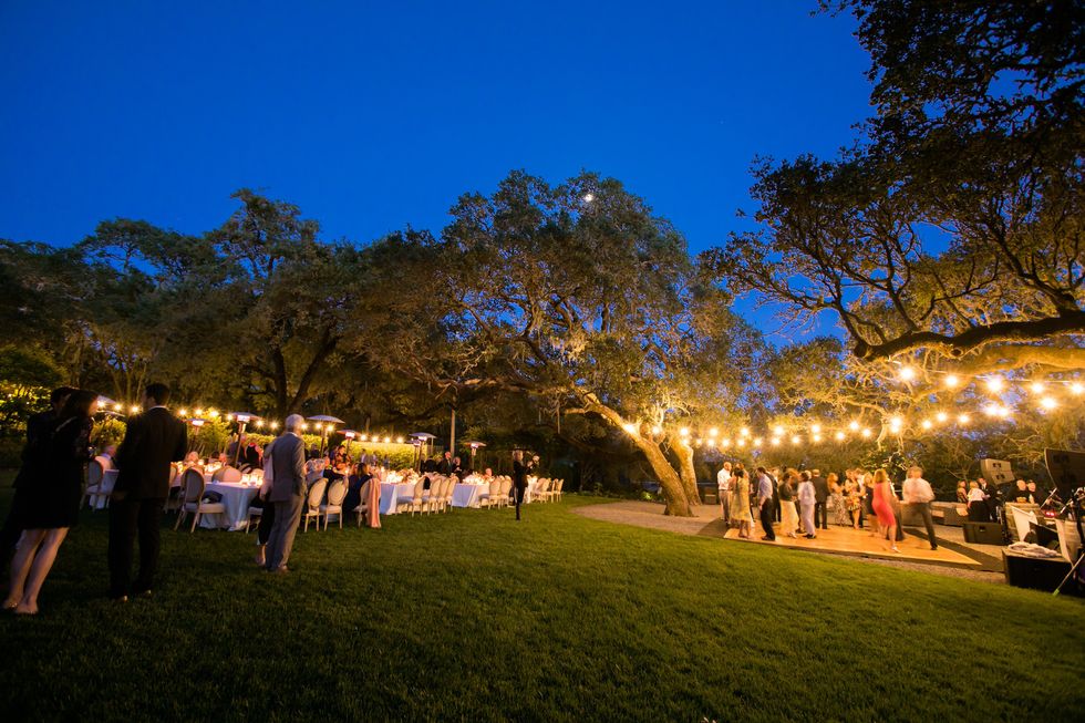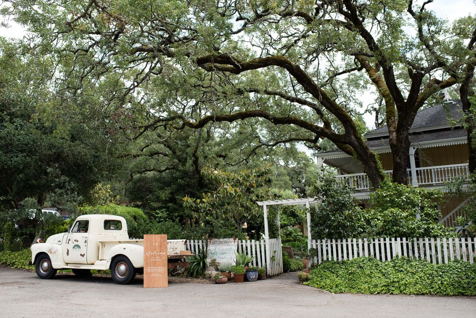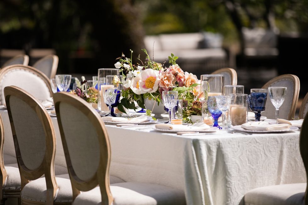 They added minimal decor—lush spring florals in blush and ivory with a splash of crimson; rustic signs hand-painted with the couple's favorite quotes; and beautifully carved wooden chairs. The arch was an open, copper frame with delicate white blooms woven throughout, tucked beneath a sweeping oak tree. At the reception, rectangular tables were covered with luxurious textured linens and topped with Theoni dinnerware.
