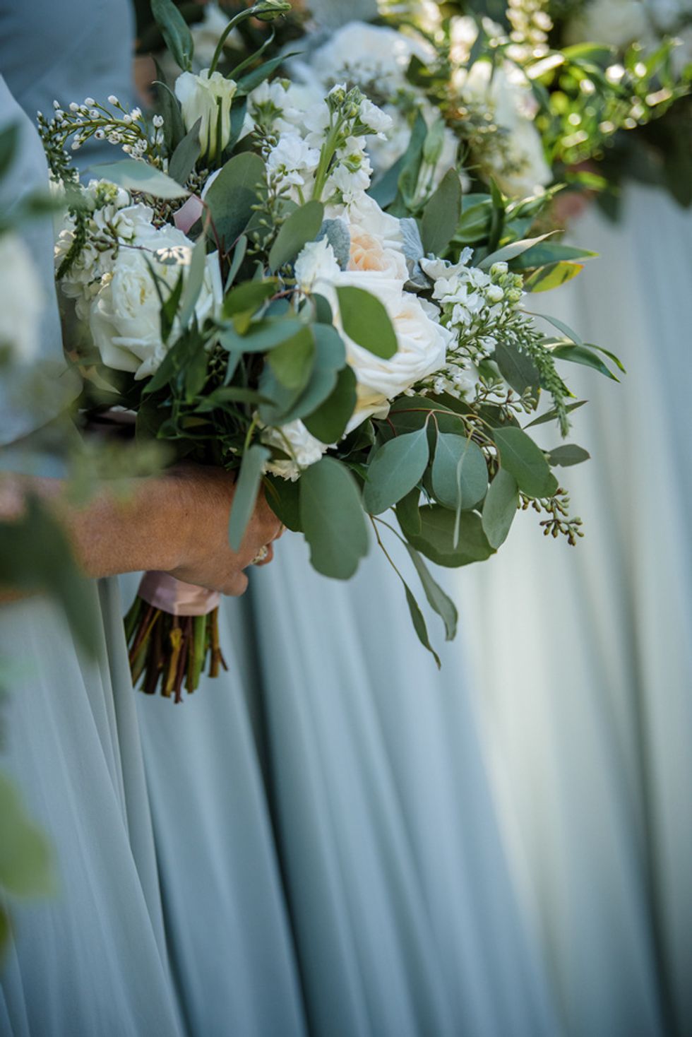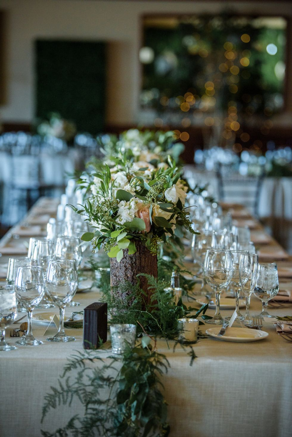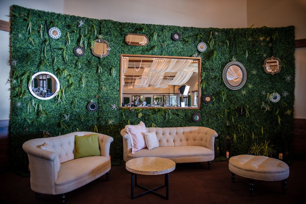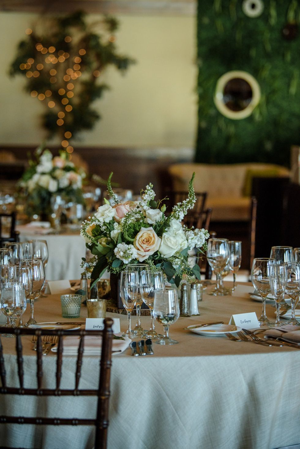 Naturally the flowers were fall themed. They used autumn-colored gerbera daisies, mini white daisies and red/orange roses for their rehearsal dinner. The wedding and reception colors were seafoam, light pink and ivory, so bouquets included roses, eucalyptus, and some succulents. To create a romantic, outdoor ambiance, the ceremony backdrop was a natural birch arch with matching florals. Draping, hedges, a live wall with greenery, and additional lighting were added to set the mood.