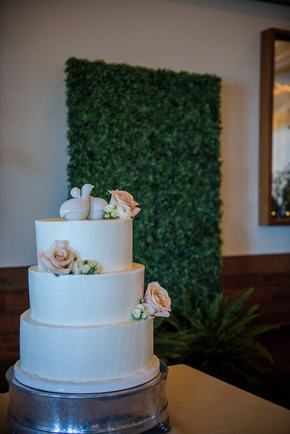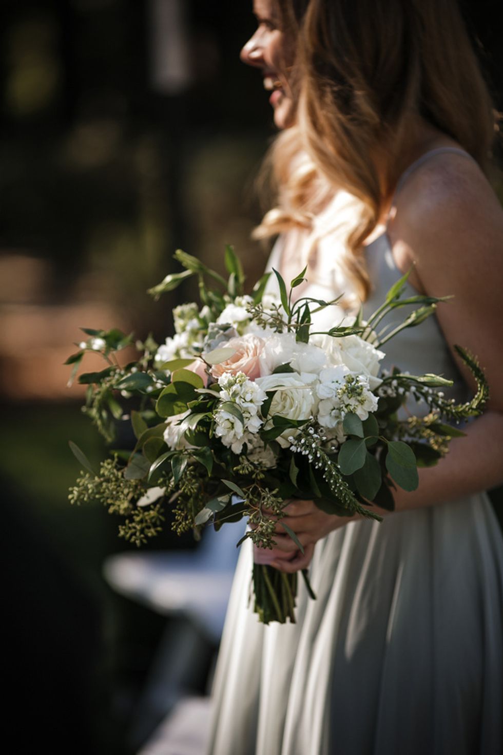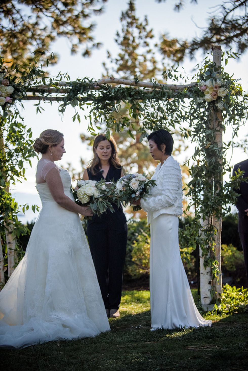 Naturally the flowers were fall themed. They used autumn-colored gerbera daisies, mini white daisies and red/orange roses for their rehearsal dinner. The wedding and reception colors were seafoam, light pink and ivory, so bouquets included roses, eucalyptus, and some succulents. To create a romantic, outdoor ambiance, the ceremony backdrop was a natural birch arch with matching florals. Draping, hedges, a live wall with greenery, and additional lighting were added to set the mood.